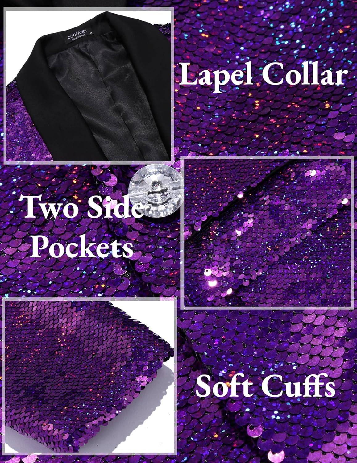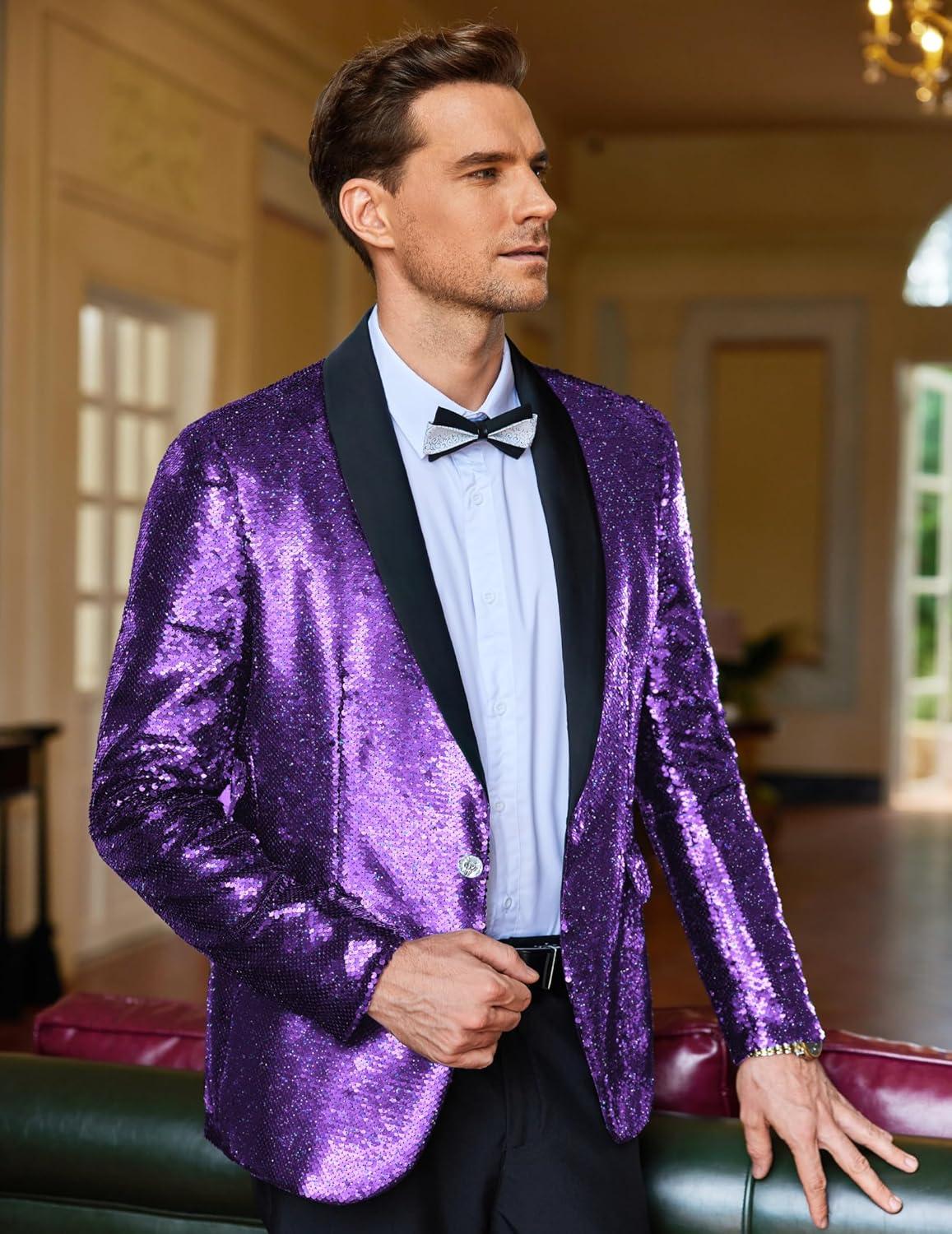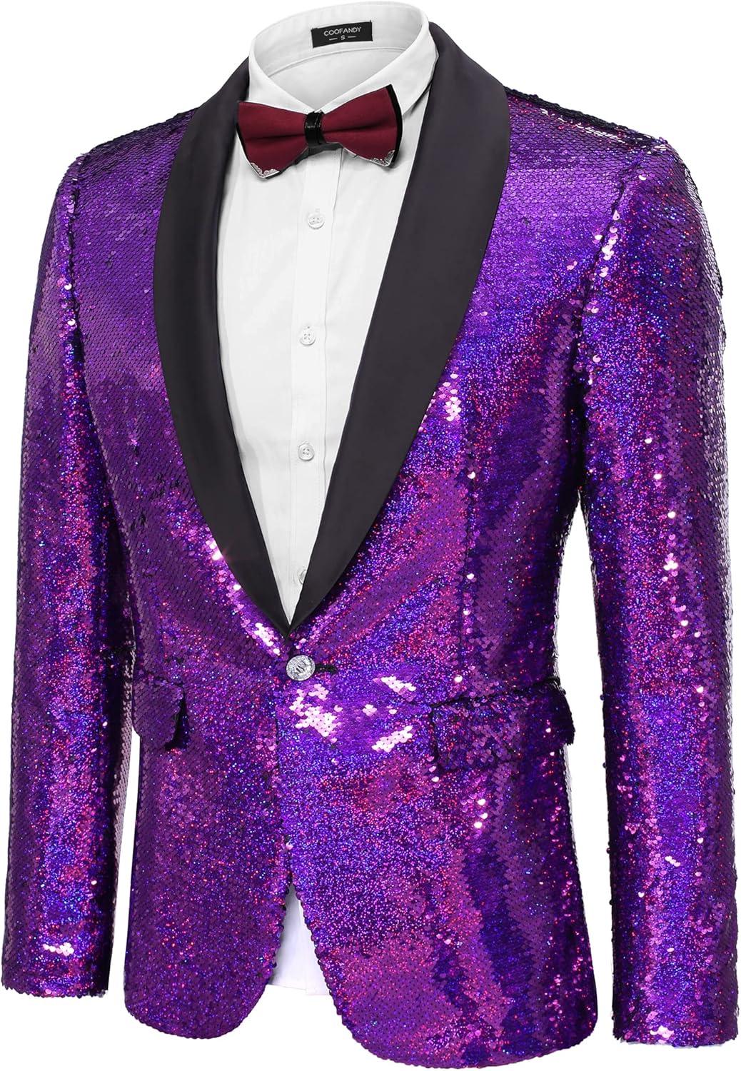 COOFANDY Mens Shiny Sequin Blazer Tuxedo Party Dinner Prom One Button Suit Jacket(Purple)