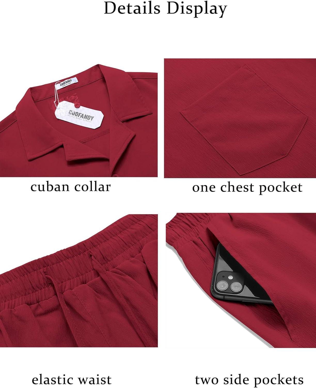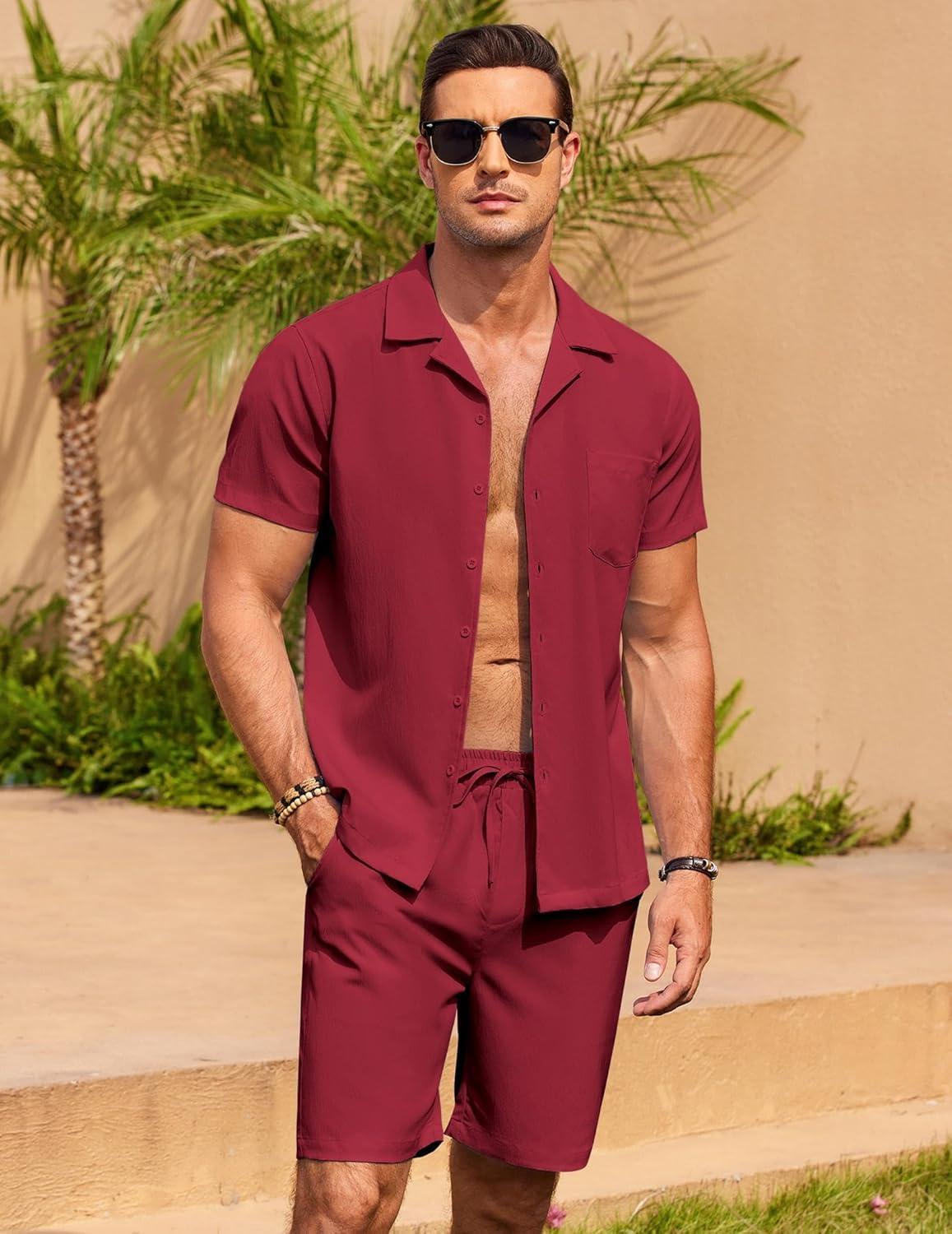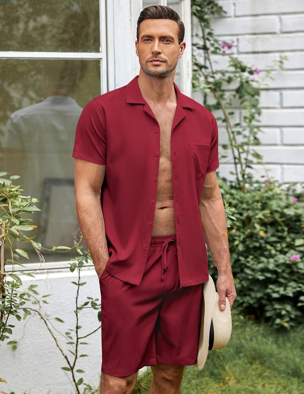 COOFANDY Mens Short Sets 2 Piece Summer Beach Outfits Short Sleeve Shirts and Shorts Sets for Men(Crimson)