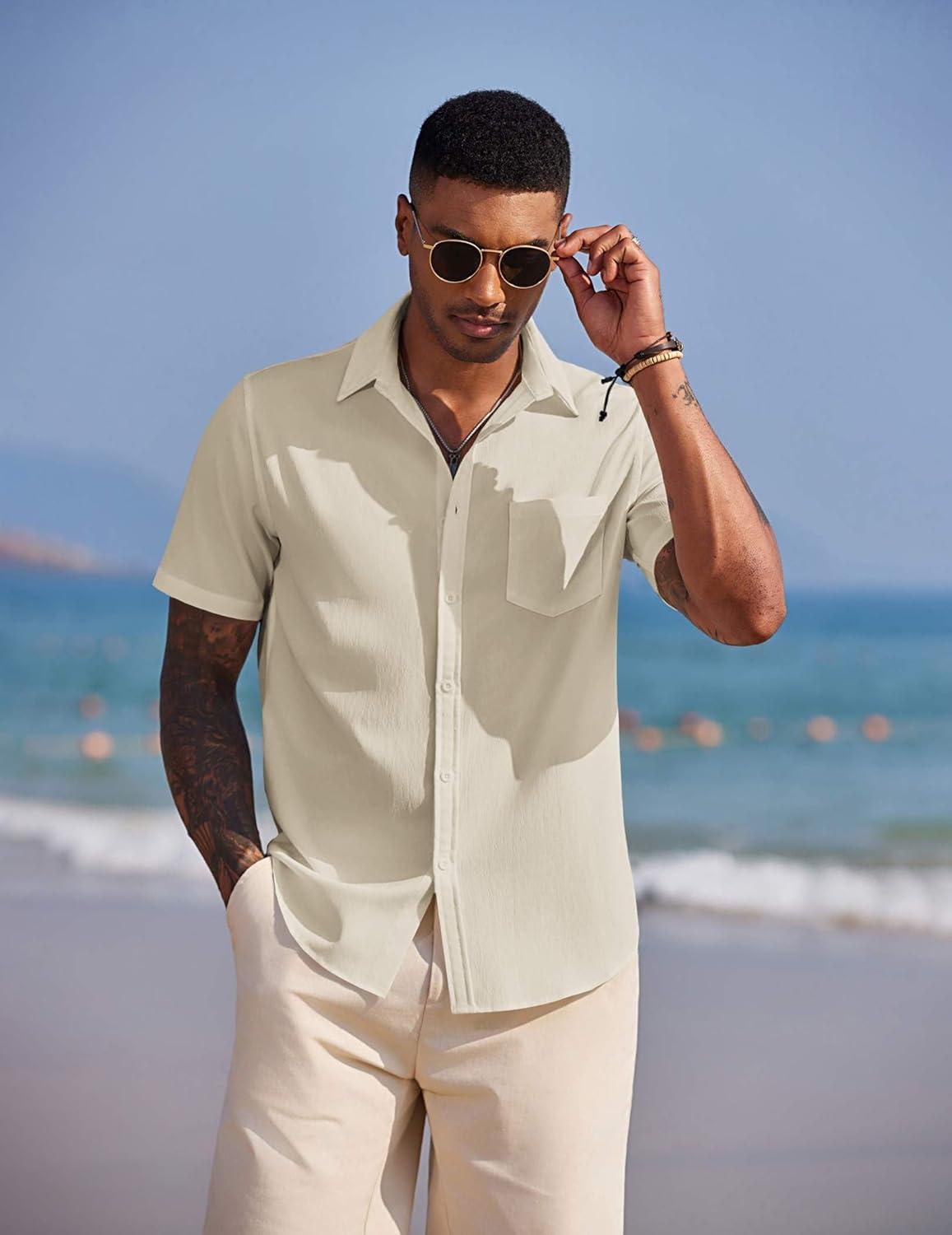 COOFANDY Men’s Short Sleeve Button Down Casual Beach Shirt(Vanilla Ice)
