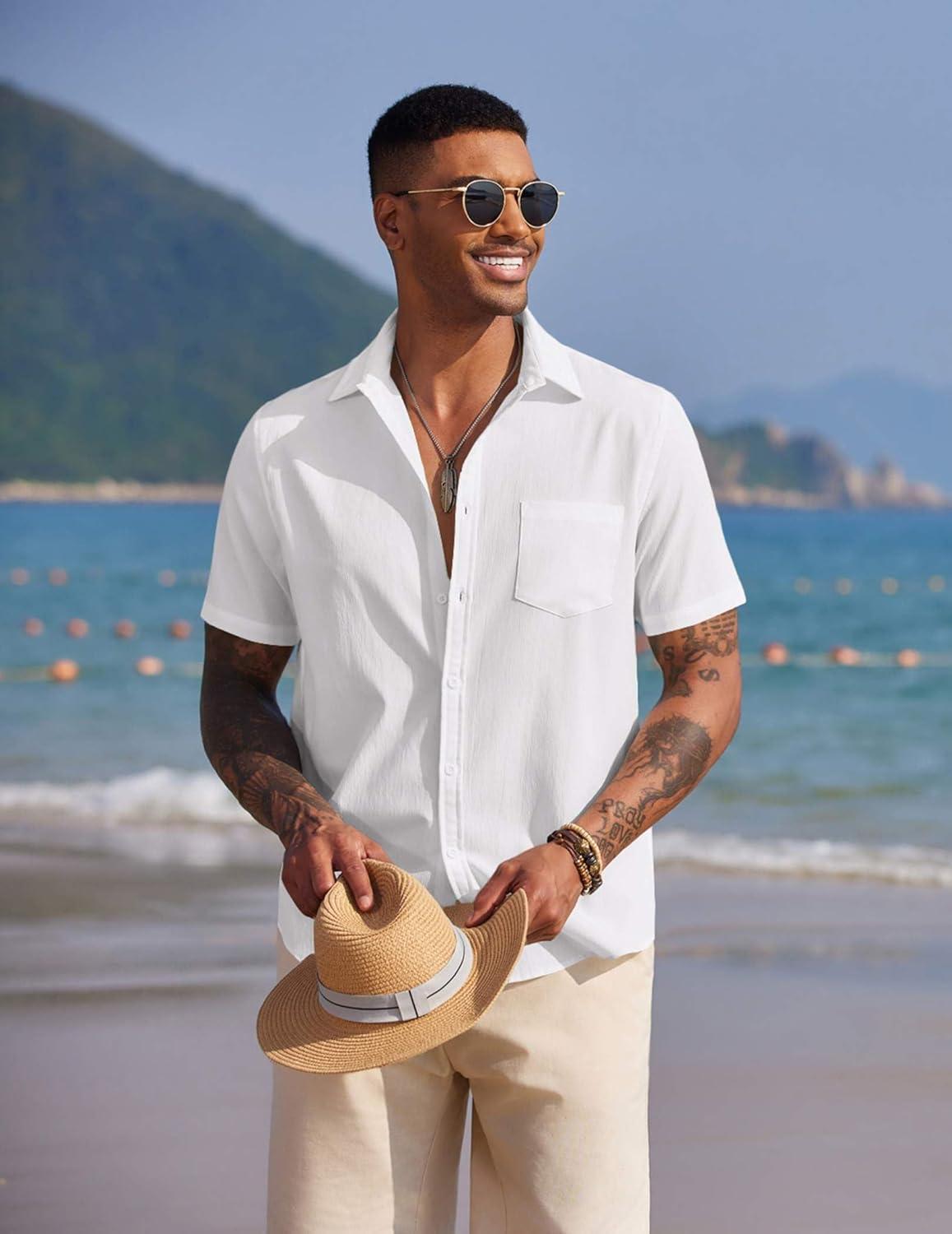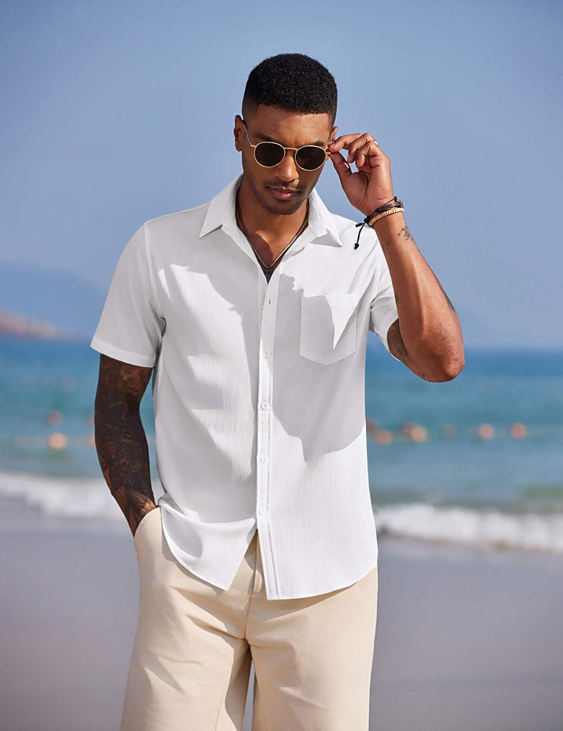 COOFANDY Men’s Short Sleeve Button Down Casual Beach Shirt(White)