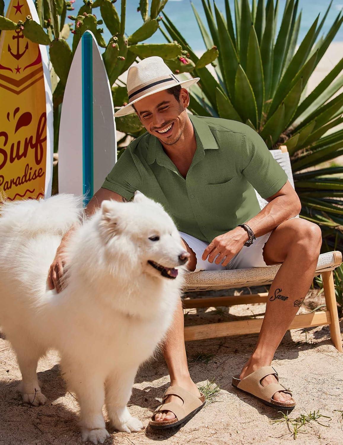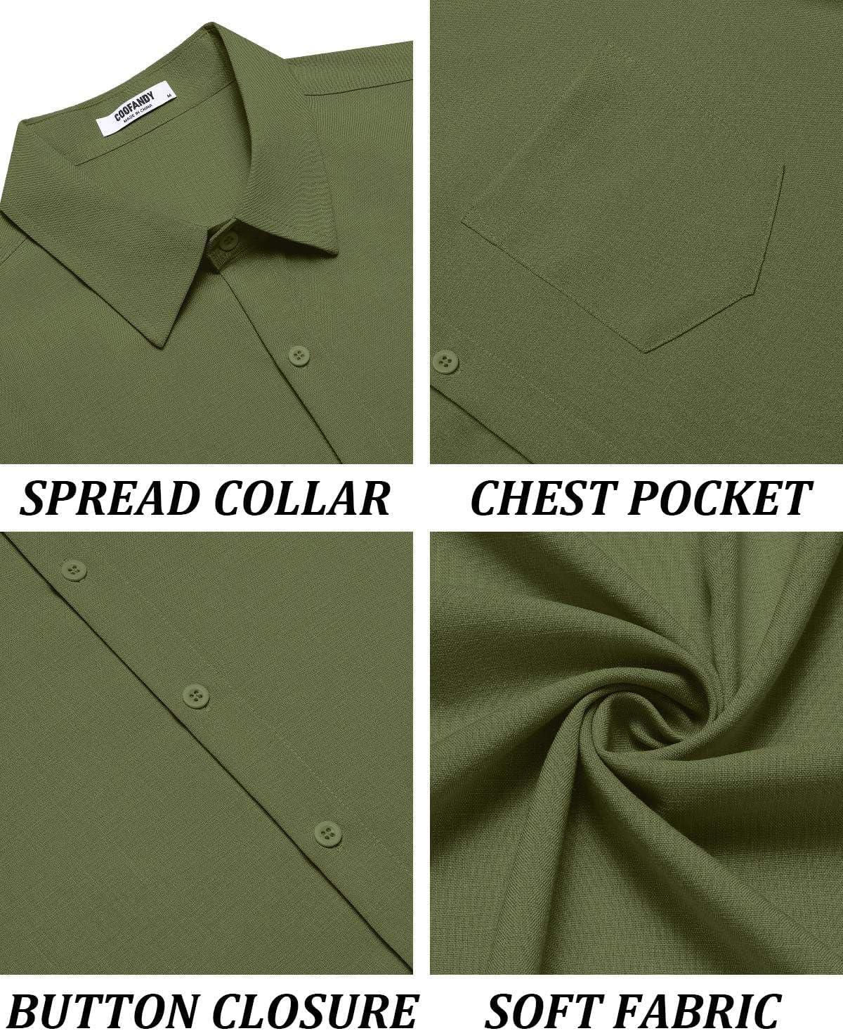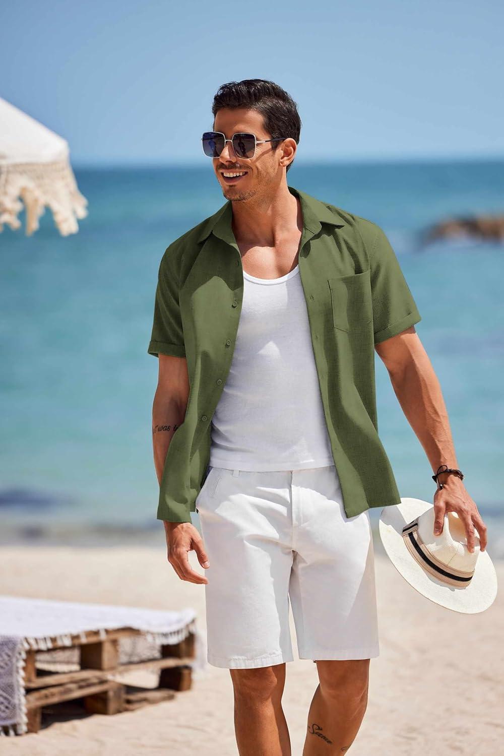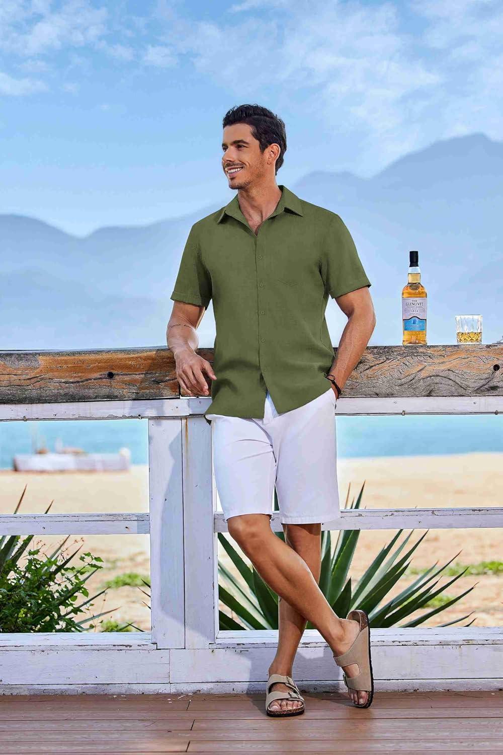 COOFANDY Men’s Short Sleeve Button Down Shirt Casual Linen Shirts Summer Beach Vacation Shirt with Pocket(Army Green)