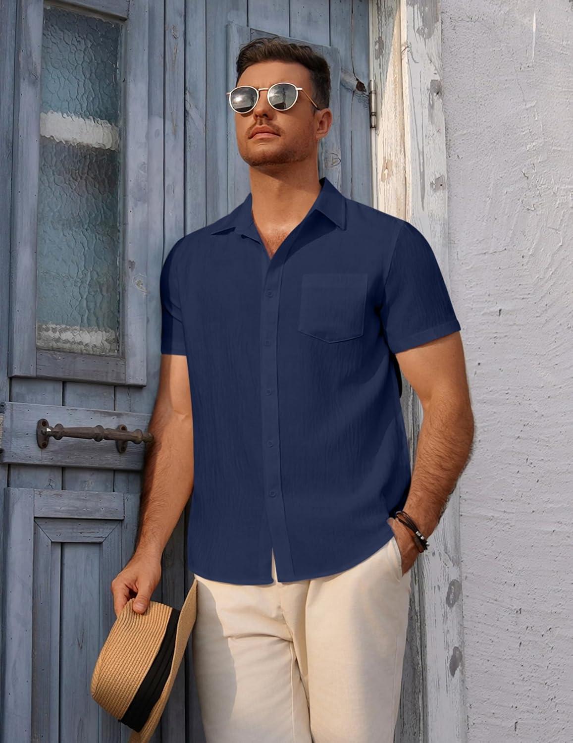 COOFANDY Men’s Short Sleeve Button Down Shirt Casual Summer Beach Untucked Vacation Textured Shirts with Pocket(Black Iris)