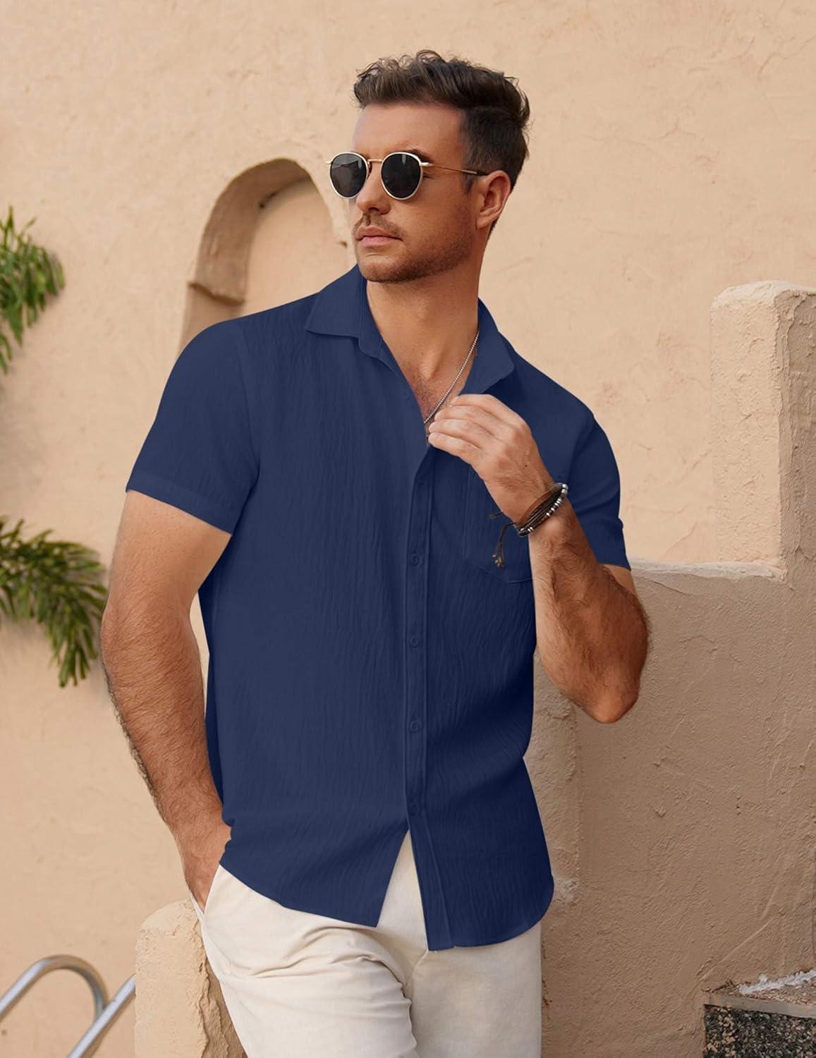 COOFANDY Men's Short Sleeve Button Down Shirt Casual Summer Beach Untucked Vacation Textured Shirts with Pocket(Black Iris)