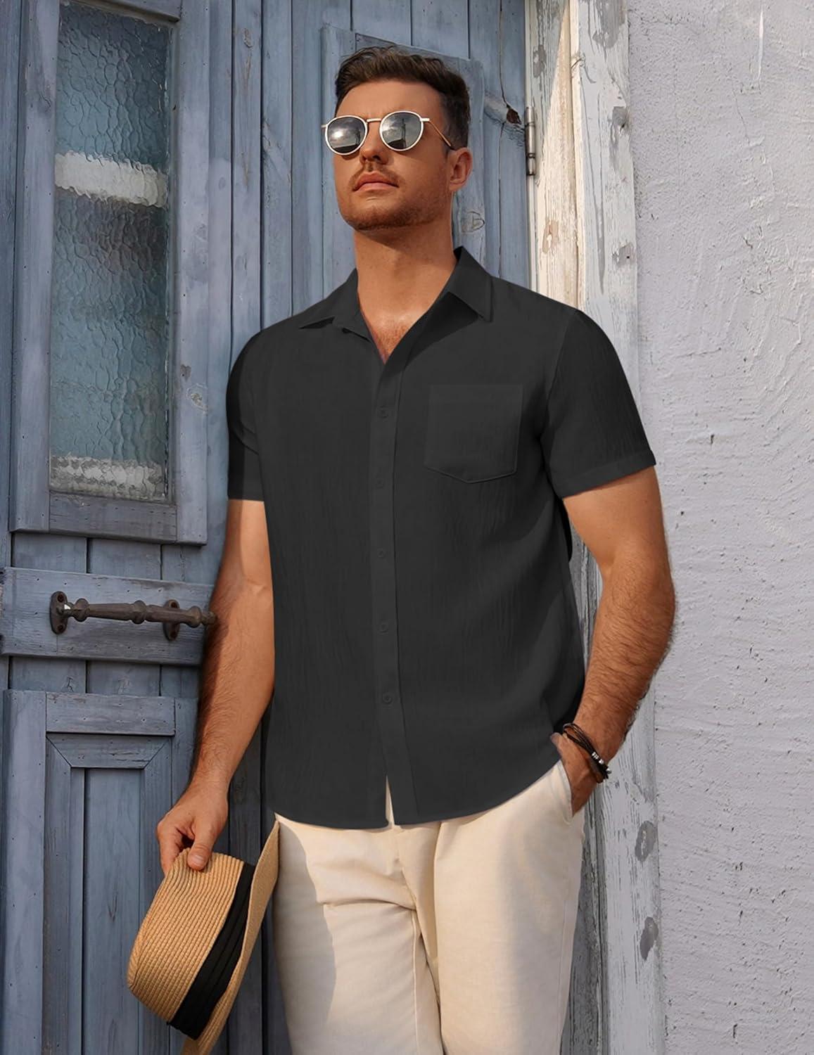 COOFANDY Men’s Short Sleeve Button Down Shirt Casual Summer Beach Untucked Vacation Textured Shirts with Pocket(Black Onyx)