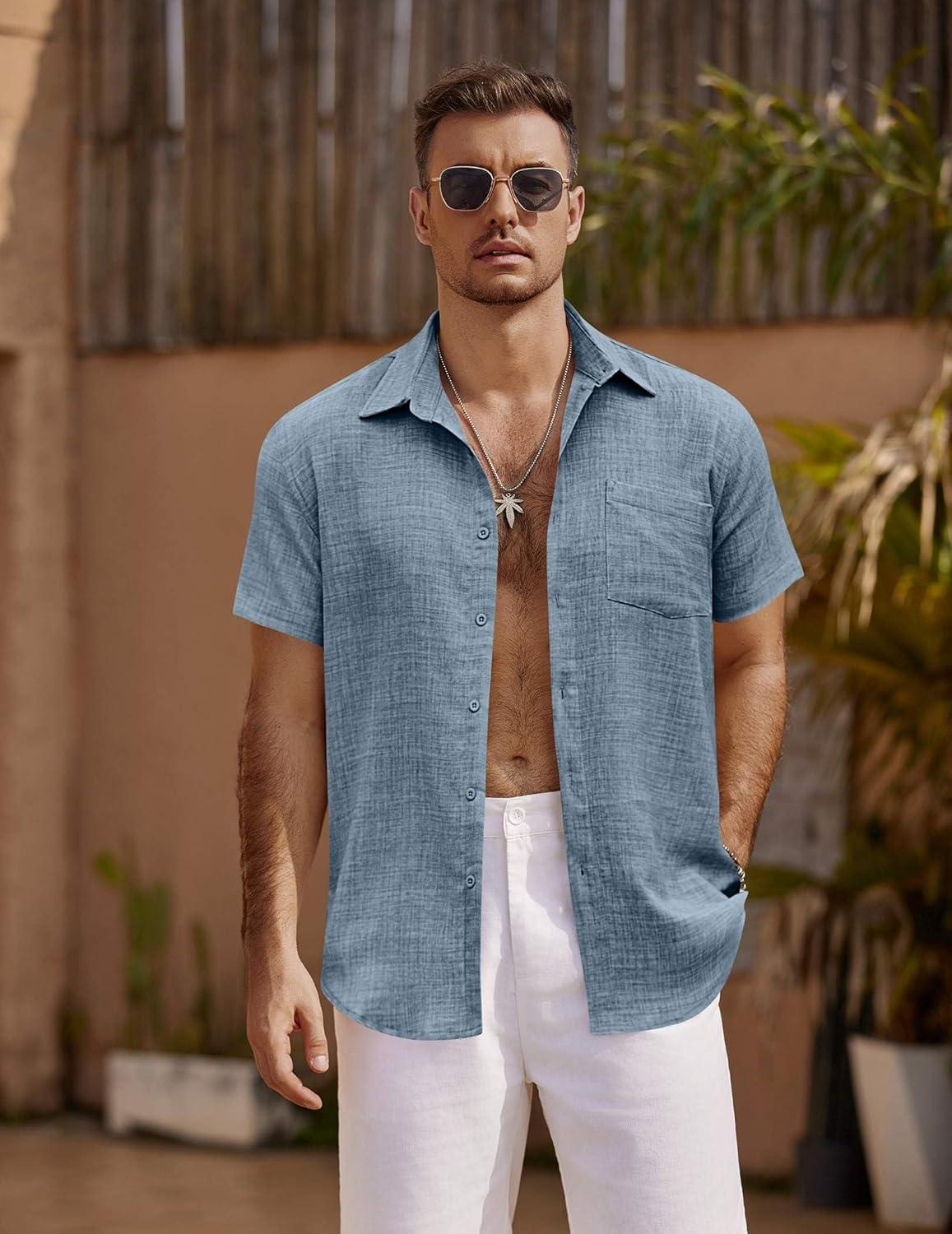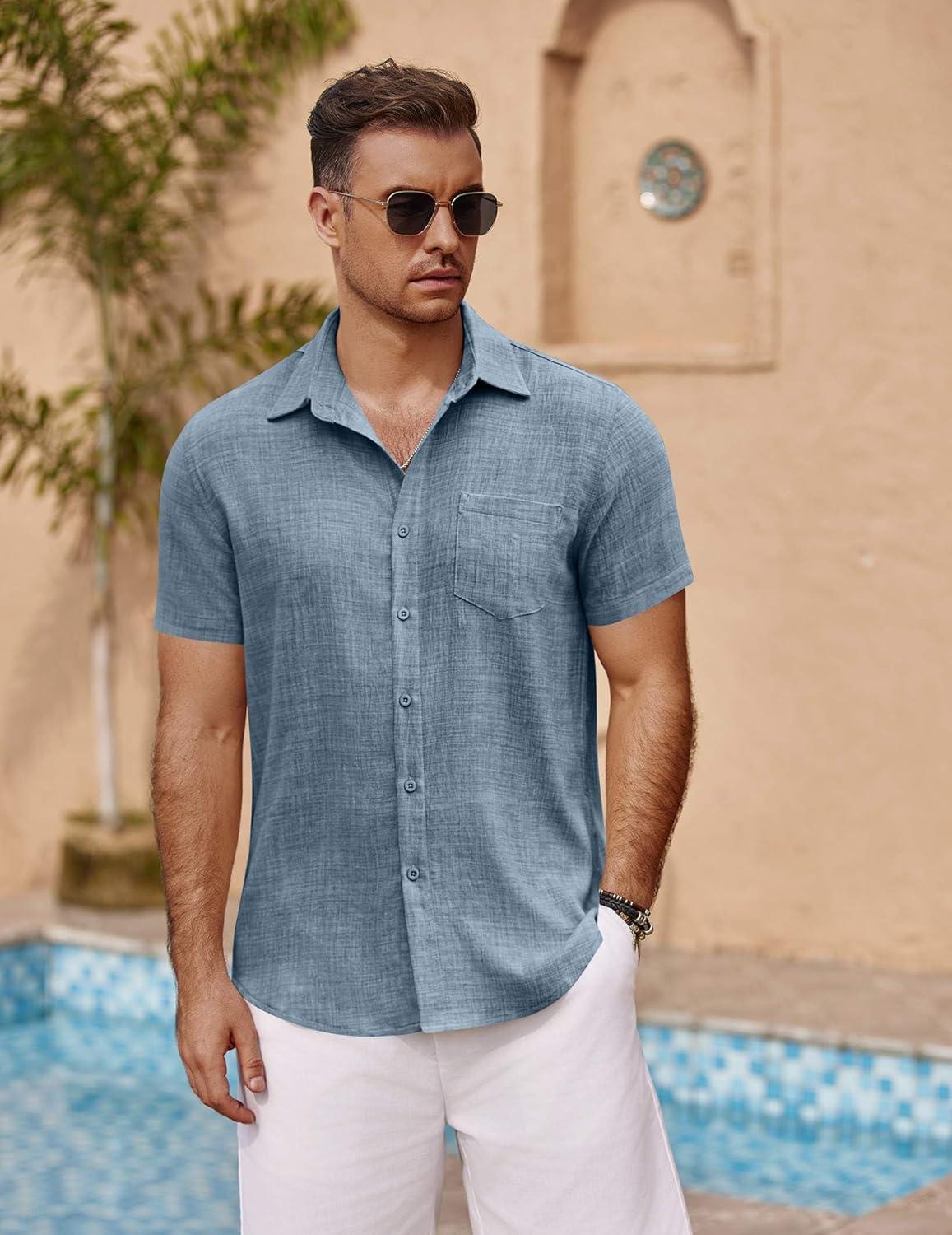 COOFANDY Men’s Short Sleeve Button Down Shirt Casual Summer Beach Untucked Vacation Textured Shirts with Pocket(Quiet Gray)