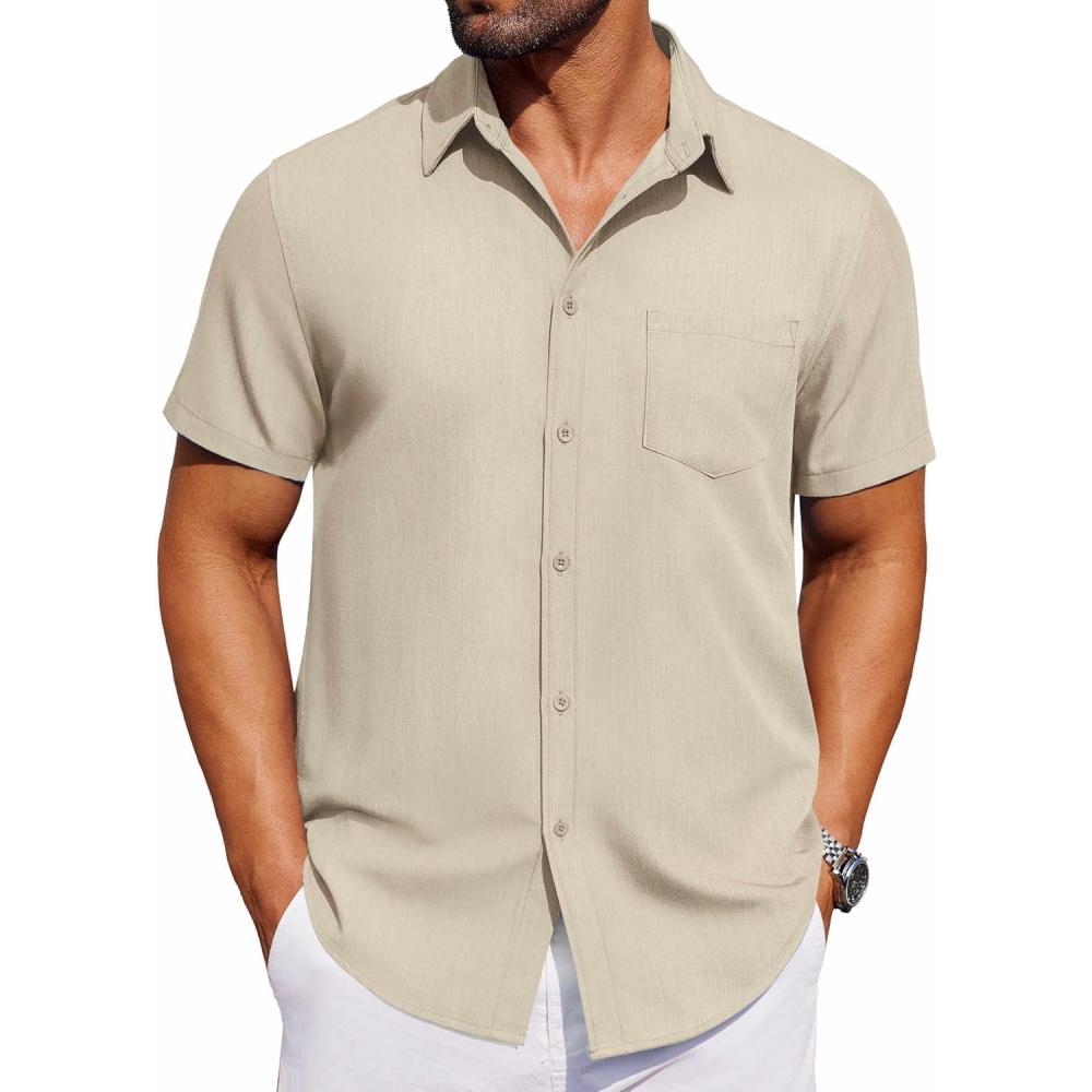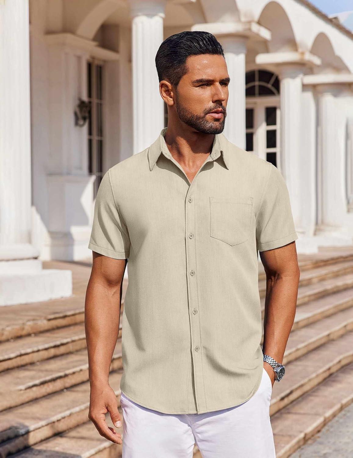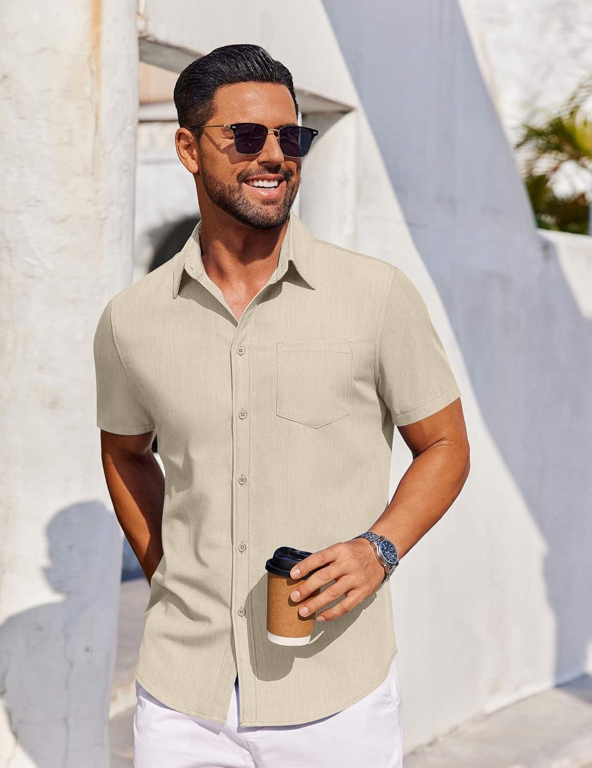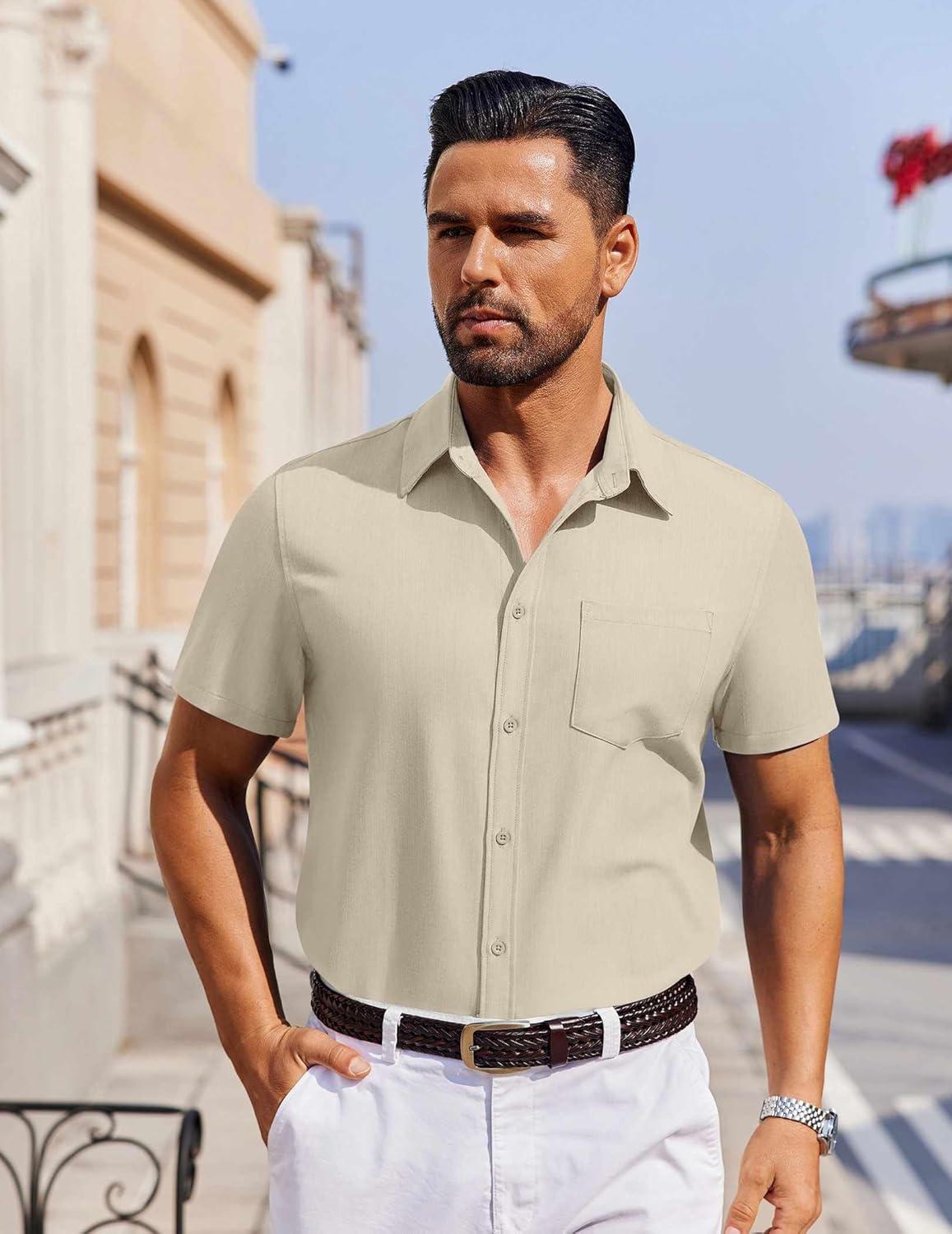 COOFANDY Men’s Short Sleeve Button Down Shirt Casual Untucked Dress Shirt Stretch Denim Shirt(Beige)