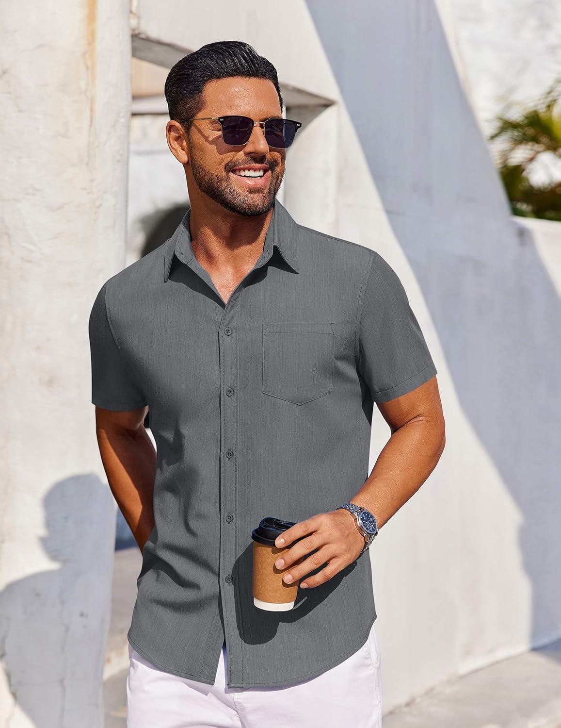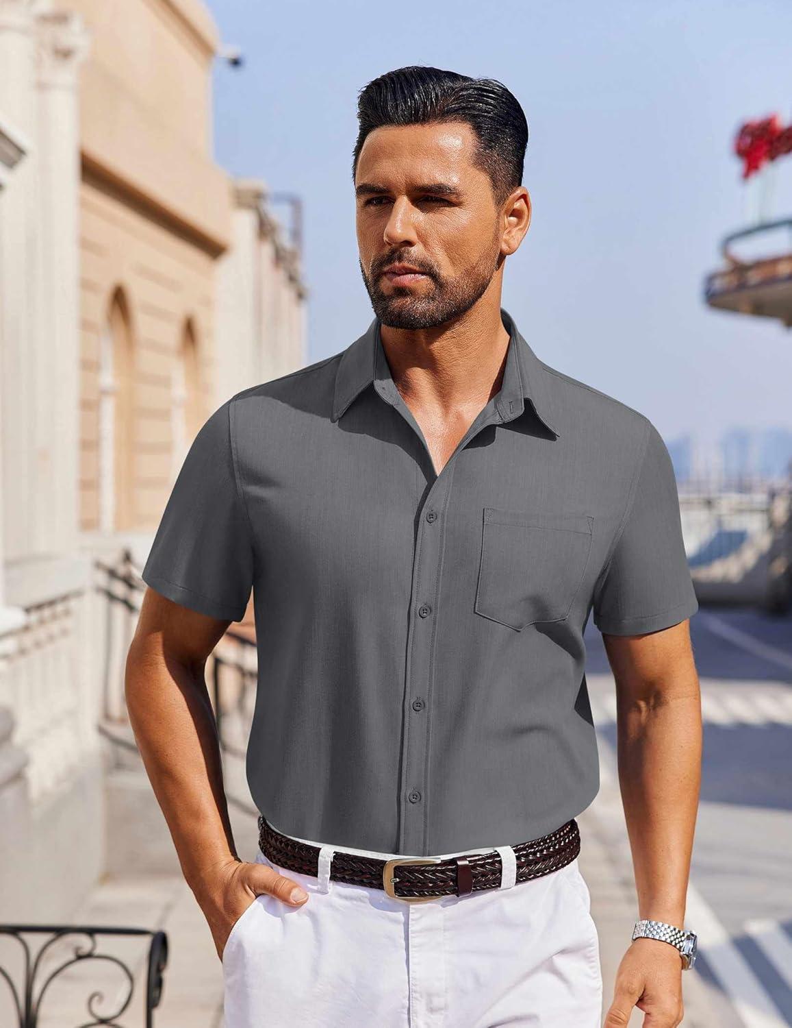 COOFANDY Men's Short Sleeve Button Down Shirt Casual Untucked Dress Shirt Stretch Denim Shirt(Light Grey)