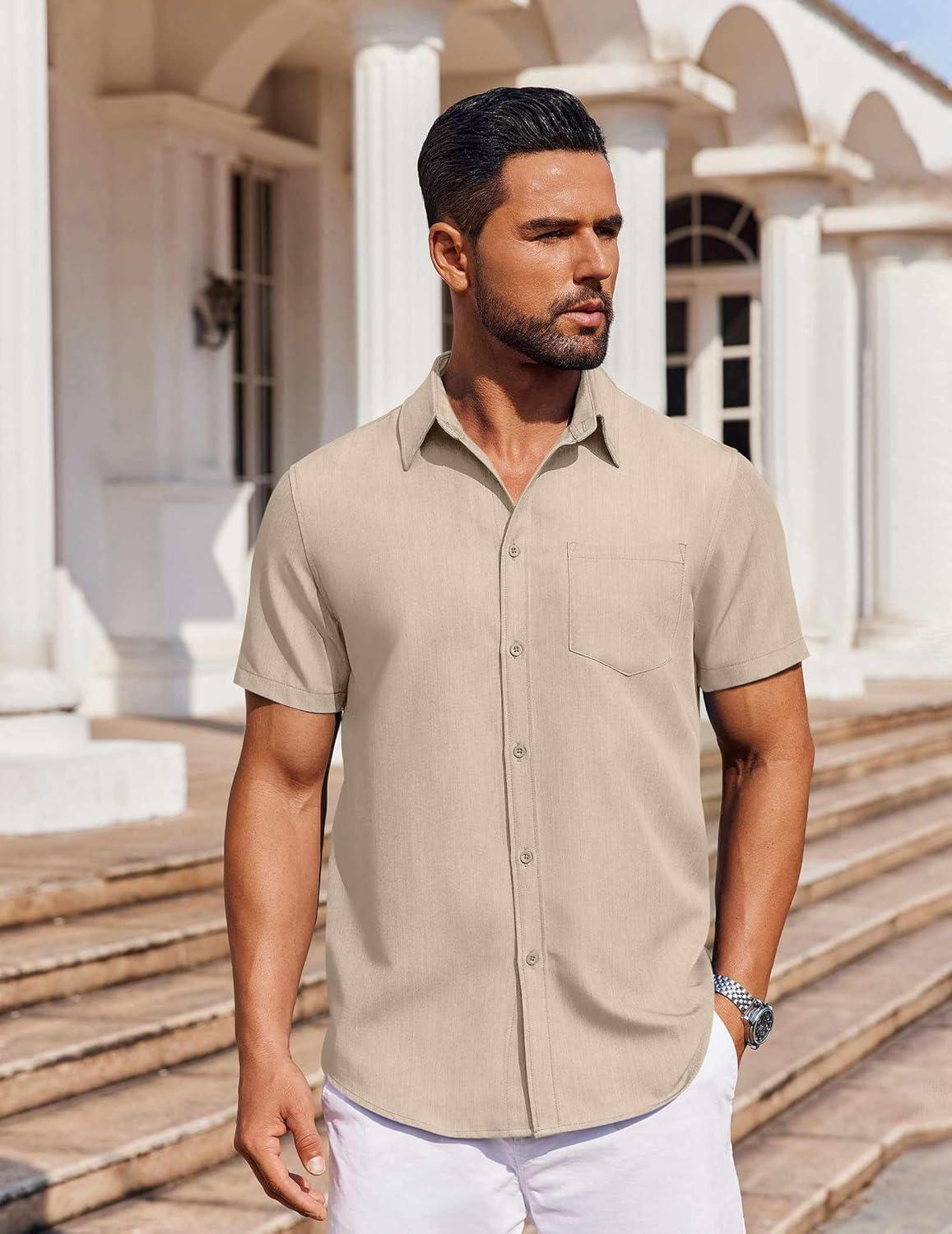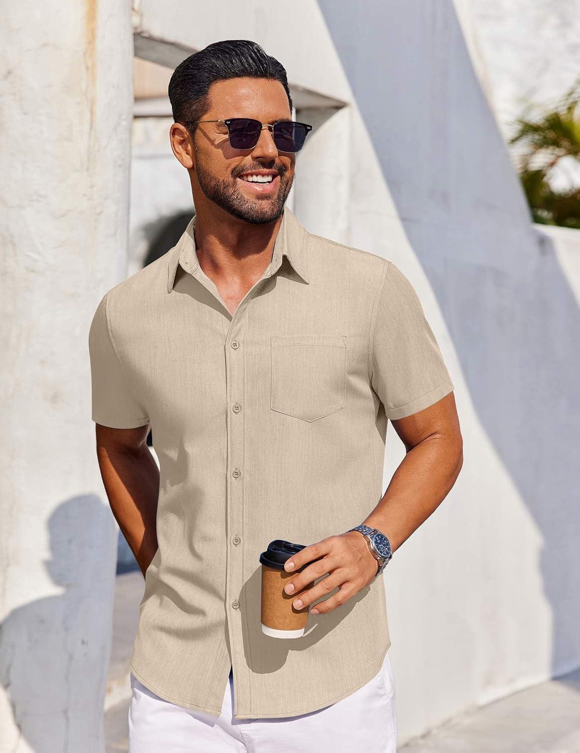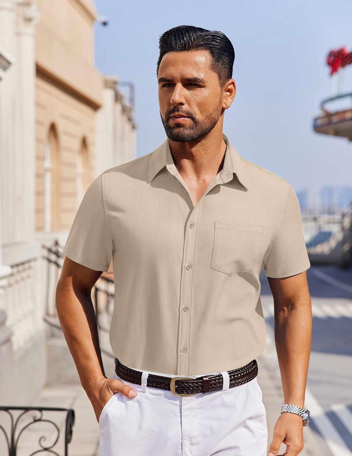 COOFANDY Men's Short Sleeve Button Down Shirt Casual Untucked Dress Shirt Stretch Denim Shirt(Light Khaki)