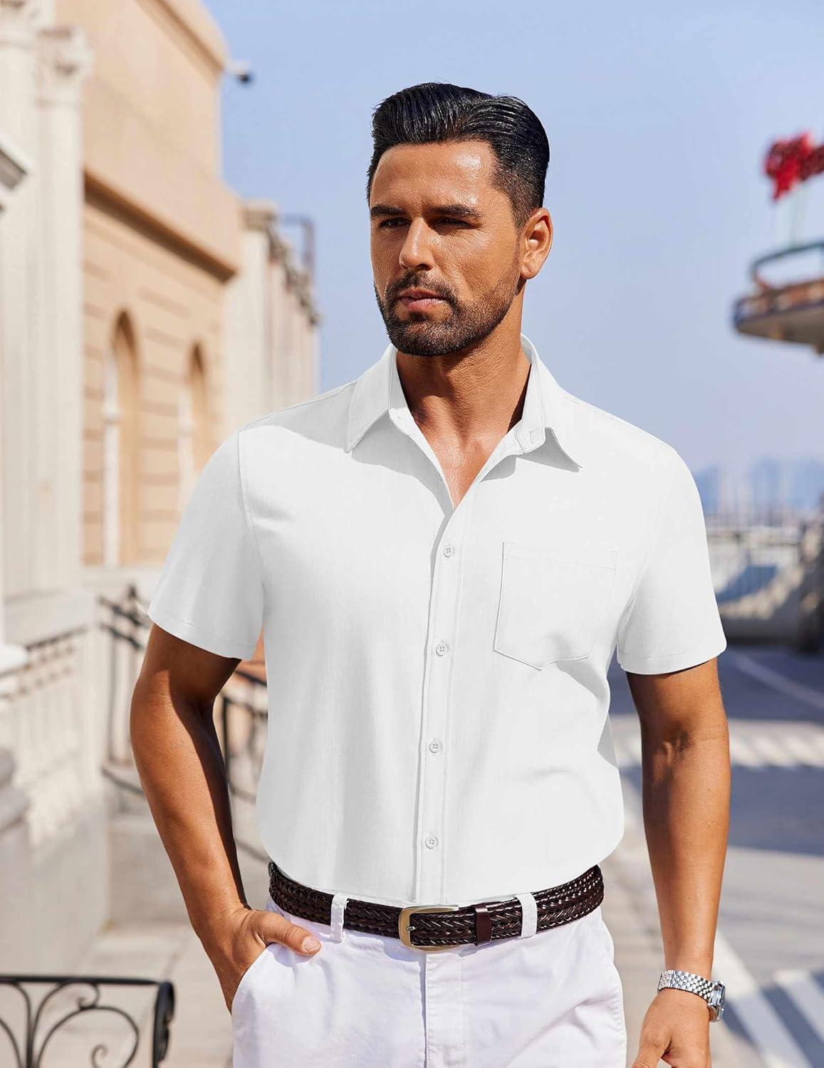 COOFANDY Men's Short Sleeve Button Down Shirt Casual Untucked Dress Shirt Stretch Denim Shirt(White)