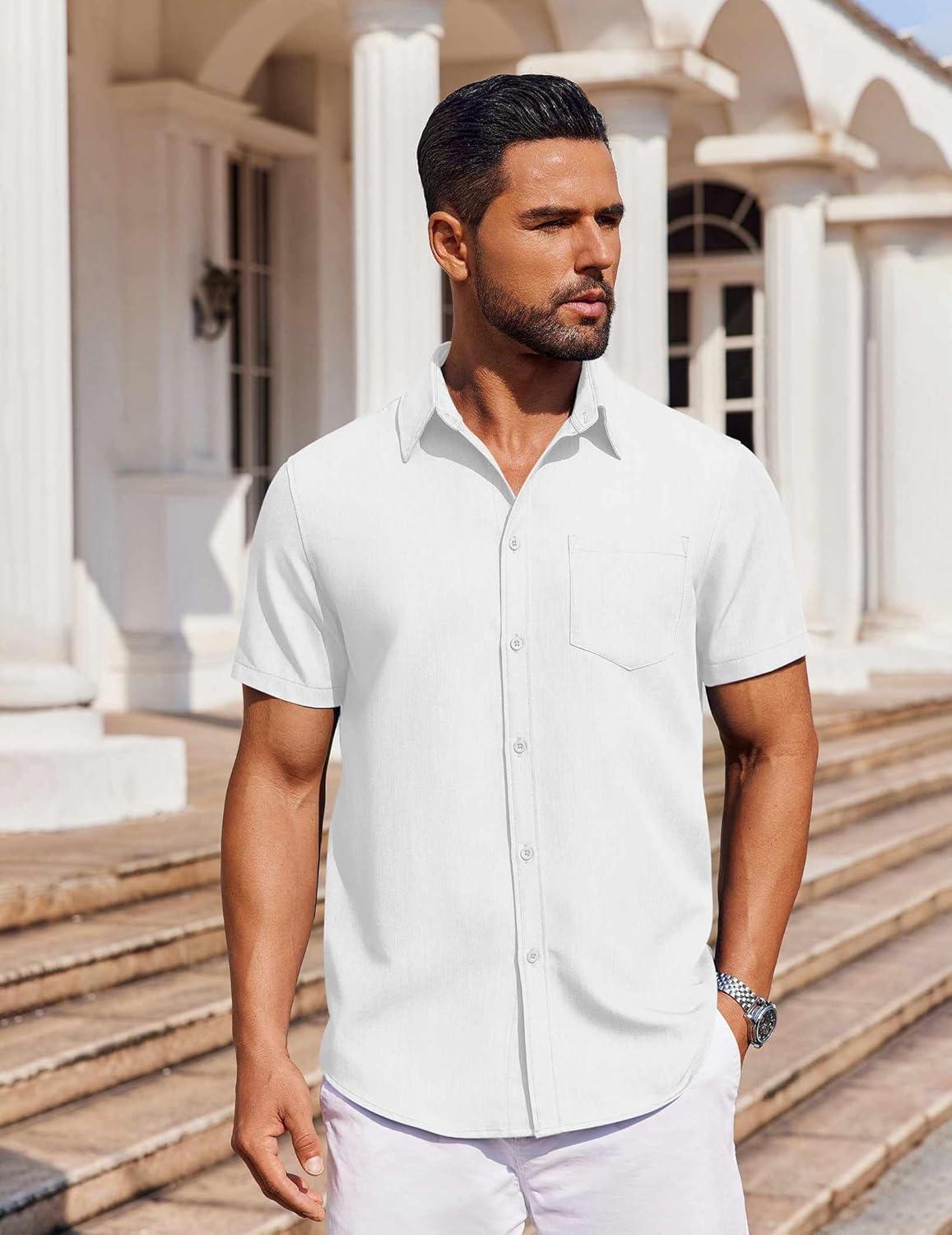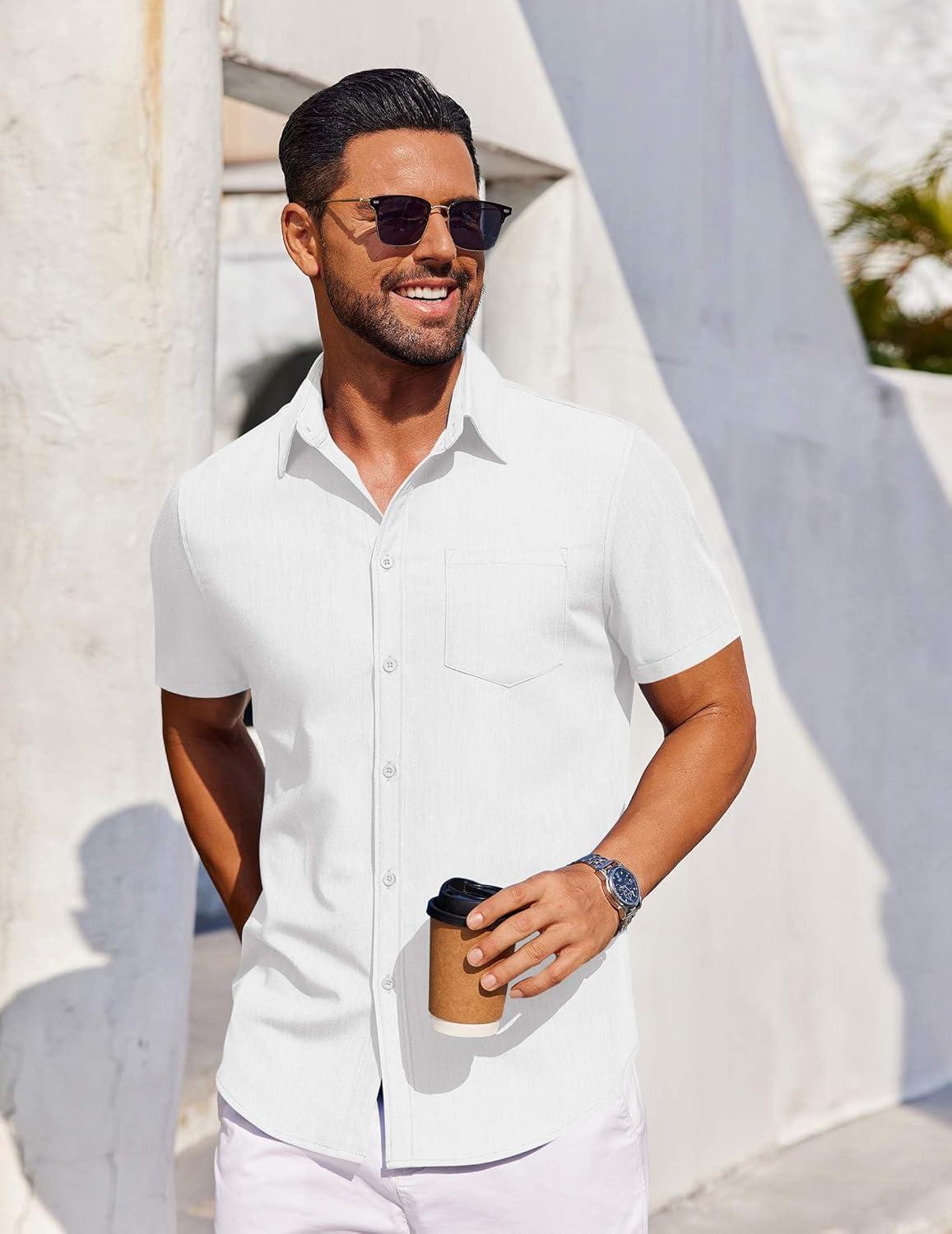 COOFANDY Men’s Short Sleeve Button Down Shirt Casual Untucked Dress Shirt Stretch Denim Shirt(White)