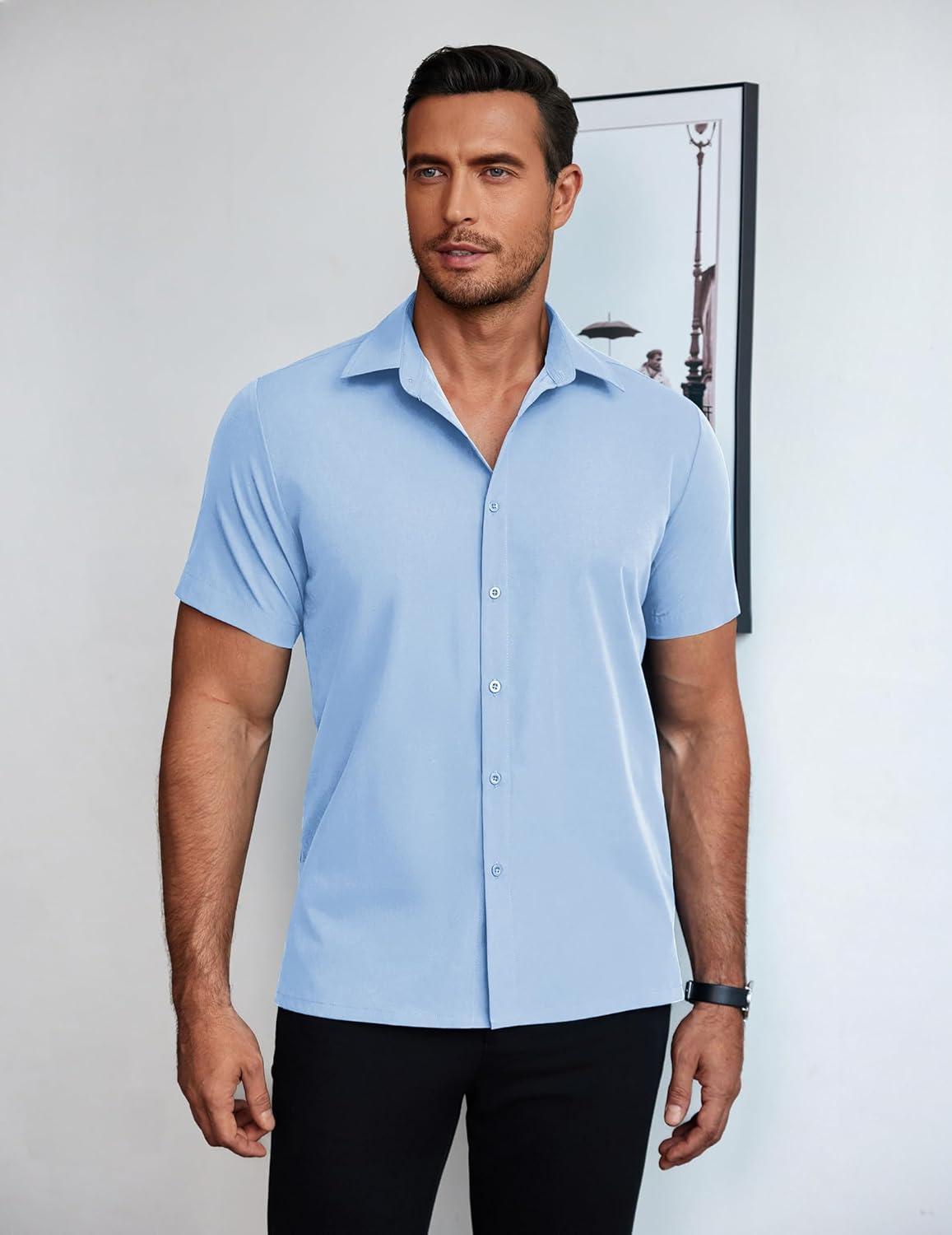 COOFANDY Mens Short Sleeve Button Down Shirt Lightweight Wrinkle Free Untucked Dress Shirts(Clear Blue)