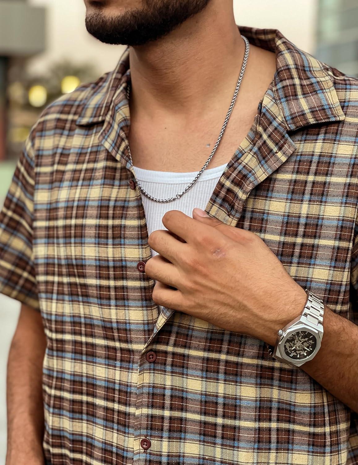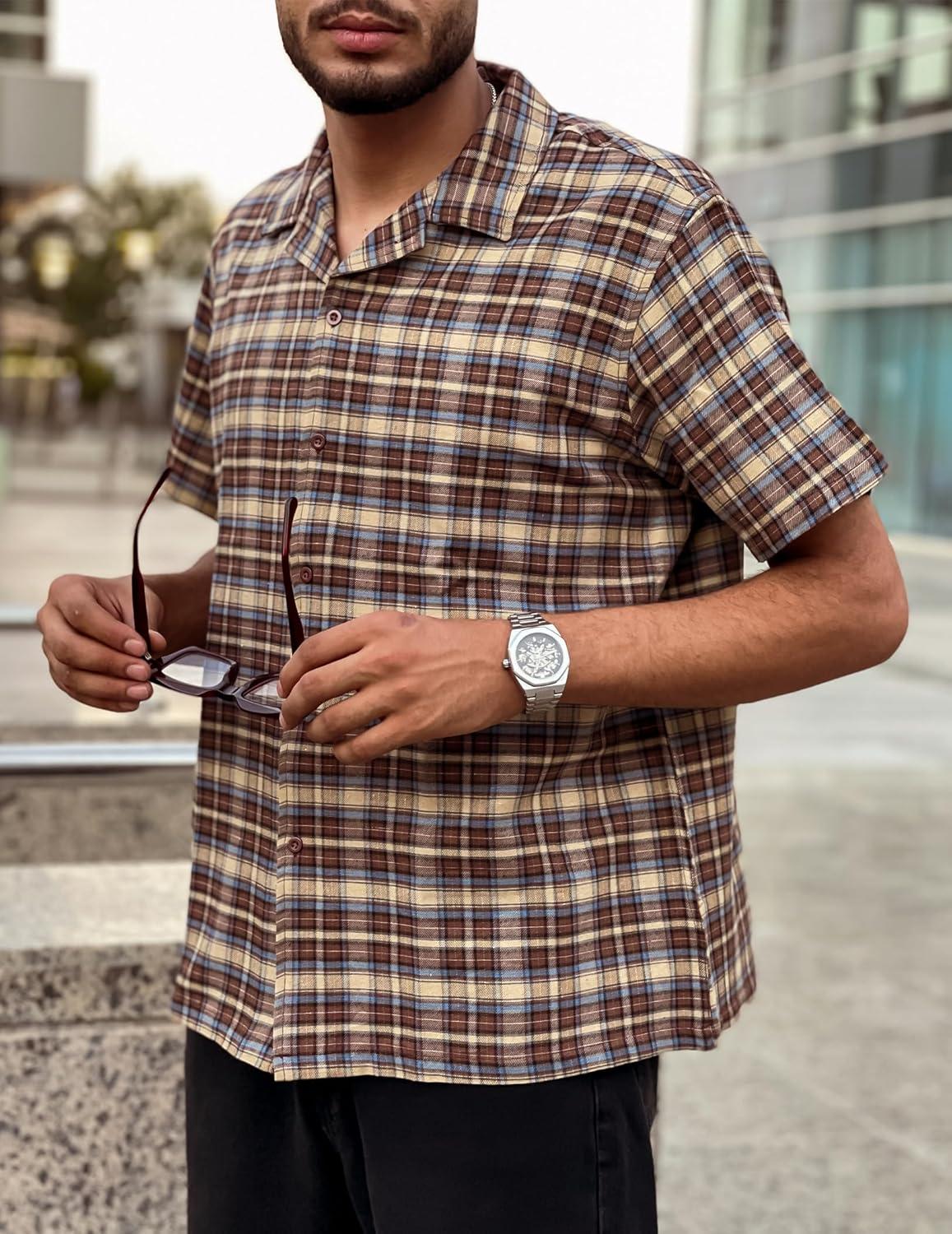 COOFANDY Mens Short Sleeve Button Down Shirt Plaid Button Up Shirts Casual 75% Cotton Work Shirts(Brown)