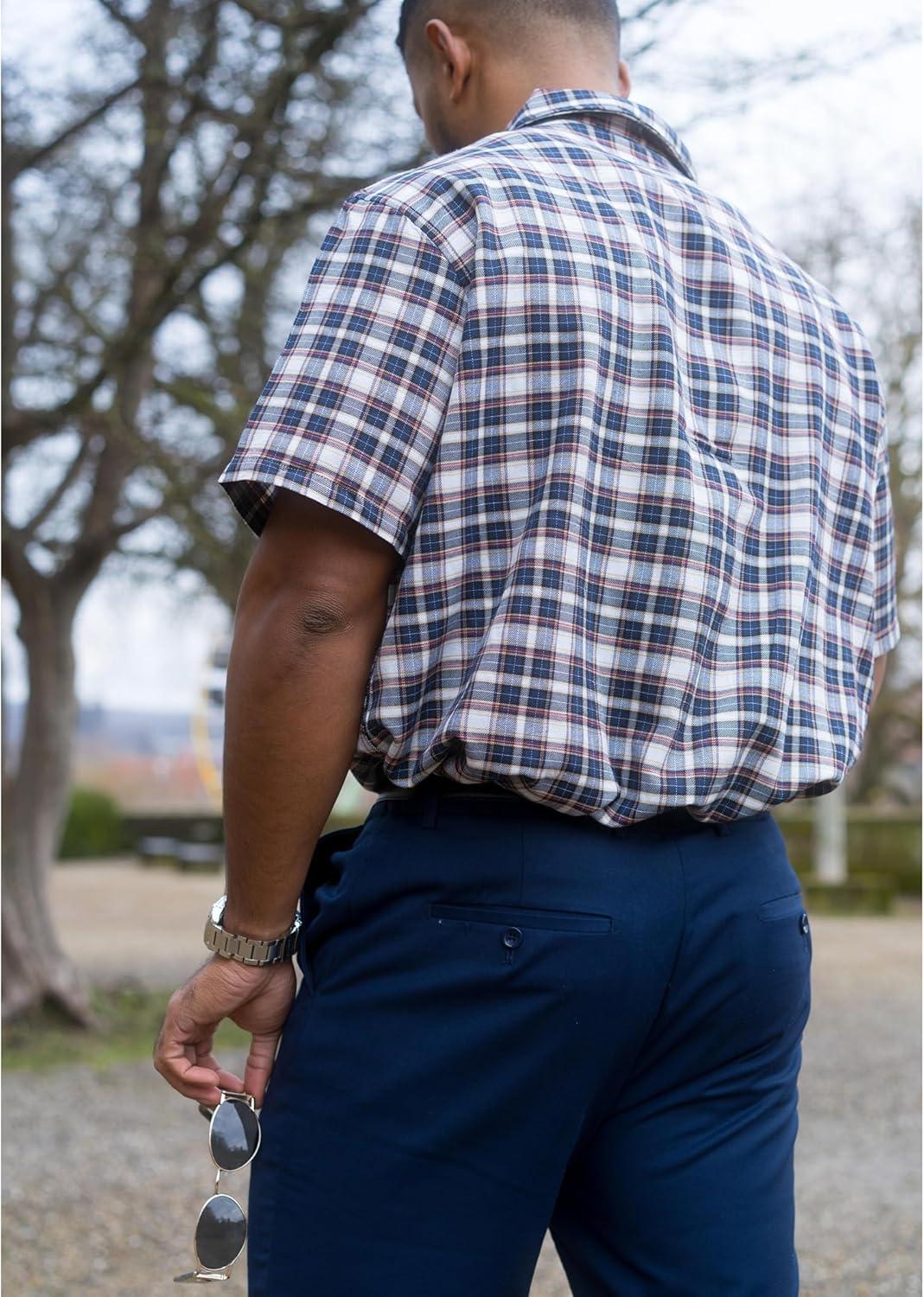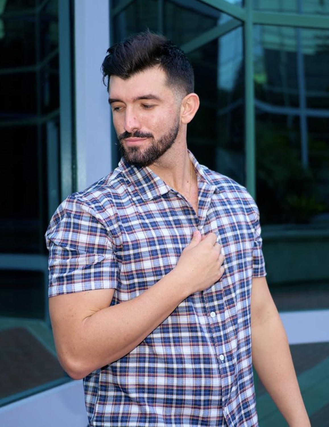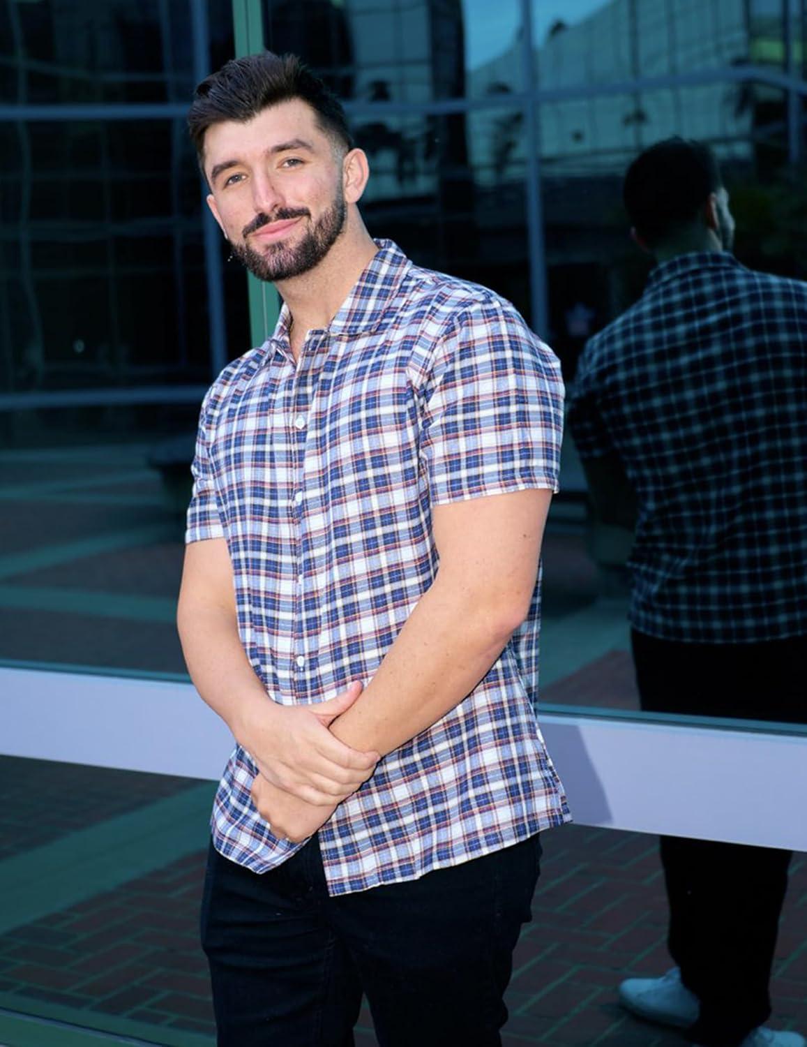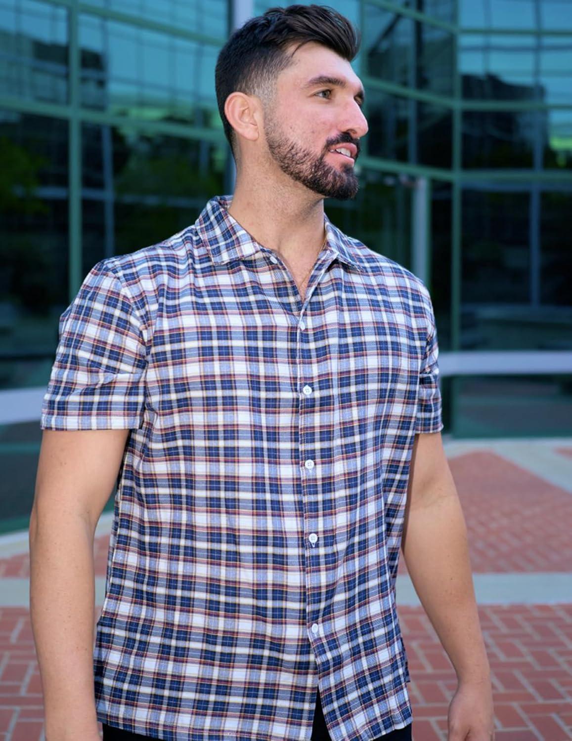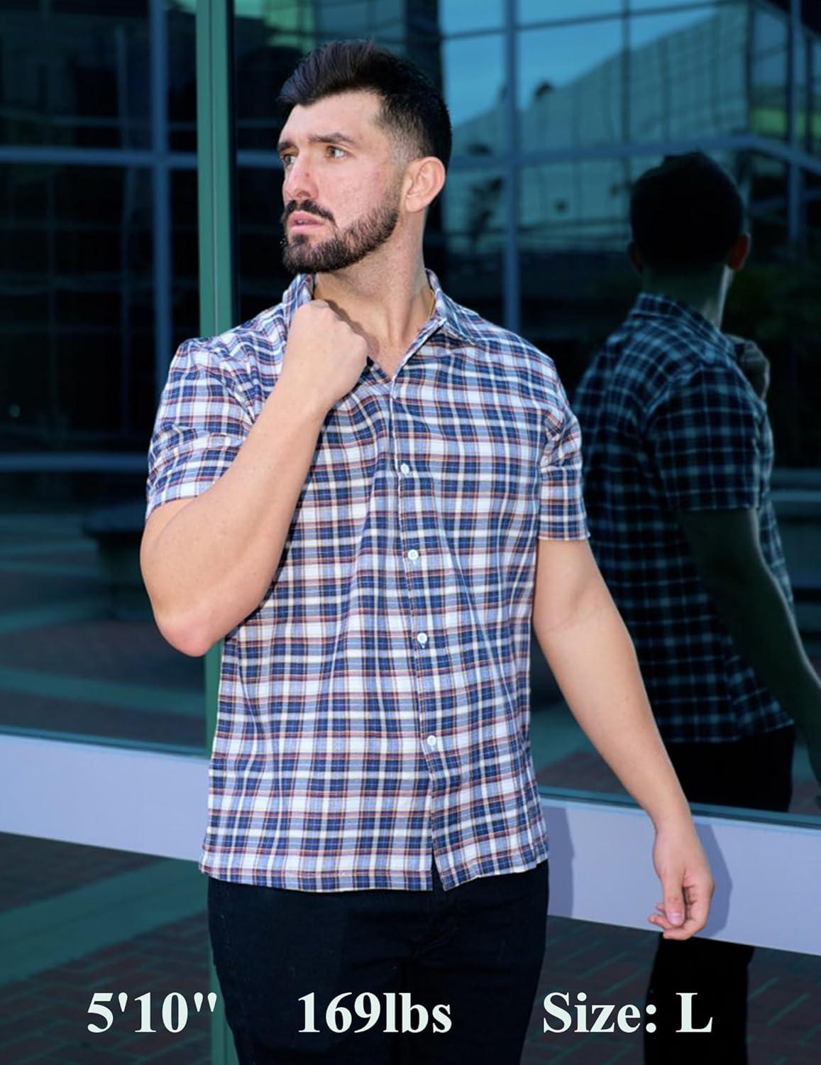 COOFANDY Mens Short Sleeve Button Down Shirt Plaid Button Up Shirts Casual 75% Cotton Work Shirts(Dark Blue&white)
