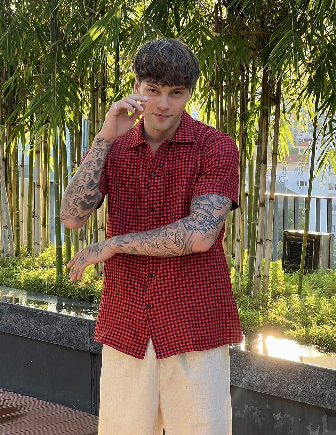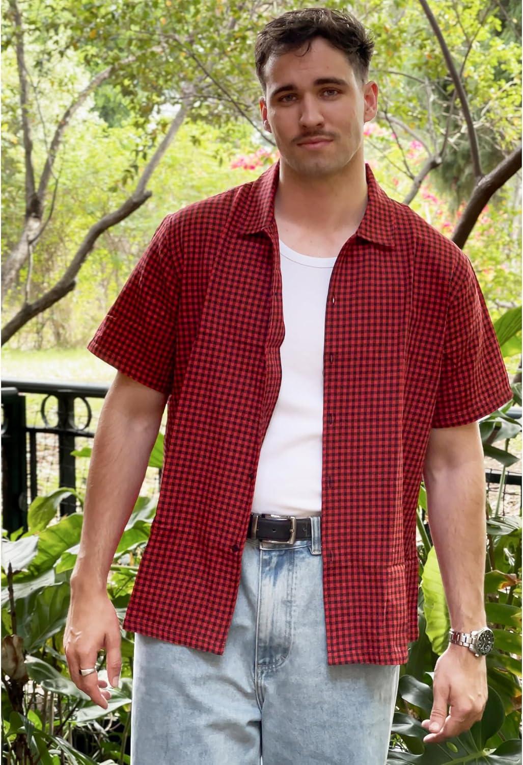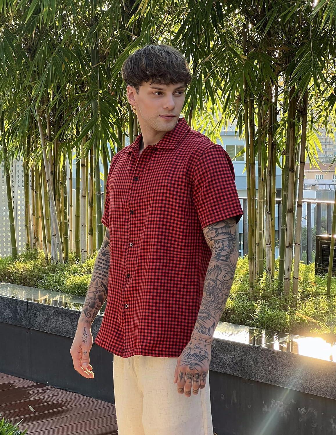 COOFANDY Mens Short Sleeve Button Down Shirt Plaid Button Up Shirts Casual 75% Cotton Work Shirts(Red&black)