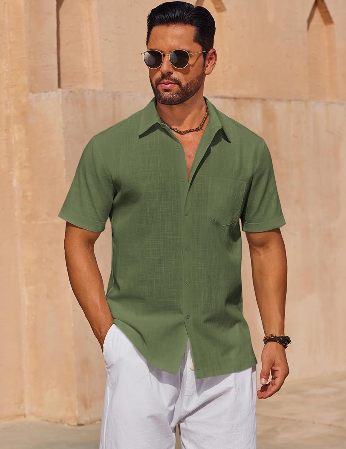 COOFANDY Mens Short Sleeve Button Down Shirts 100% Cotton Beach Style Textured Shirts(Olive Green)