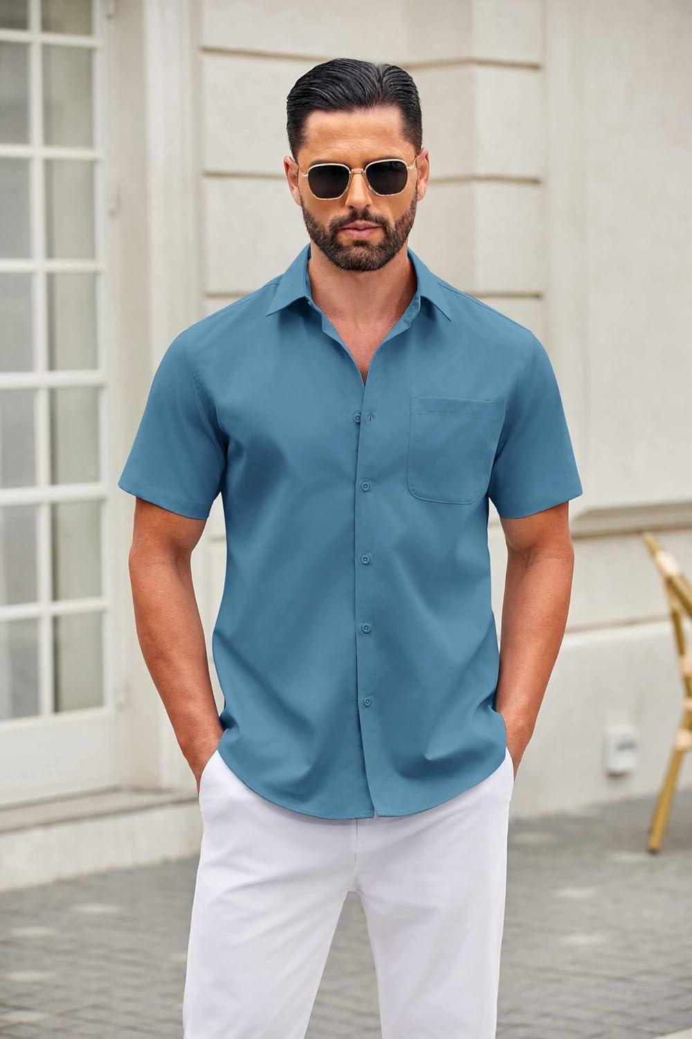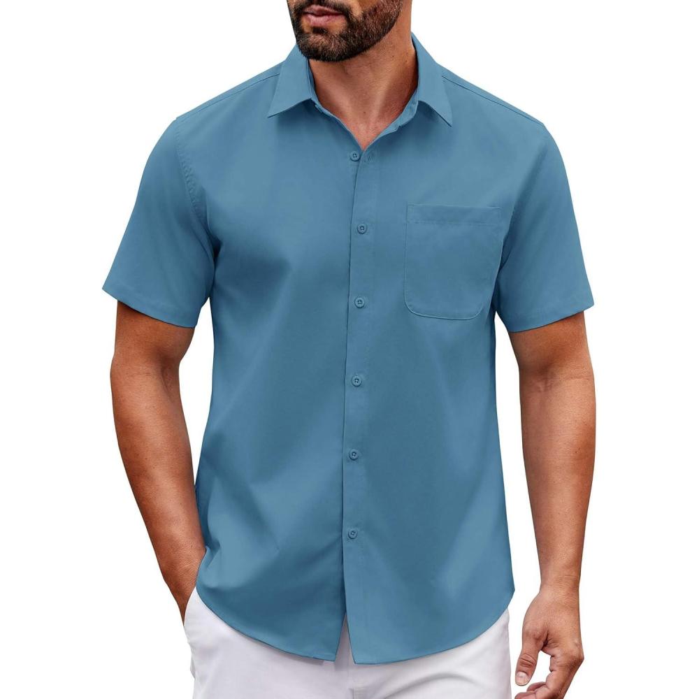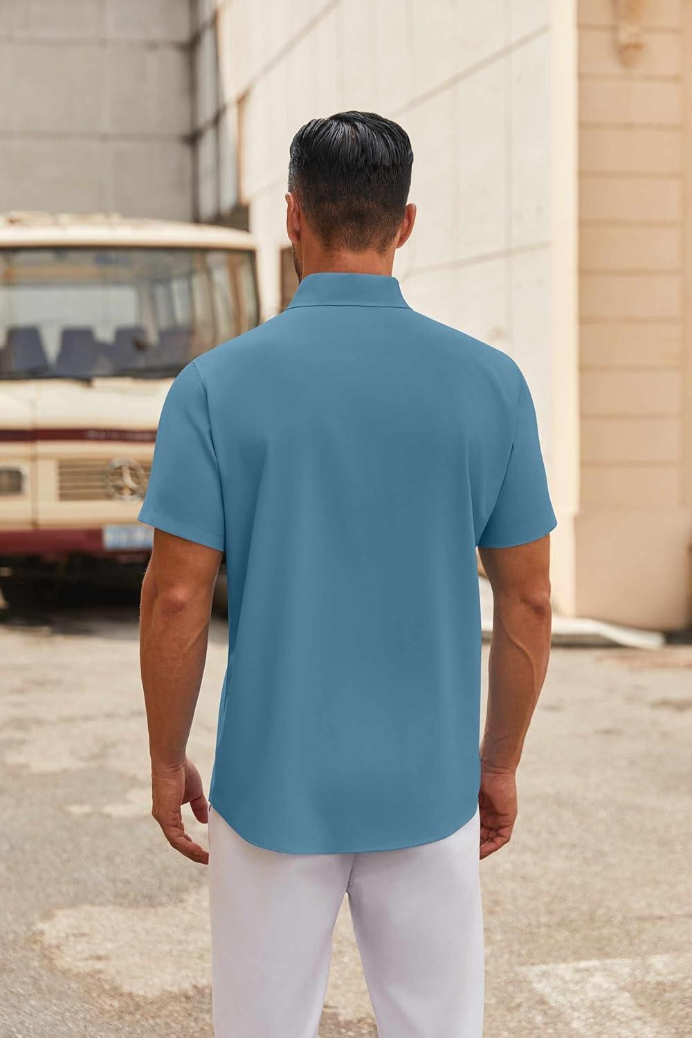 COOFANDY Mens Short Sleeve Button Down Shirts Casual Dress Shirt Untucked Shirts with Pocket(Clear Blue)
