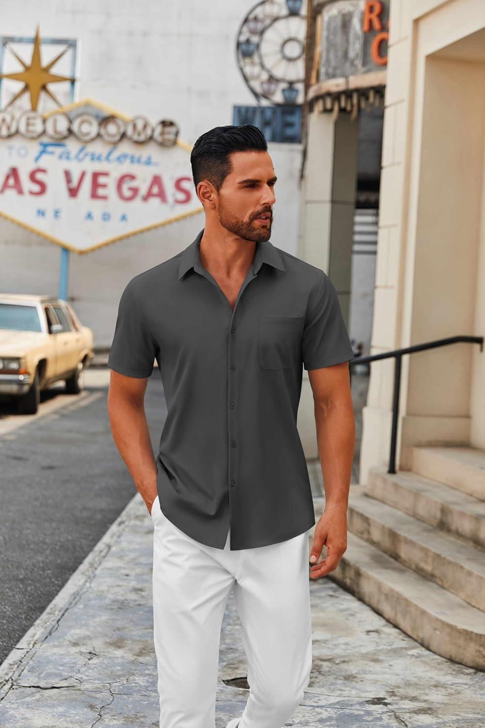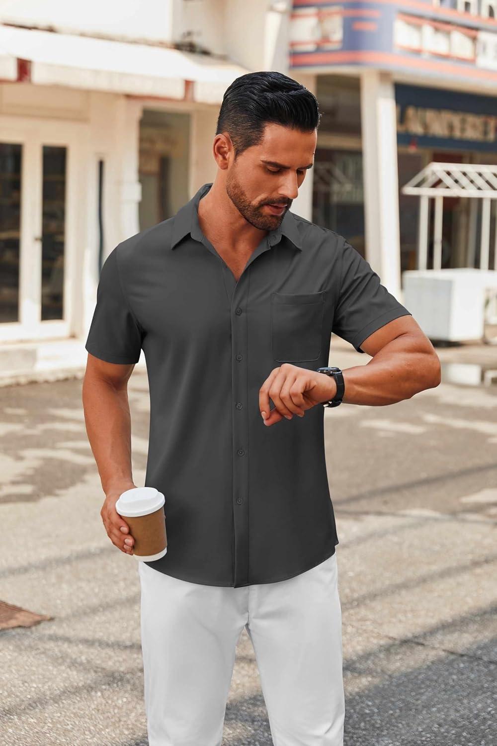 COOFANDY Mens Short Sleeve Button Down Shirts Casual Dress Shirts for Men Summer Untucked Shirts with Pocket(Dark Gray)