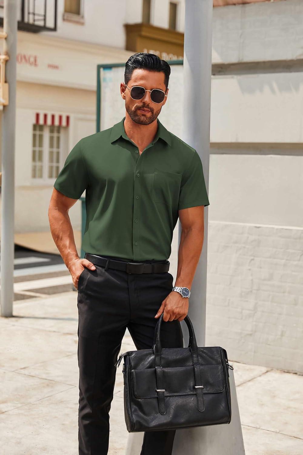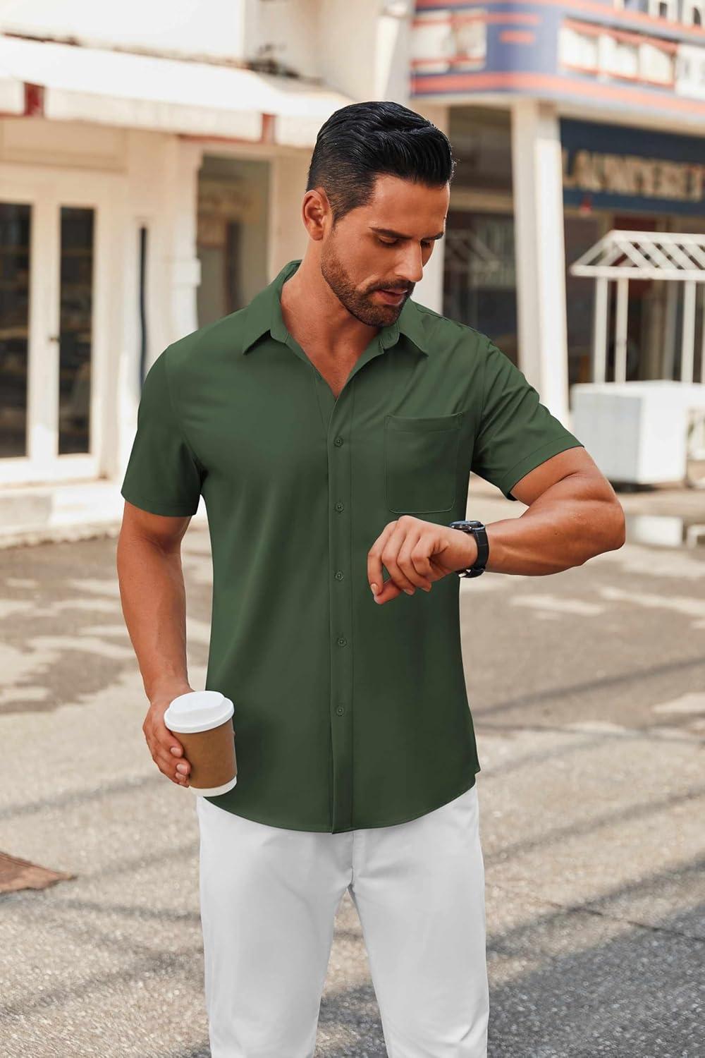 COOFANDY Mens Short Sleeve Button Down Shirts Casual Dress Shirts for Men Summer Untucked Shirts with Pocket(Dark Green)
