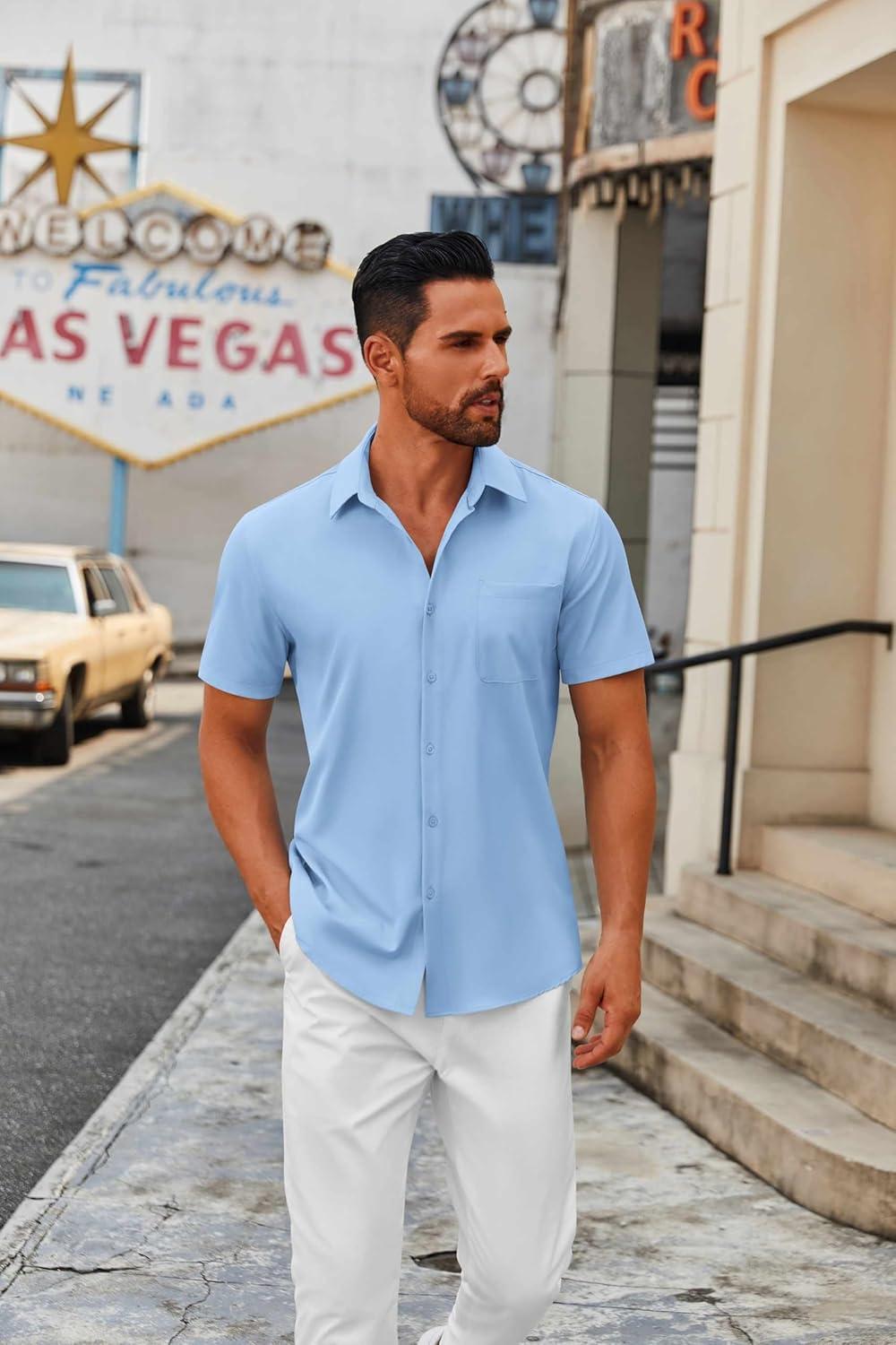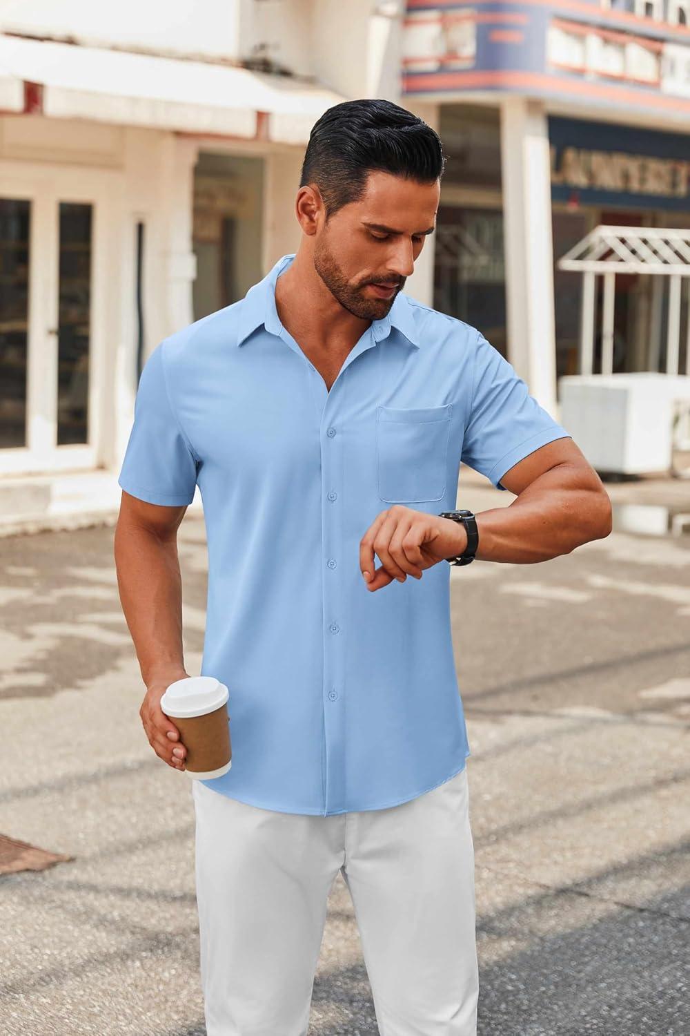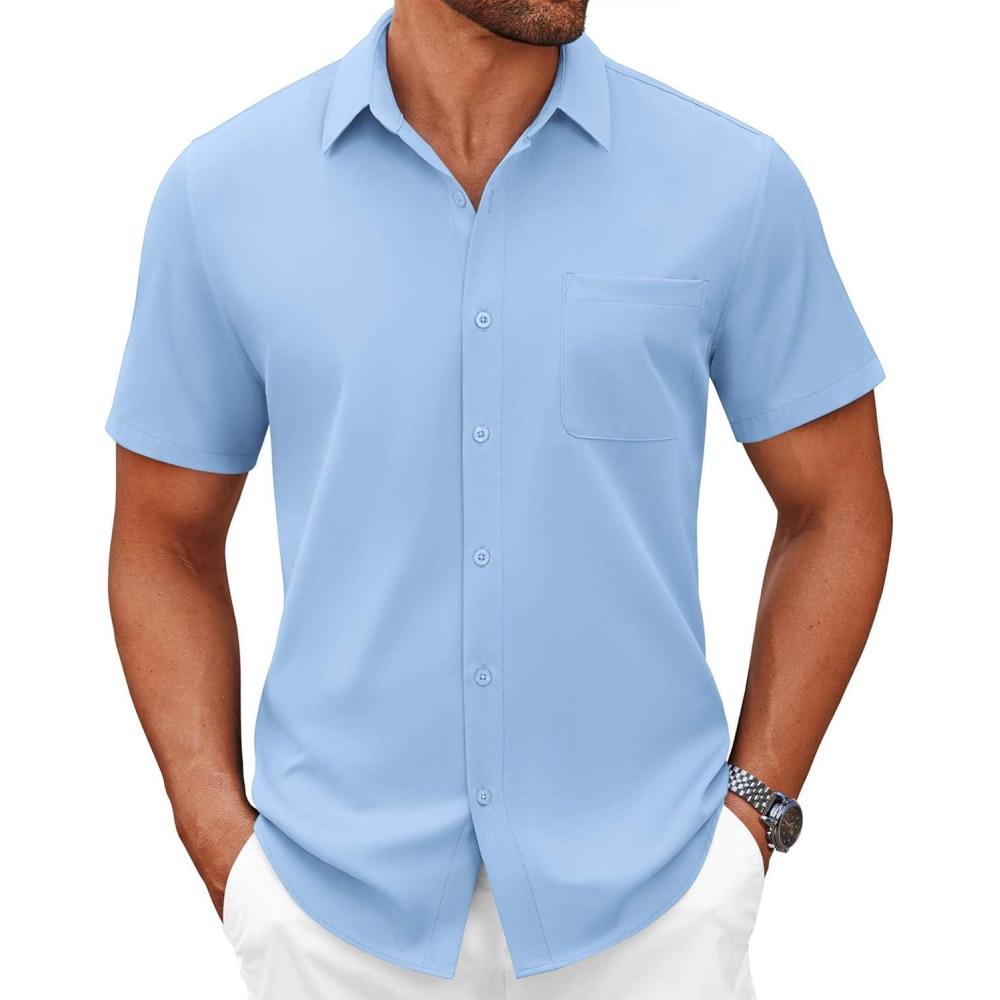 COOFANDY Mens Short Sleeve Button Down Shirts Casual Dress Shirts for Men Summer Untucked Shirts with Pocket(Light Blue)