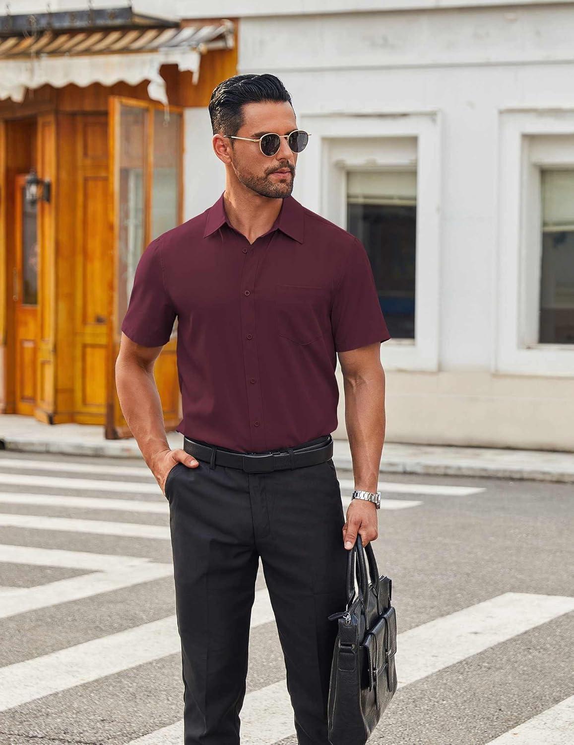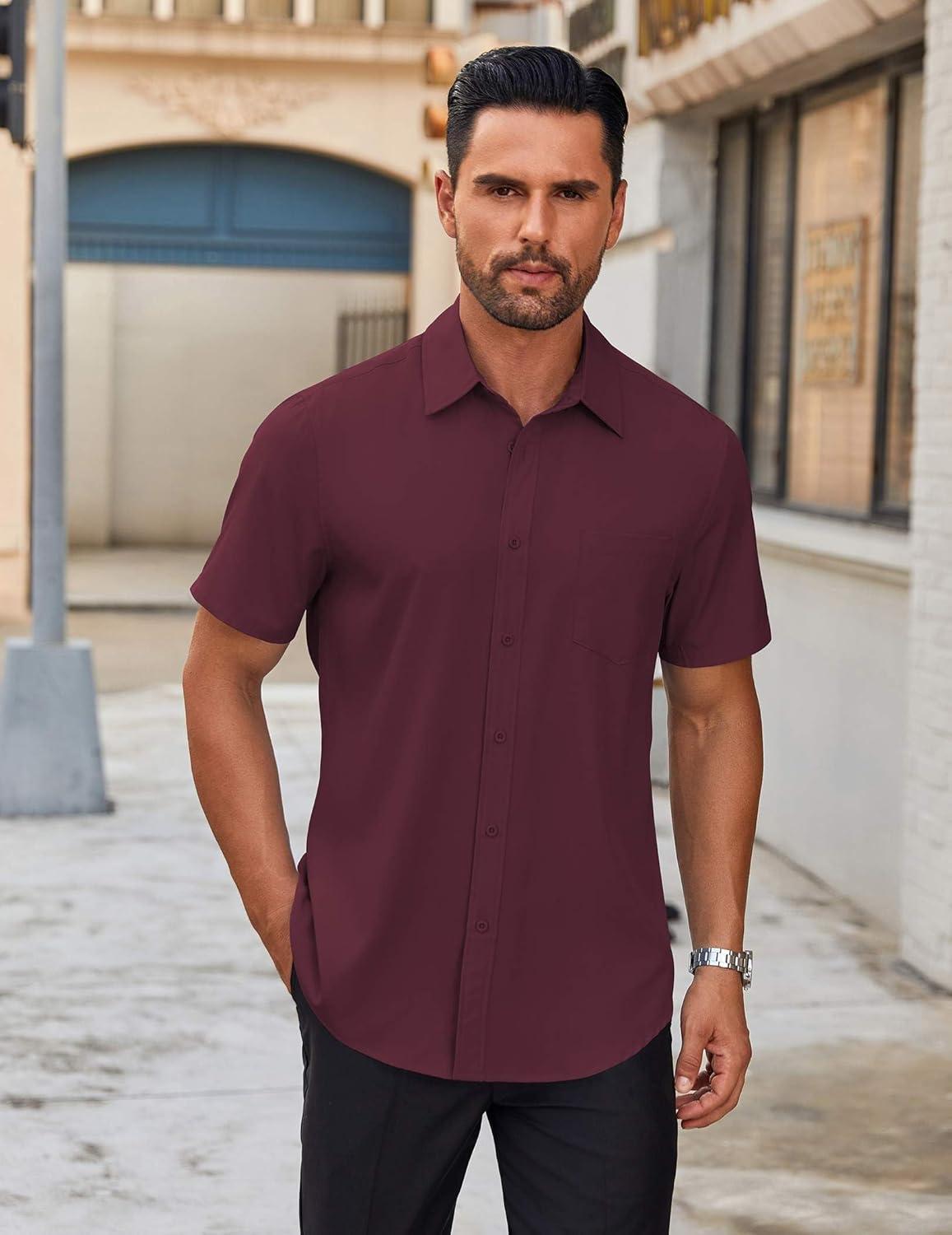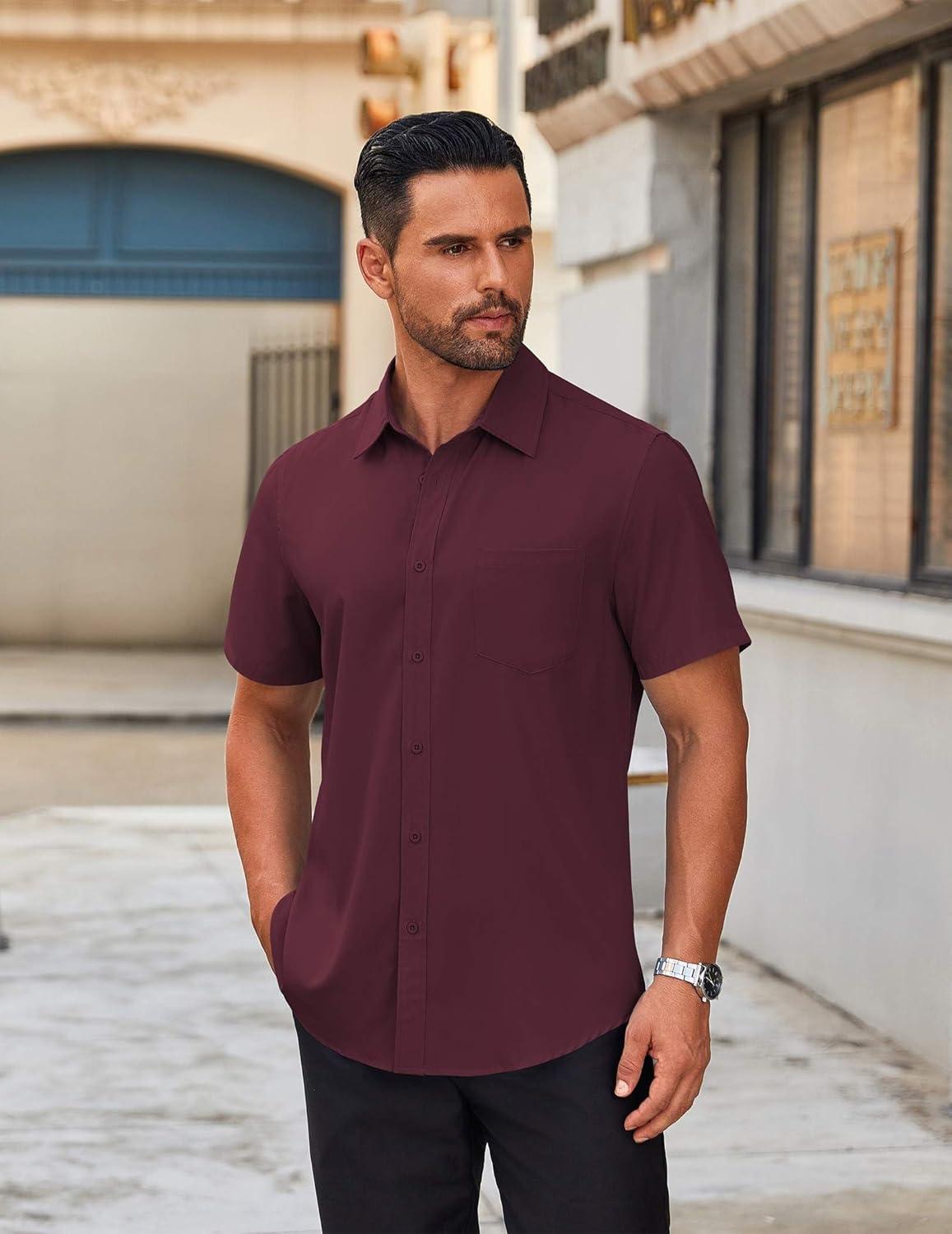 COOFANDY Men's Short Sleeve Button Down Shirts Casual Dress Shirts for Men Untucked Shirt with Pocket(Wine Red)