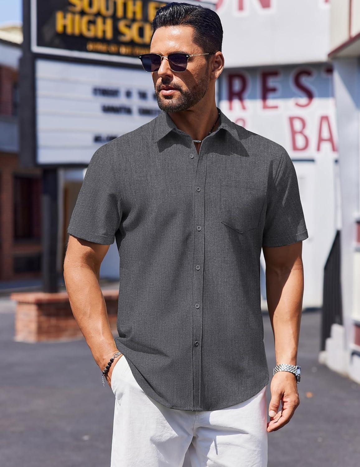 COOFANDY Mens Short Sleeve Button Down Shirts Casual Summer Beach Shirt Wedding Dress Shirts with Pocket(Dark Grey)
