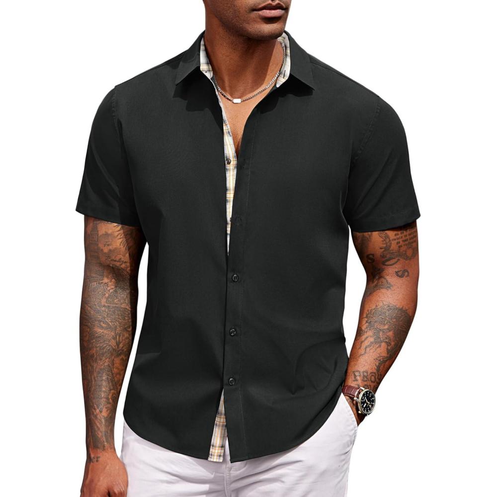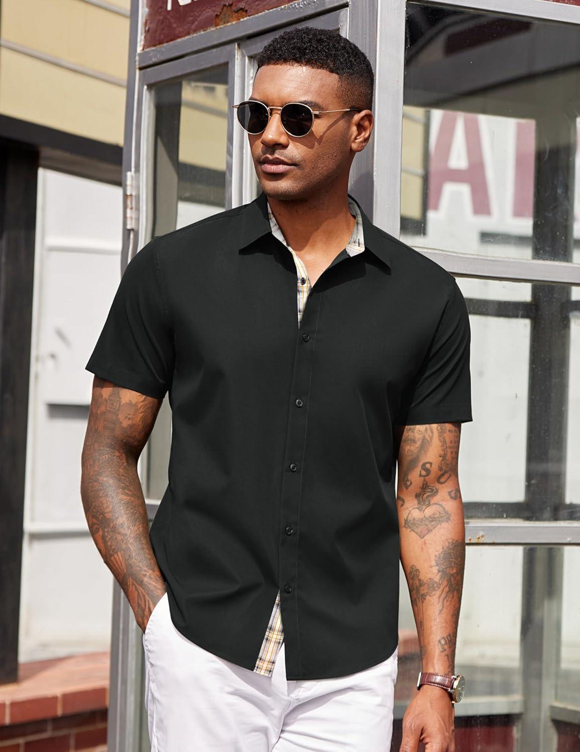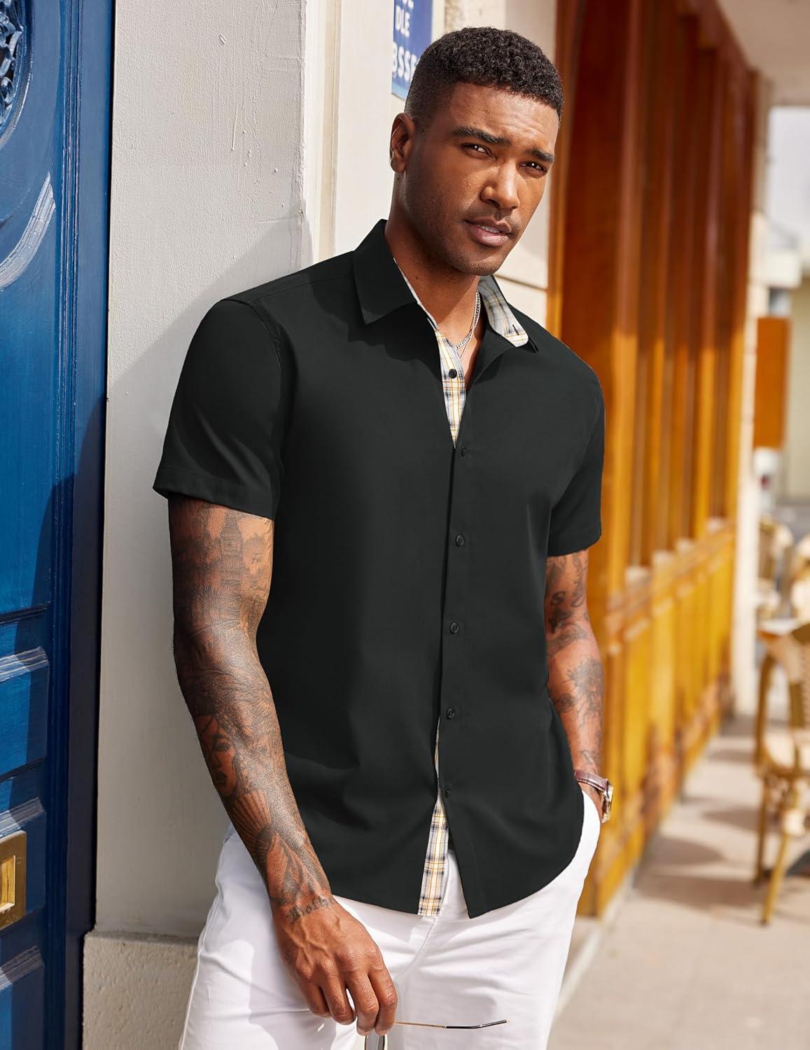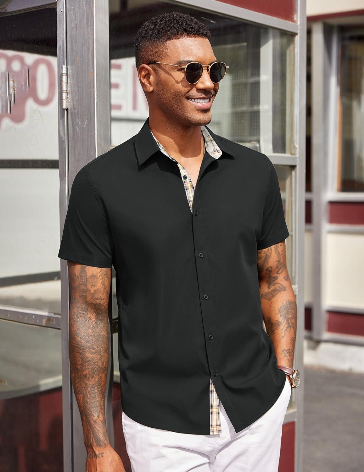 COOFANDY Men’s Short Sleeve Button Down Shirts Casual Summer Dress Untucked Shirts(A – Plaid Collar- Black)