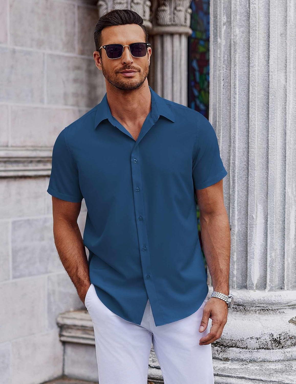 COOFANDY Mens Short Sleeve Button Down Shirts Casual Summer Shirt Untucked Dress Shirts(Dark Blue)