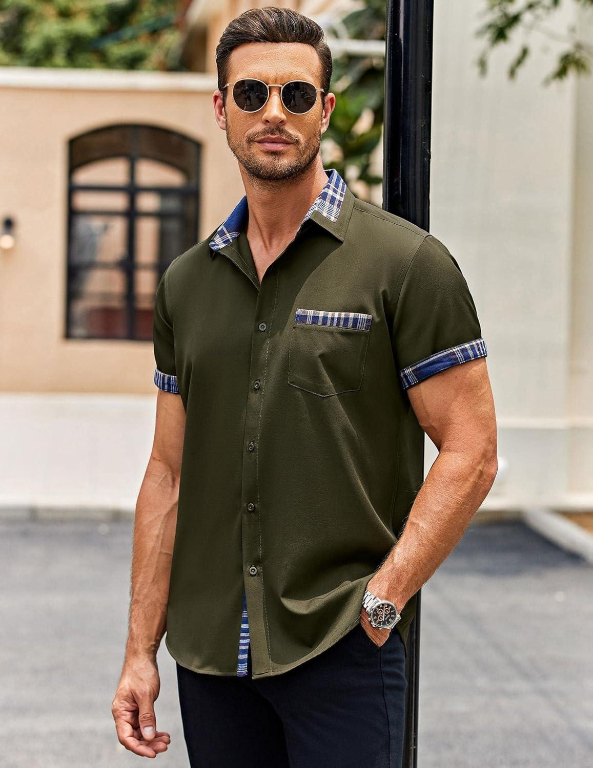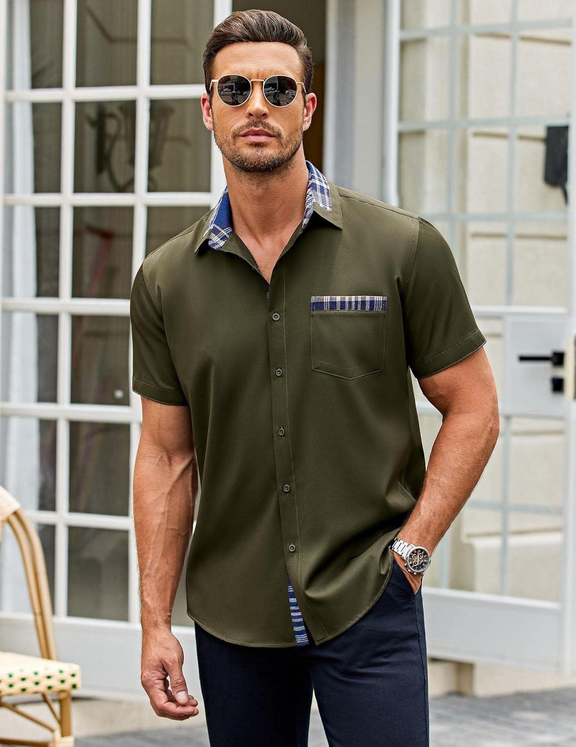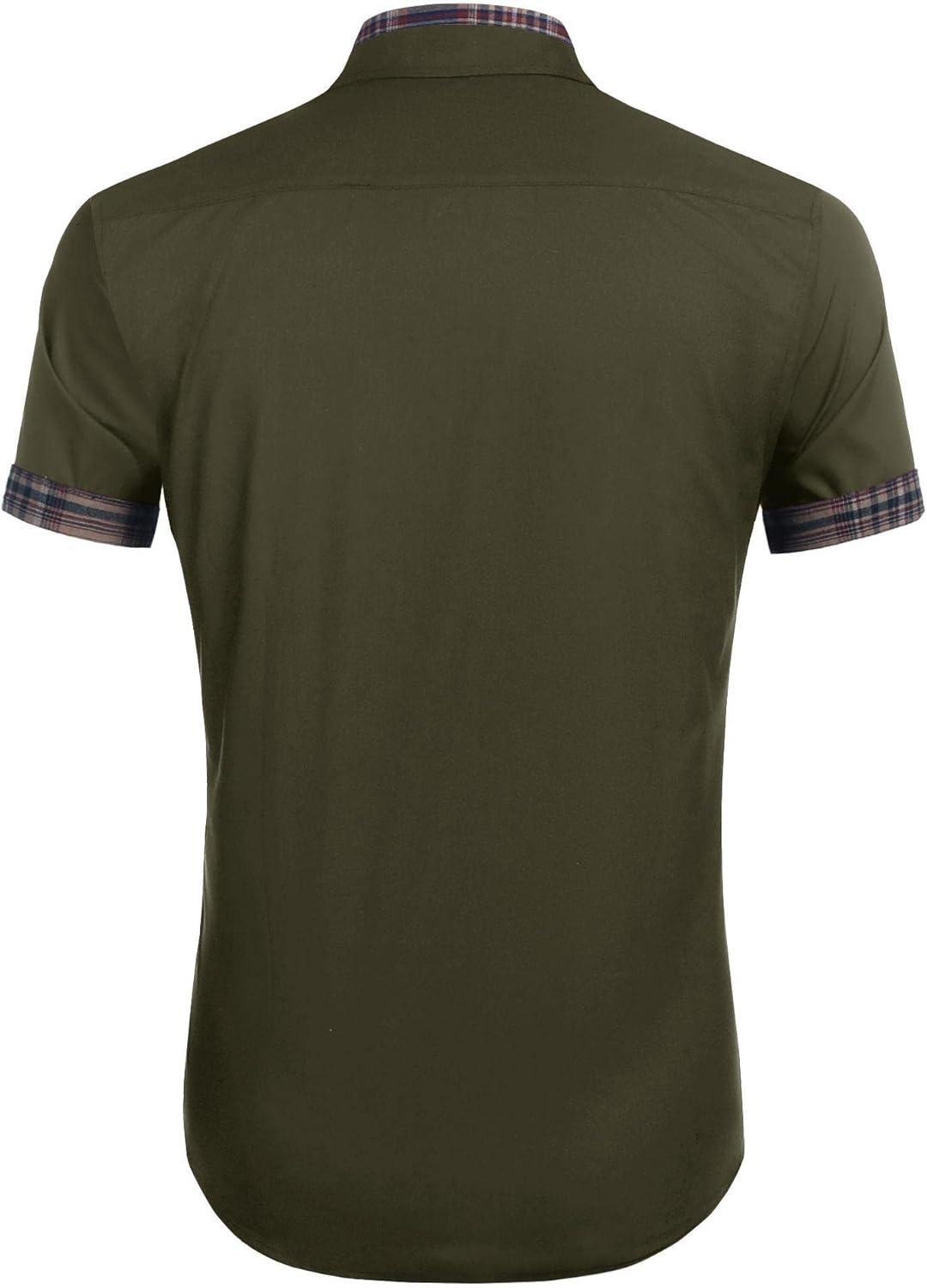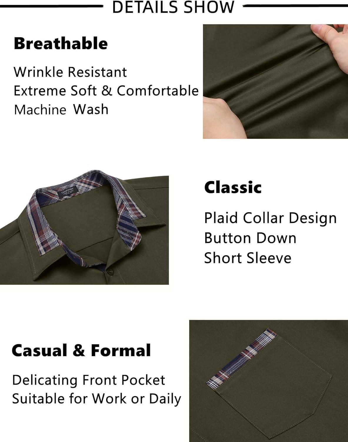 COOFANDY Mens Short Sleeve Button Down Shirts Casual Wrinkle Free Dress Shirt Plaid Collar Summer Shirts(Army Green)