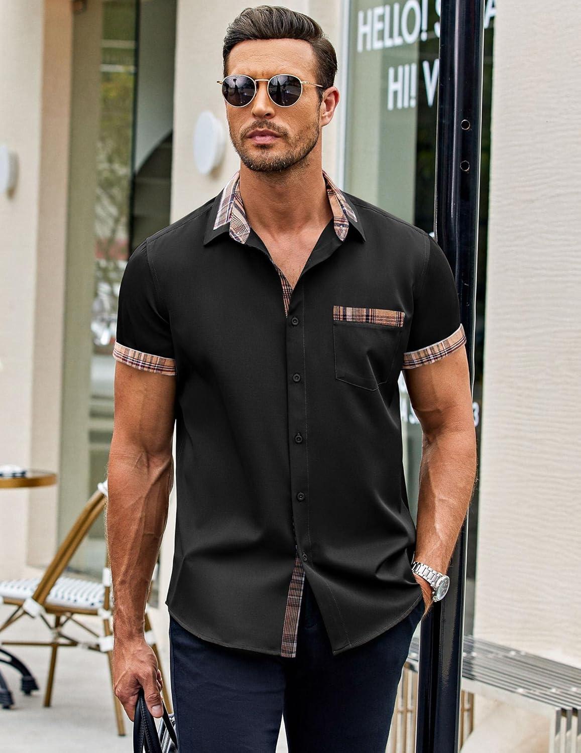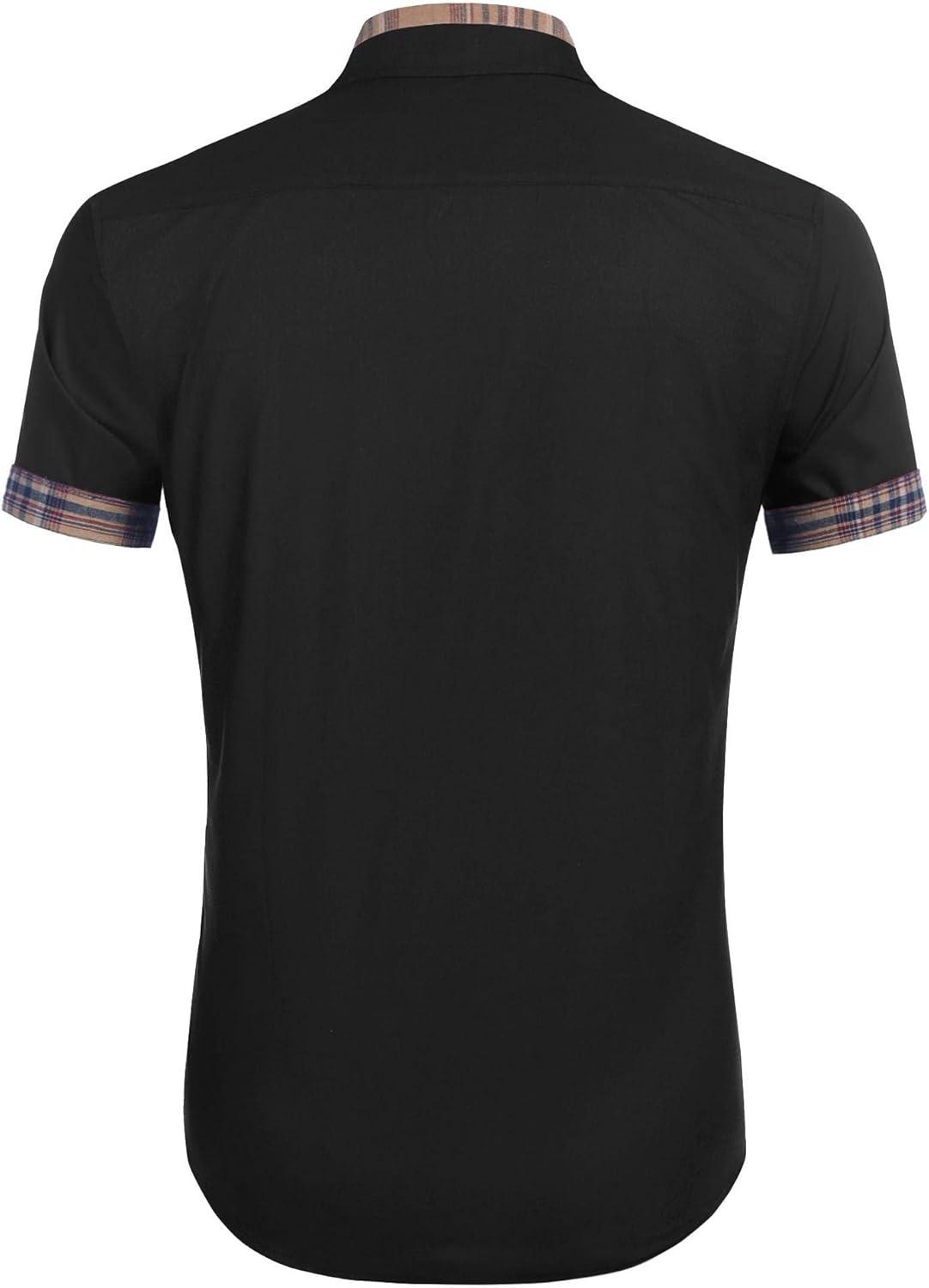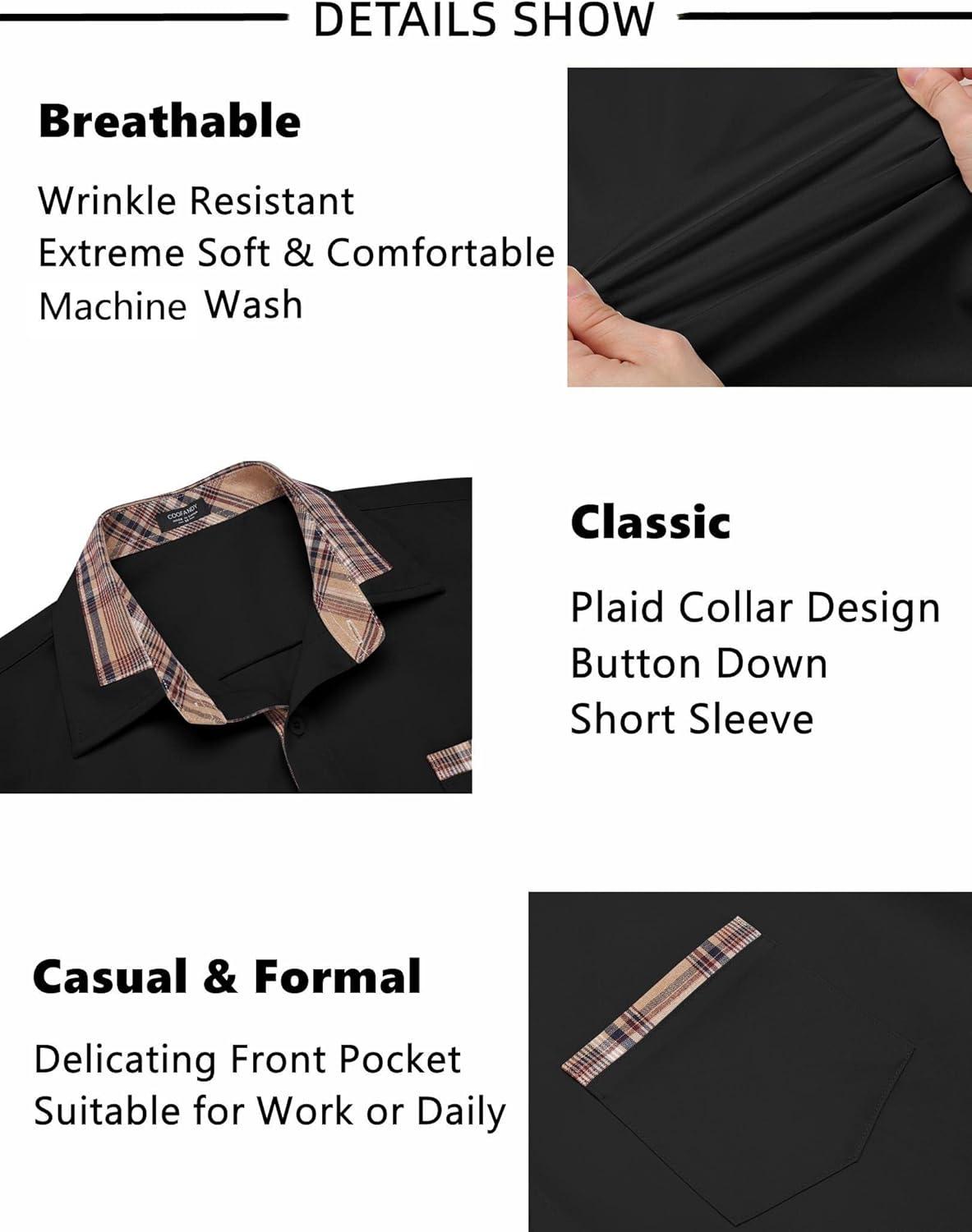 COOFANDY Mens Short Sleeve Button Down Shirts Casual Wrinkle Free Dress Shirt Plaid Collar Summer Shirts(Black)