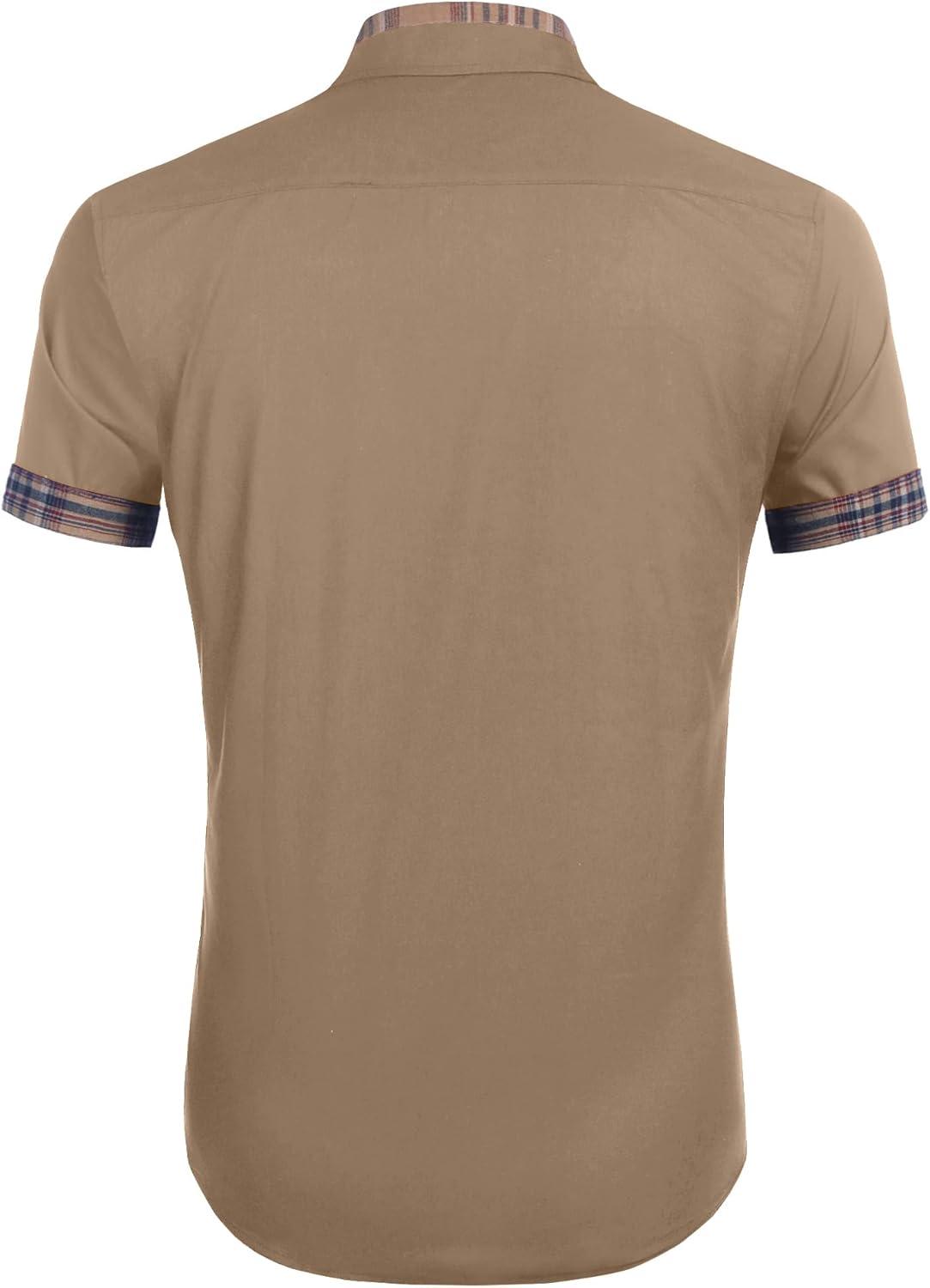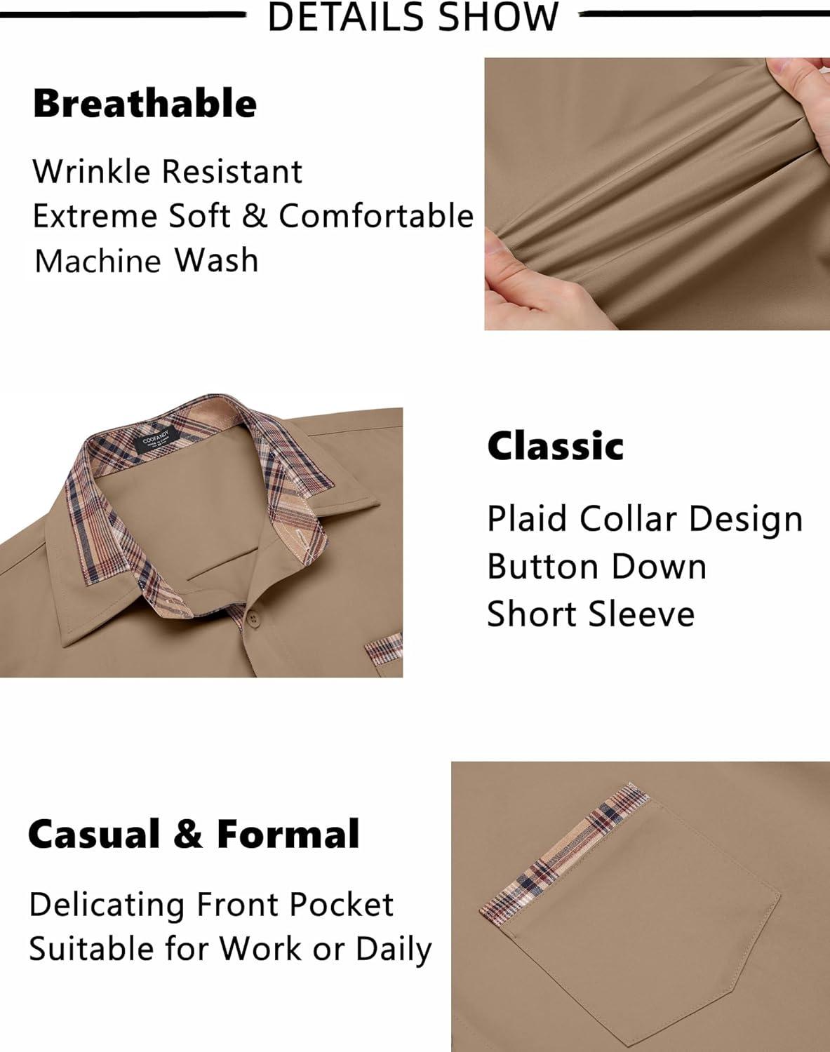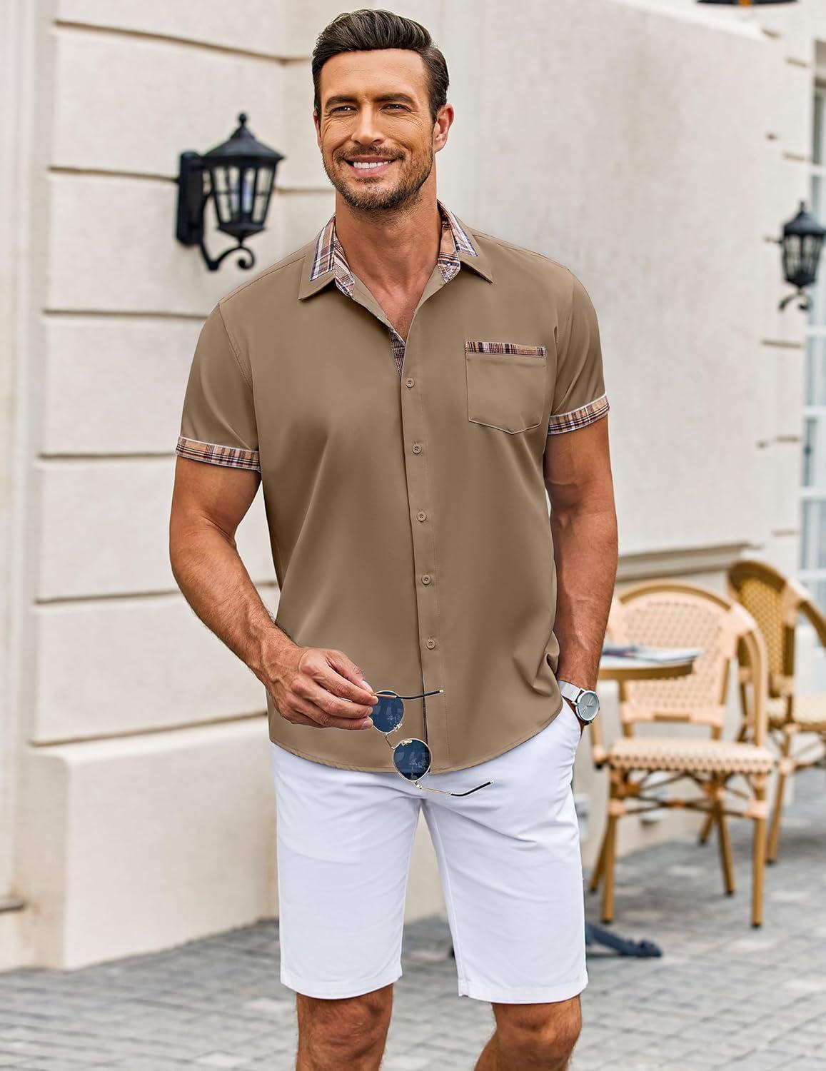 COOFANDY Mens Short Sleeve Button Down Shirts Casual Wrinkle Free Dress Shirt Plaid Collar Summer Shirts(Brown)