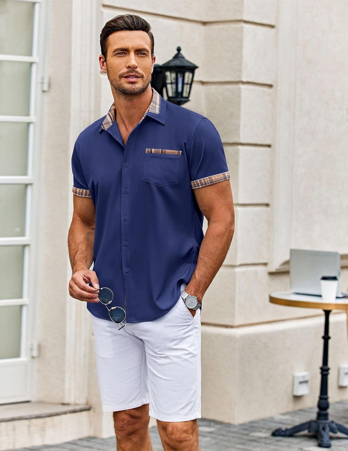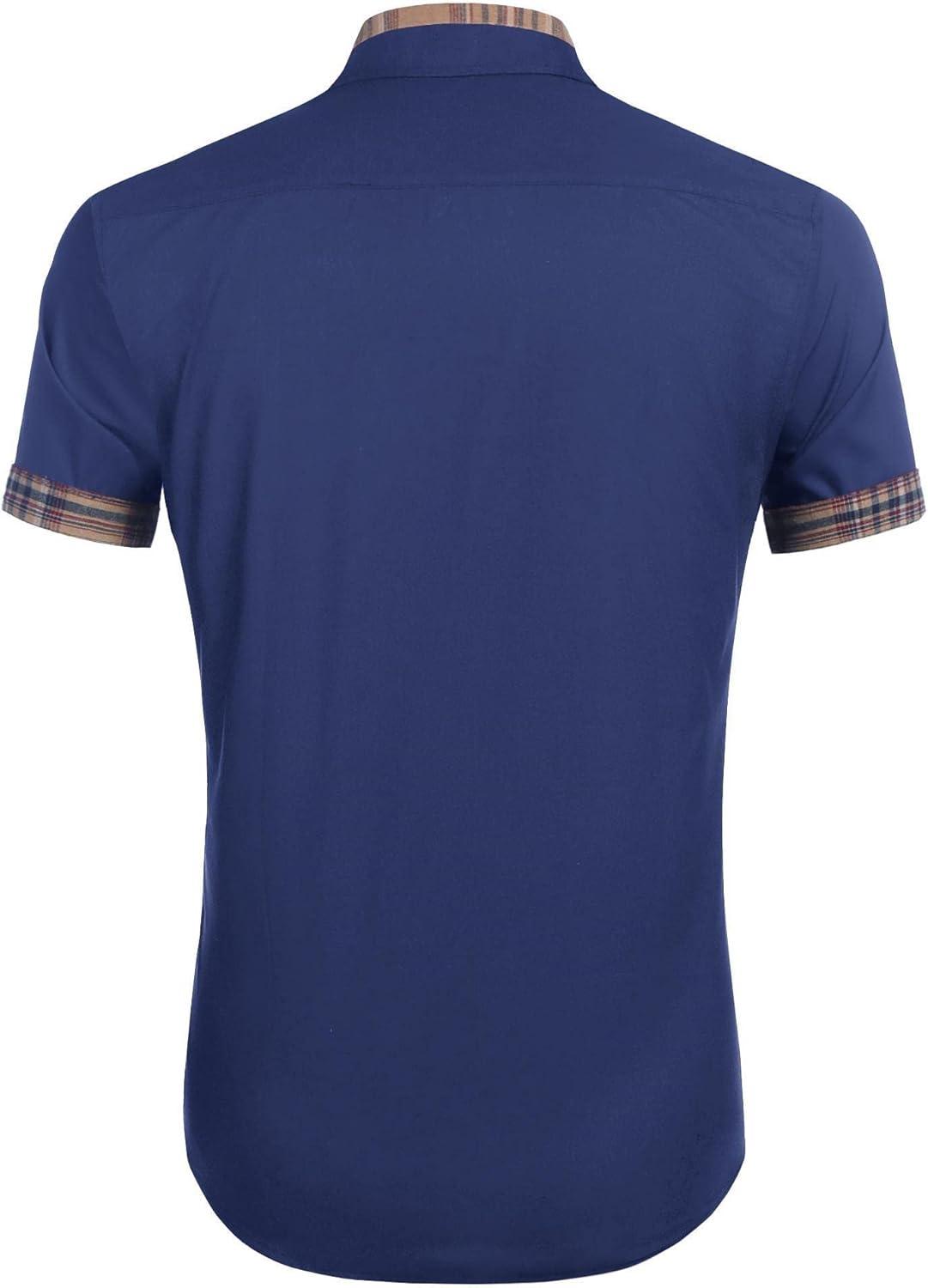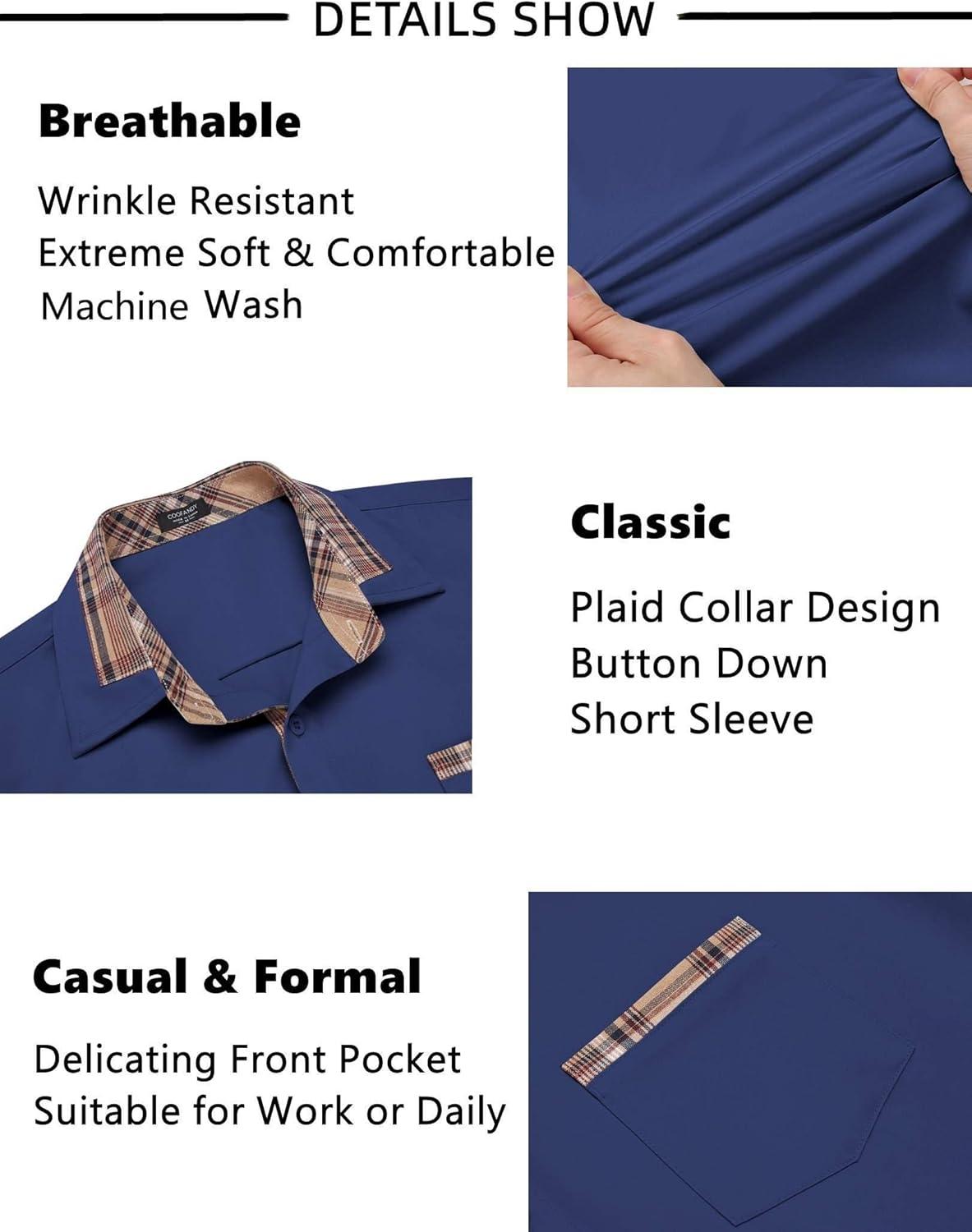 COOFANDY Mens Short Sleeve Button Down Shirts Casual Wrinkle Free Dress Shirt Plaid Collar Summer Shirts(Dark Blue)