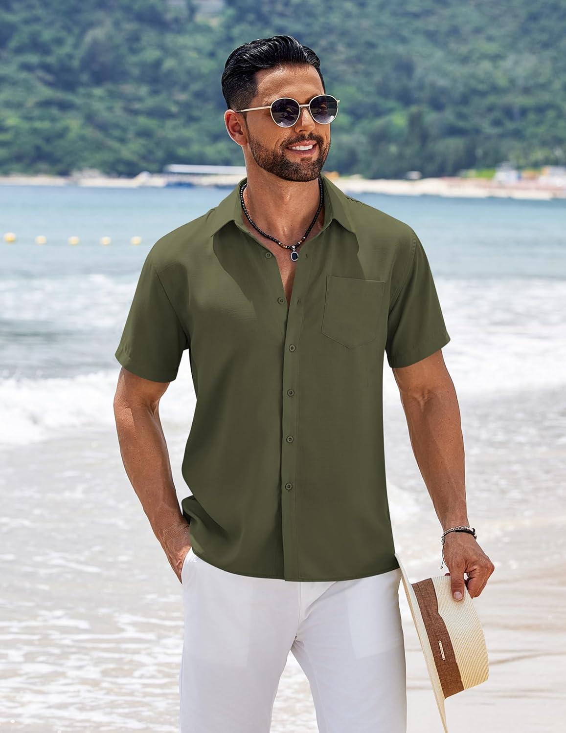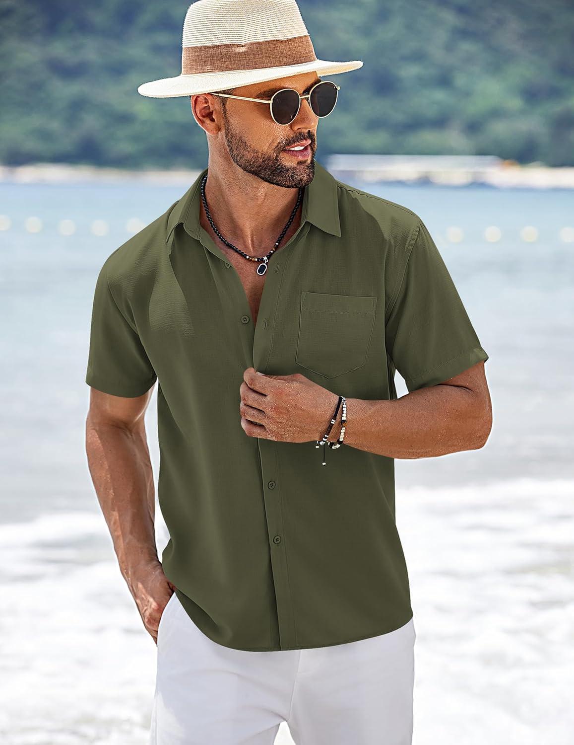 COOFANDY Men’s Short Sleeve Button Down Shirts Summer Casual Textured Shirt Vacation Beach Wedding Shirts with Pocket(Army Green)