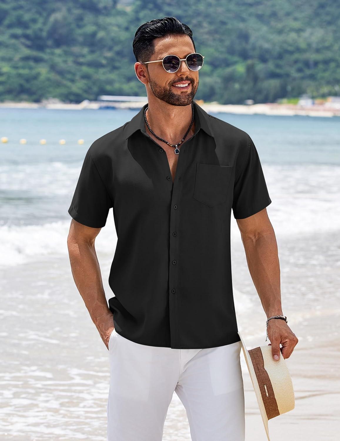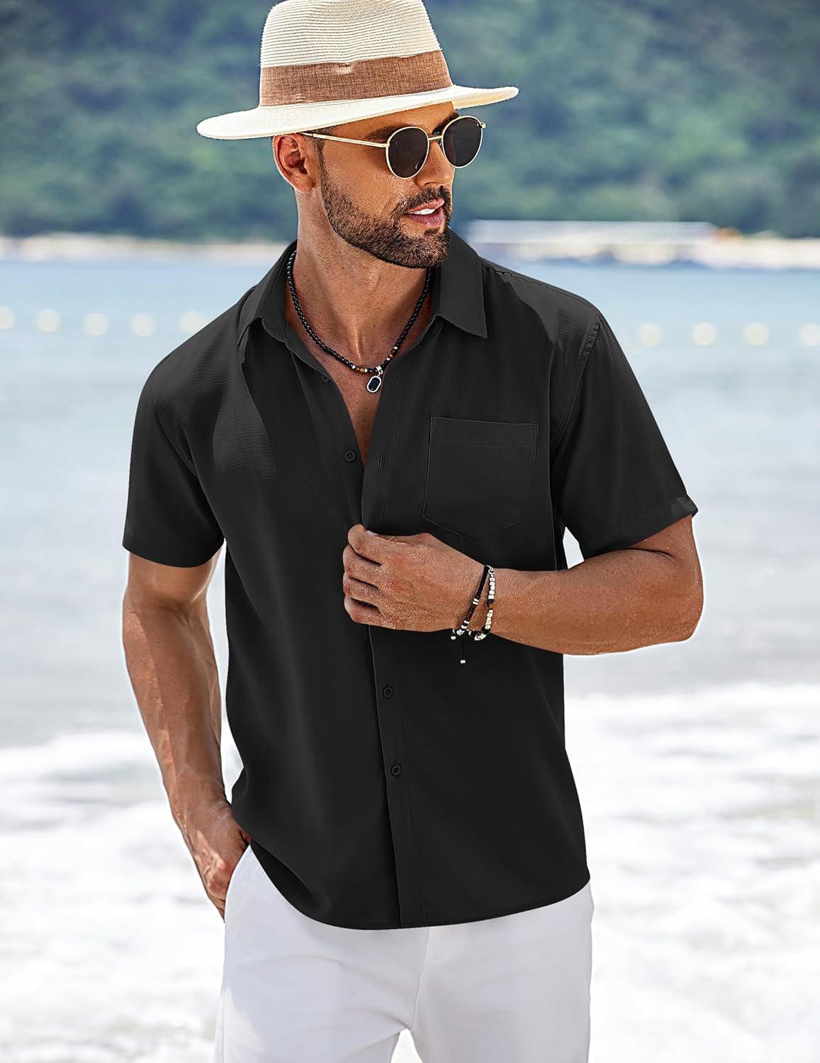 COOFANDY Men’s Short Sleeve Button Down Shirts Summer Casual Textured Shirt Vacation Beach Wedding Shirts with Pocket(Black)