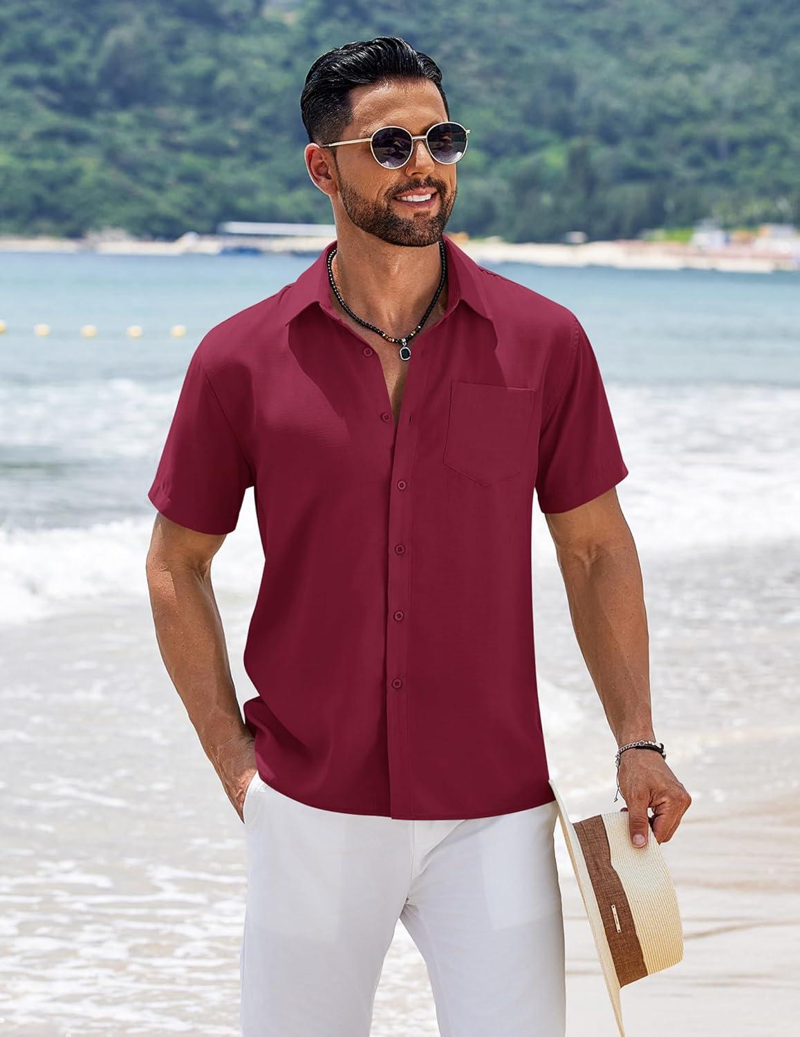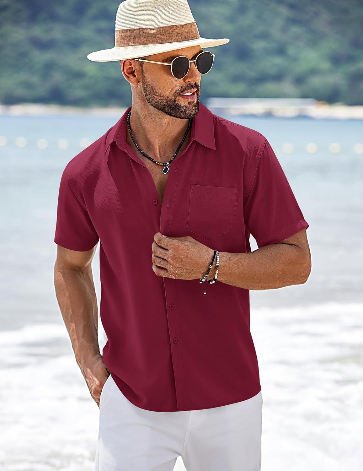 COOFANDY Men's Short Sleeve Button Down Shirts Summer Casual Textured Shirt Vacation Beach Wedding Shirts with Pocket(Burgundy)