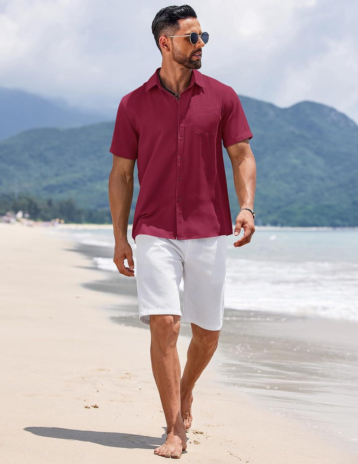 COOFANDY Men’s Short Sleeve Button Down Shirts Summer Casual Textured Shirt Vacation Beach Wedding Shirts with Pocket(Burgundy)