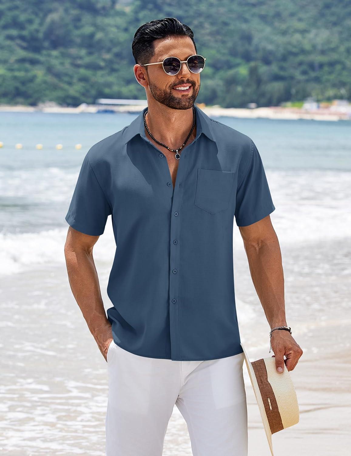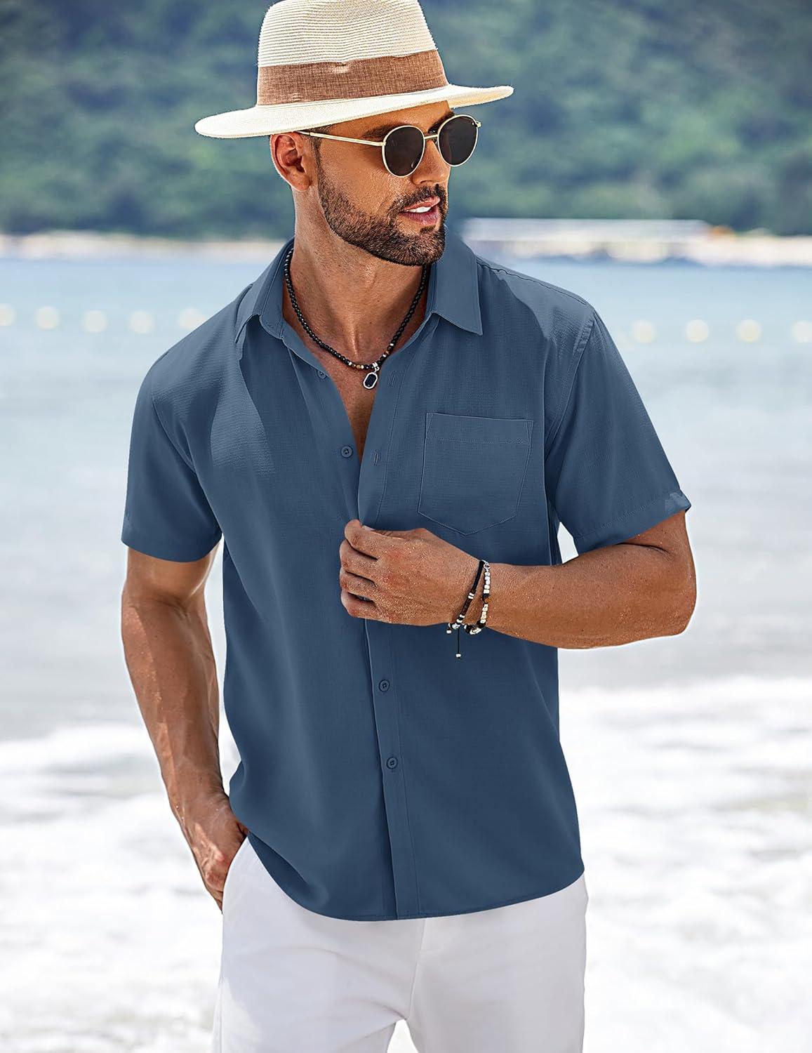 COOFANDY Men’s Short Sleeve Button Down Shirts Summer Casual Textured Shirt Vacation Beach Wedding Shirts with Pocket(Gray Blue)