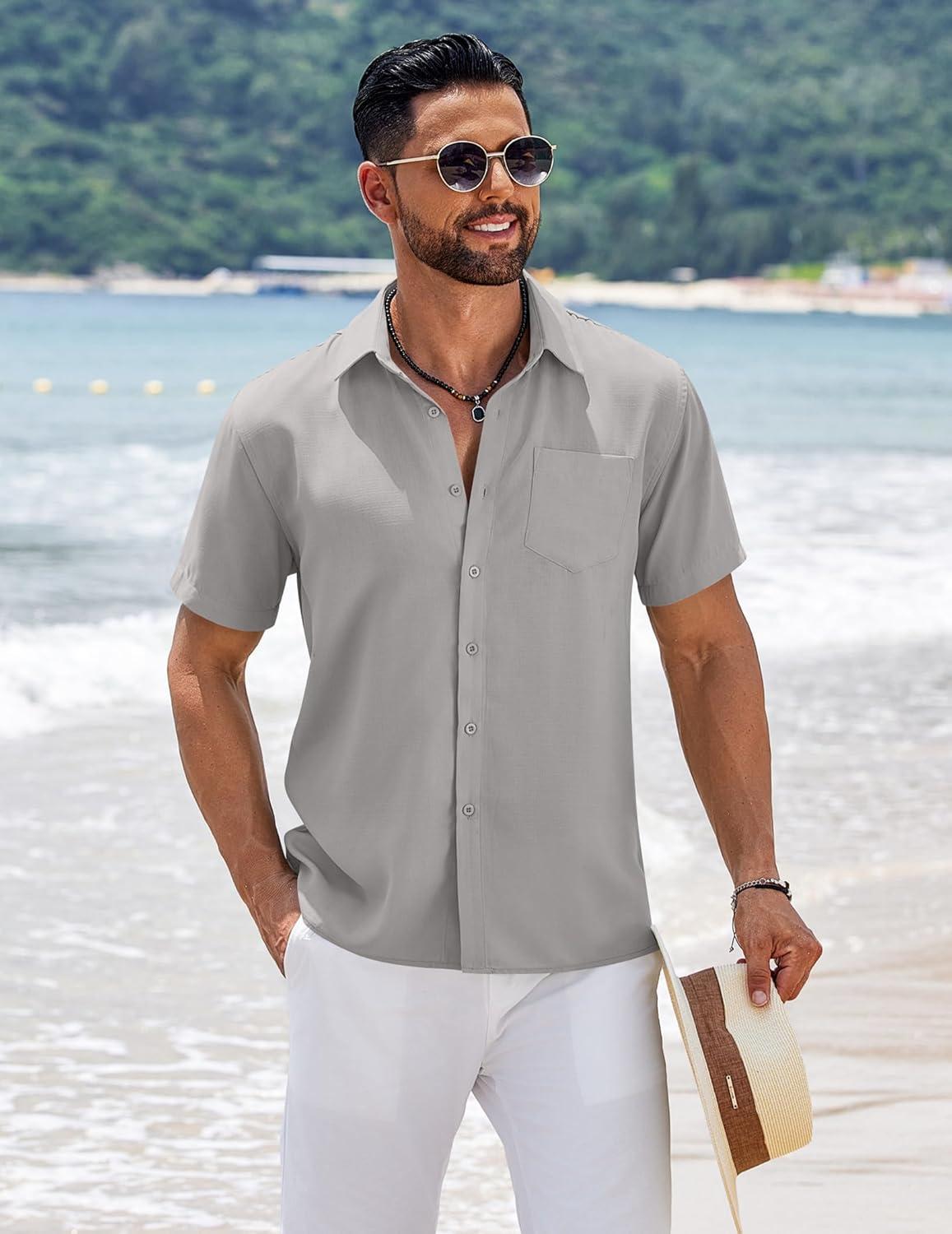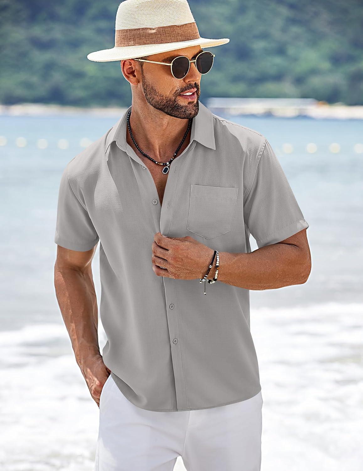 COOFANDY Men’s Short Sleeve Button Down Shirts Summer Casual Textured Shirt Vacation Beach Wedding Shirts with Pocket(Gray)