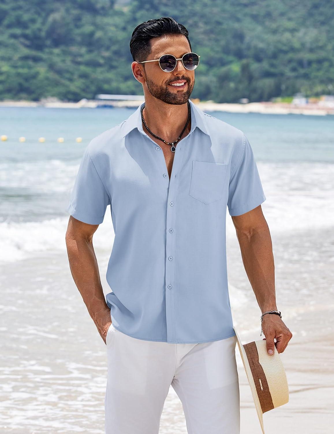 COOFANDY Men’s Short Sleeve Button Down Shirts Summer Casual Textured Shirt Vacation Beach Wedding Shirts with Pocket(Light Blue)