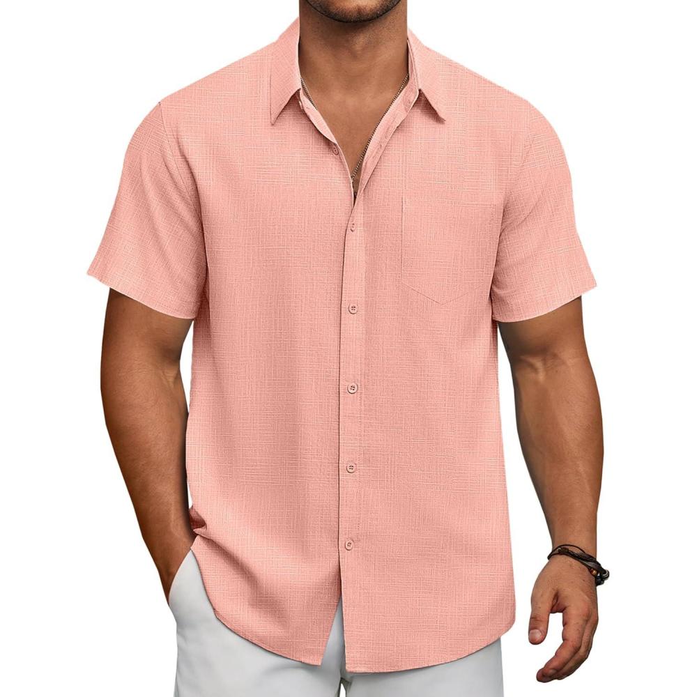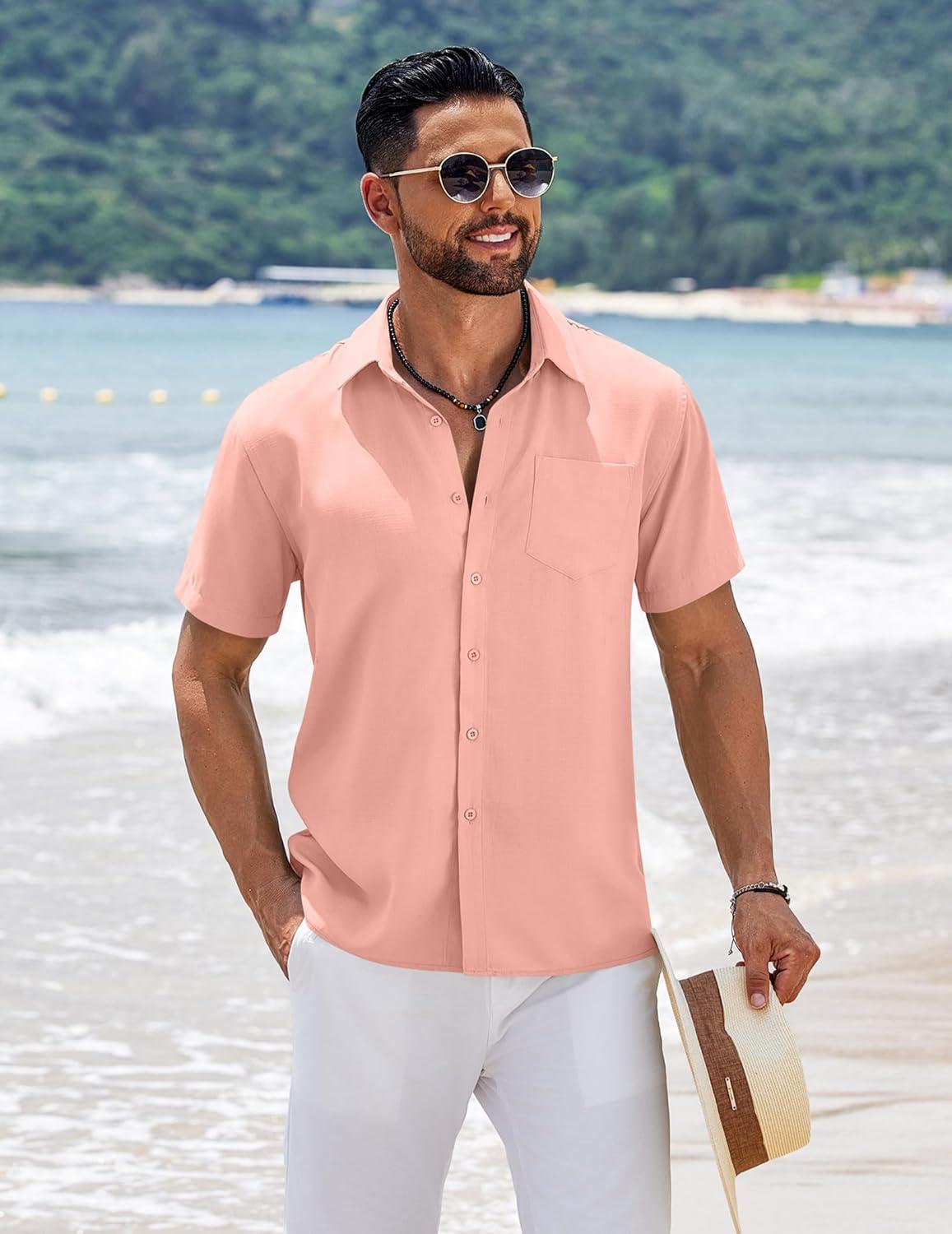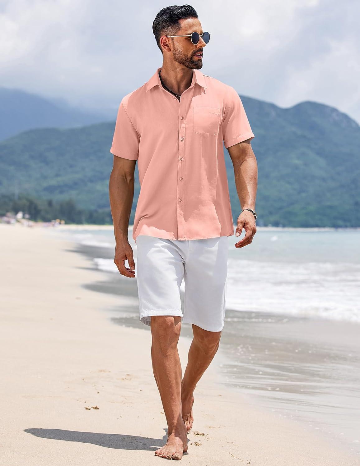 Get up to 50% off on COOFANDY Men’s Short Sleeve Button Down Shirts Summer Casual Textured Shirt Vacation Beach Wedding Shirts with Pocket(Pink) styles during our spring sale event.