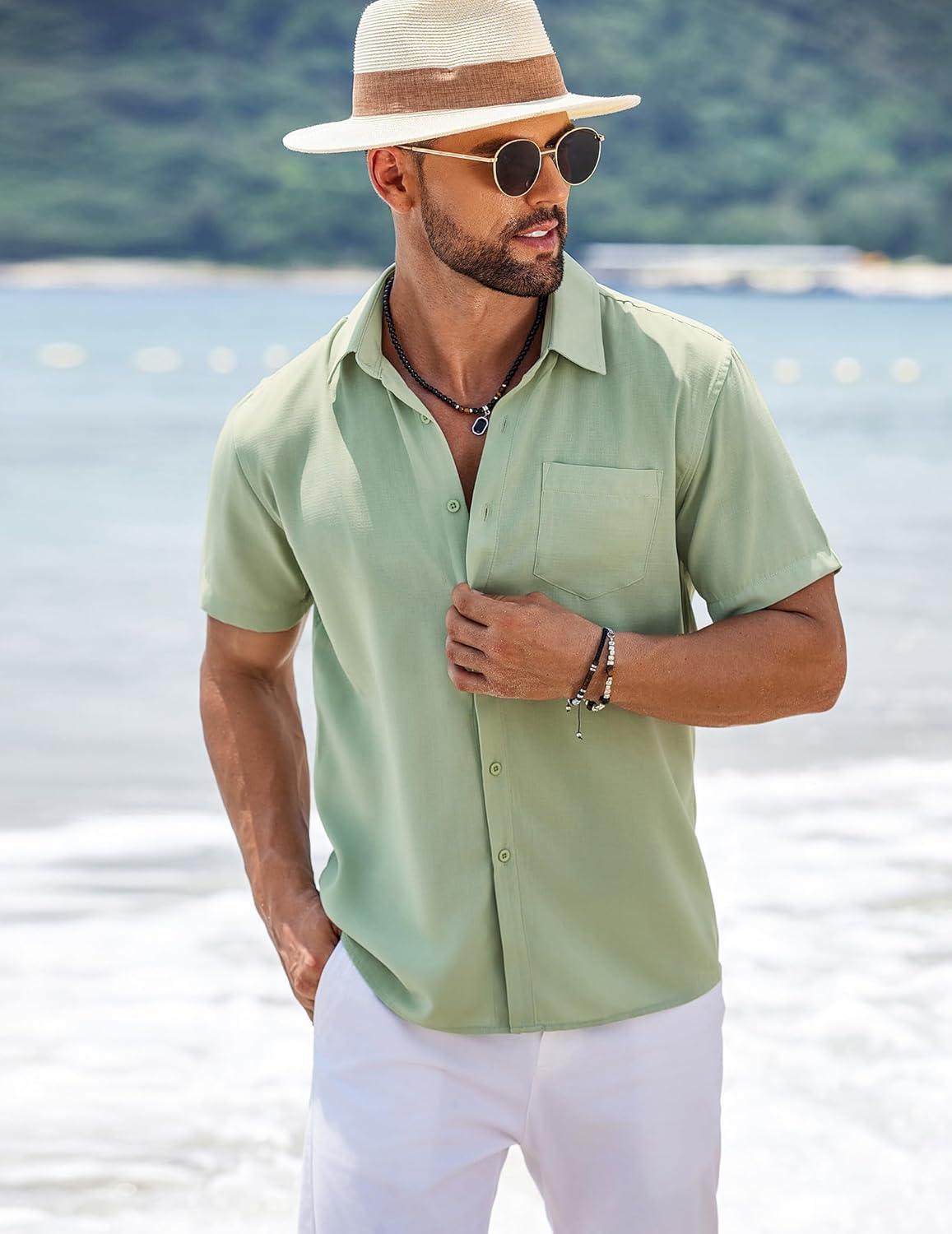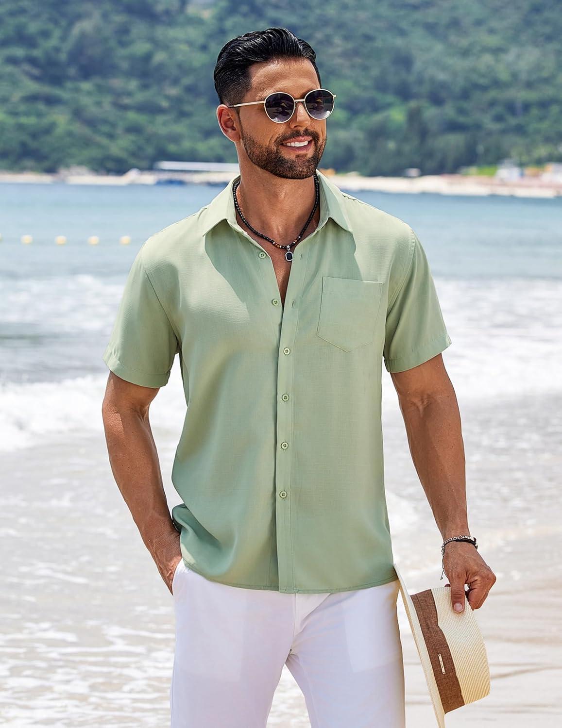 COOFANDY Men’s Short Sleeve Button Down Shirts Summer Casual Textured Shirt Vacation Beach Wedding Shirts with Pocket(Sage Green)