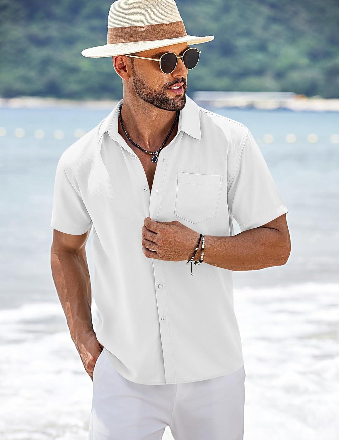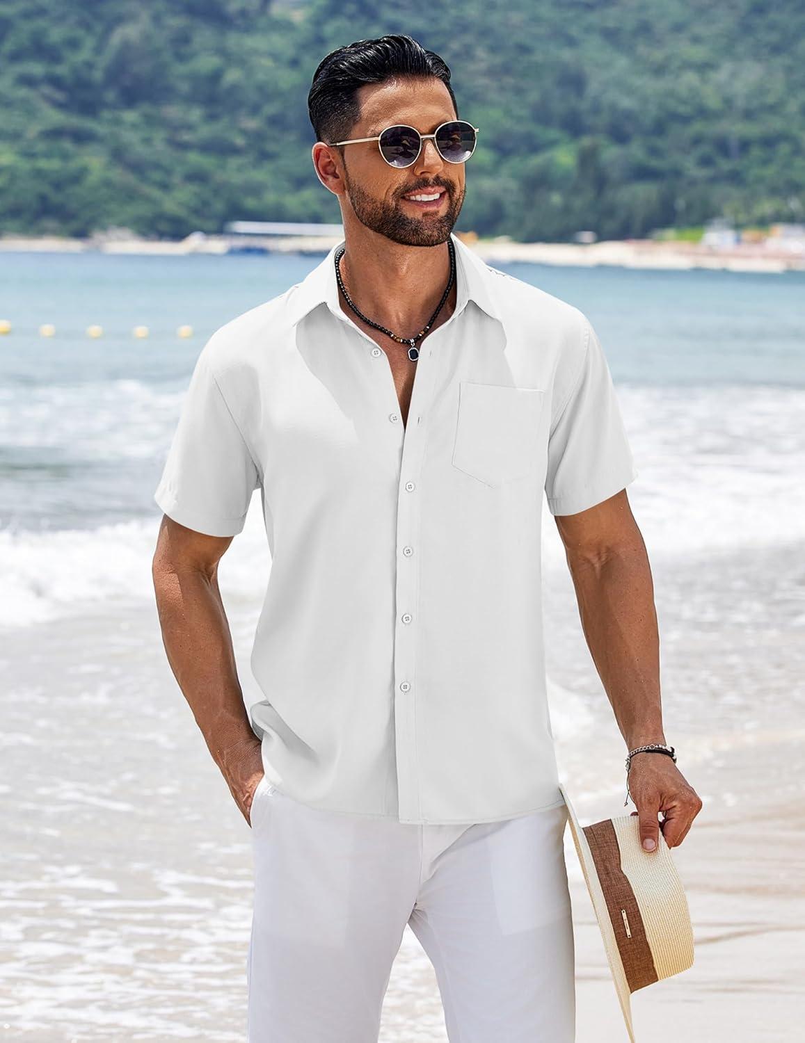 COOFANDY Men’s Short Sleeve Button Down Shirts Summer Casual Textured Shirt Vacation Beach Wedding Shirts with Pocket(White)