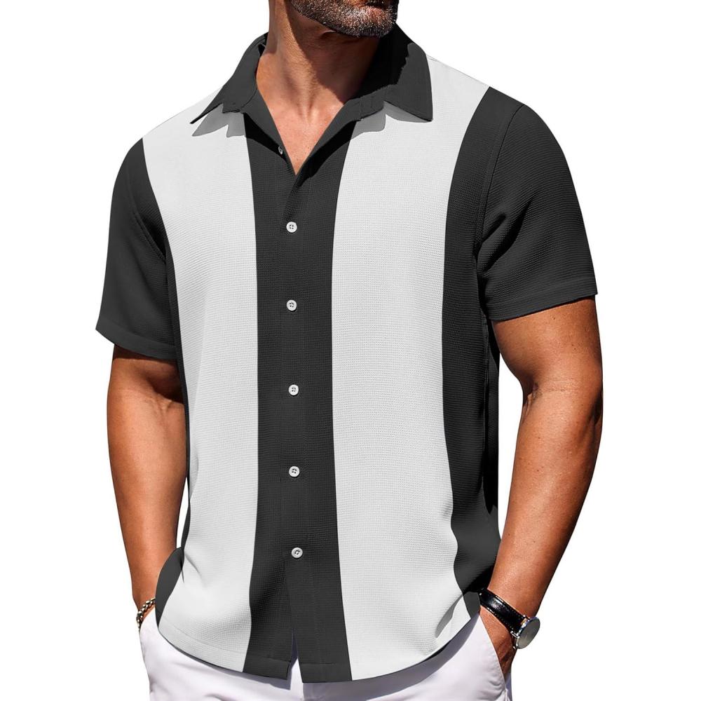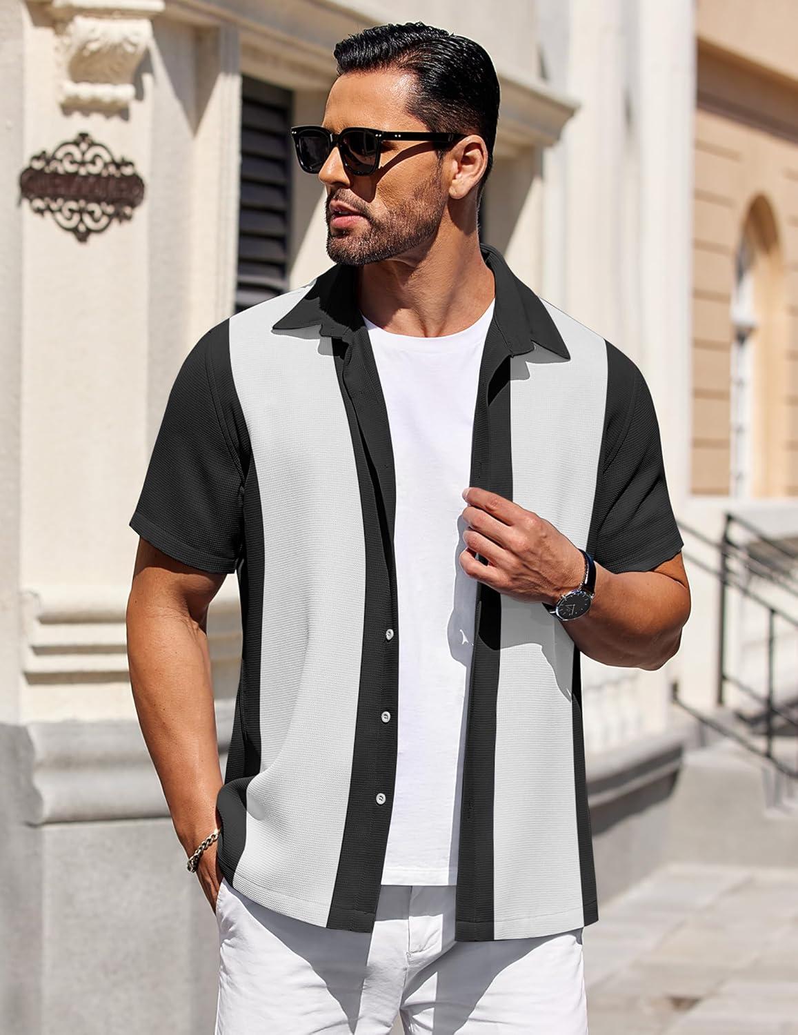 COOFANDY Mens Short Sleeve Button Down Shirts Waffle Shirt Casual Beach Summer Shirts Wrinkle Free Vacation Shirts(Black White)