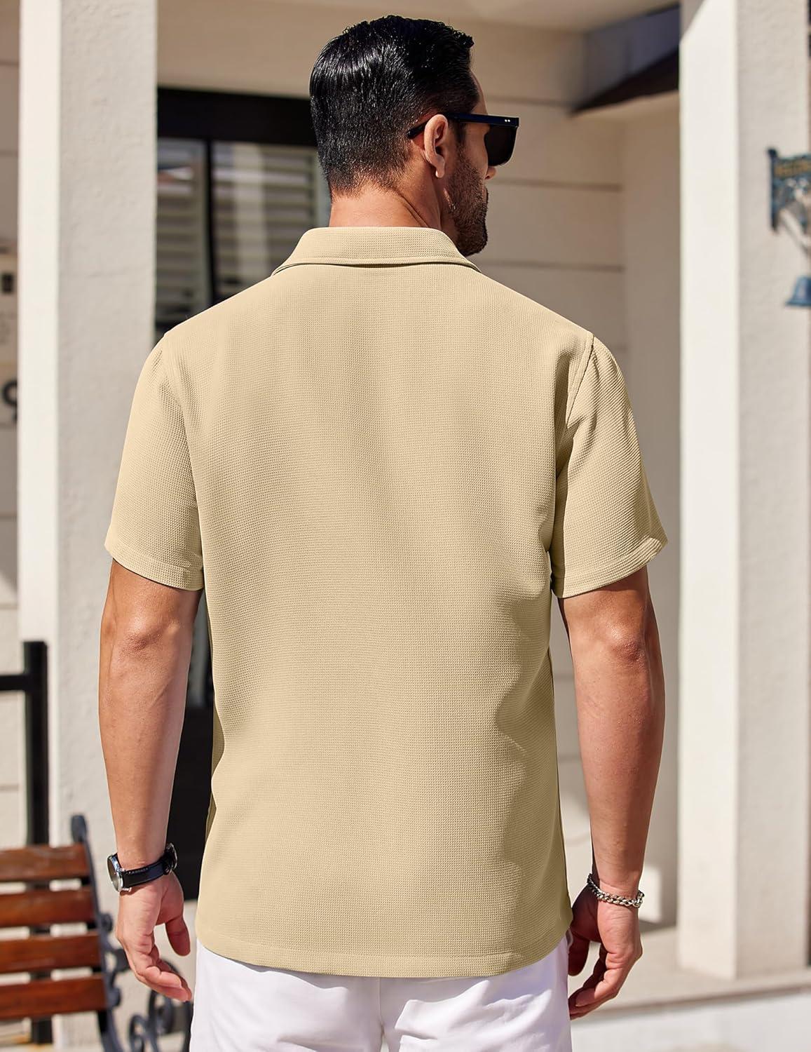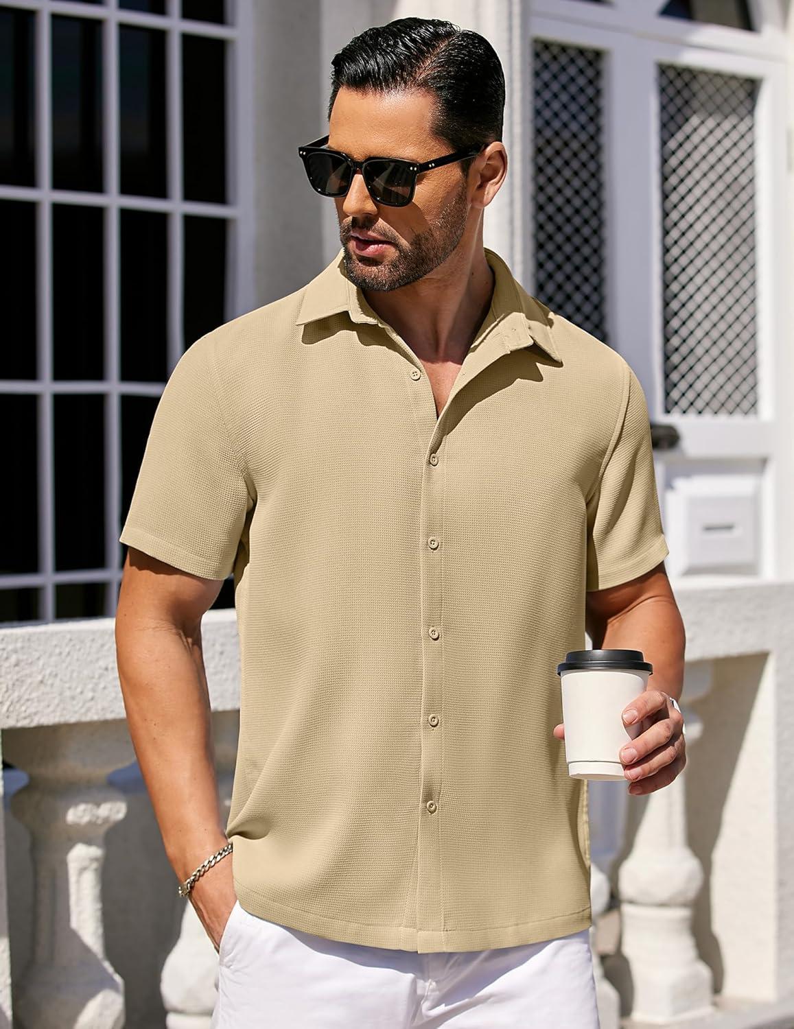 COOFANDY Mens Short Sleeve Button Down Shirts Waffle Shirt Casual Beach Summer Shirts Wrinkle Free Vacation Shirts(Khaki)