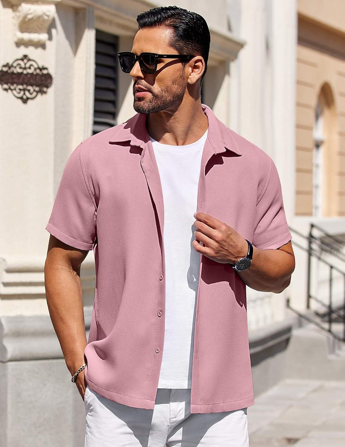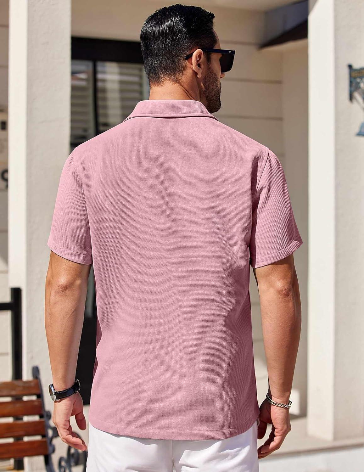 COOFANDY Mens Short Sleeve Button Down Shirts Waffle Shirt Casual Beach Summer Shirts Wrinkle Free Vacation Shirts(Pink)