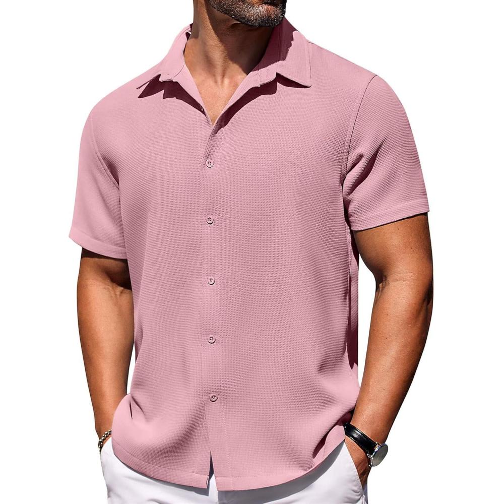 imageCOOFANDY Mens Short Sleeve Button Down Shirts Waffle Shirt Casual Beach Summer Shirts Wrinkle Free Vacation ShirtsPink