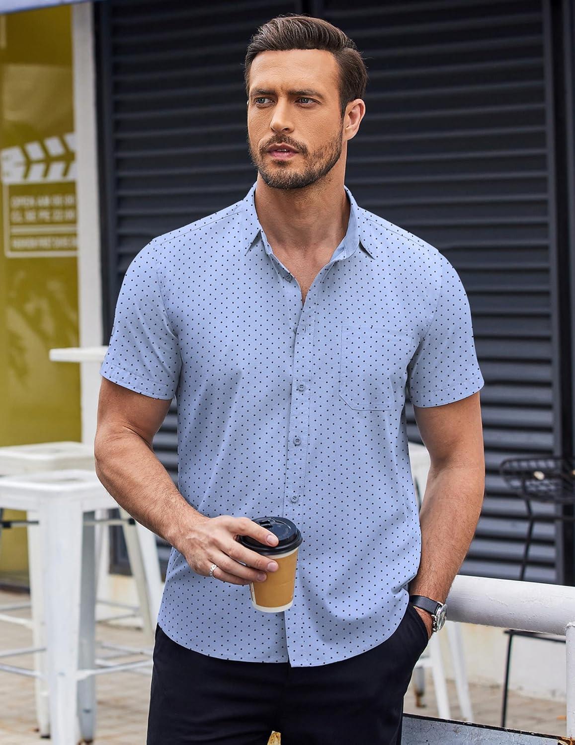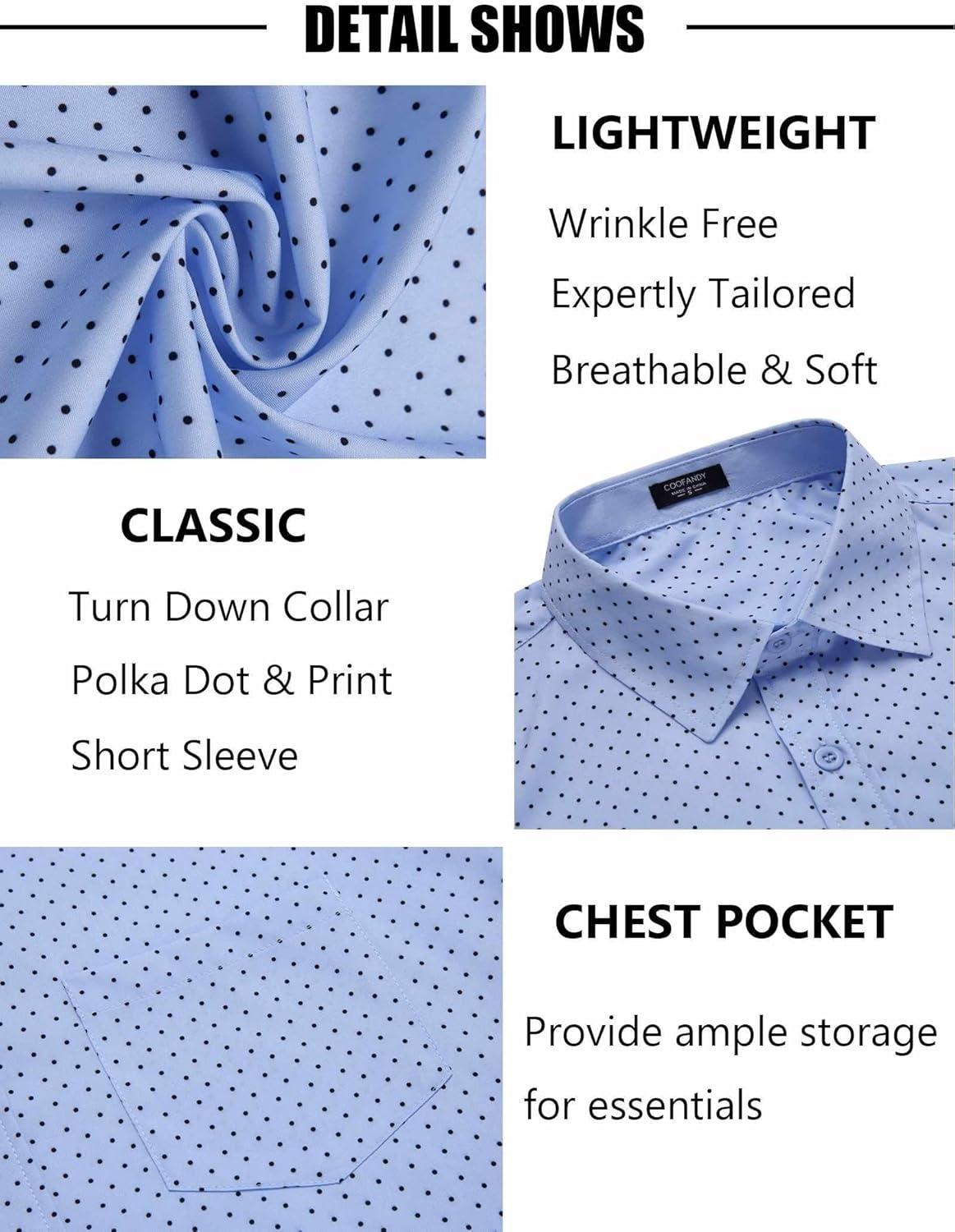 Get a free gift with your purchase of COOFANDY Mens Short Sleeve Button Down Shirts Wrinkle Free Dress Shirts Casual Polka Dot Print Shirt with Pocket(Clear Blue). Limited quantities available!