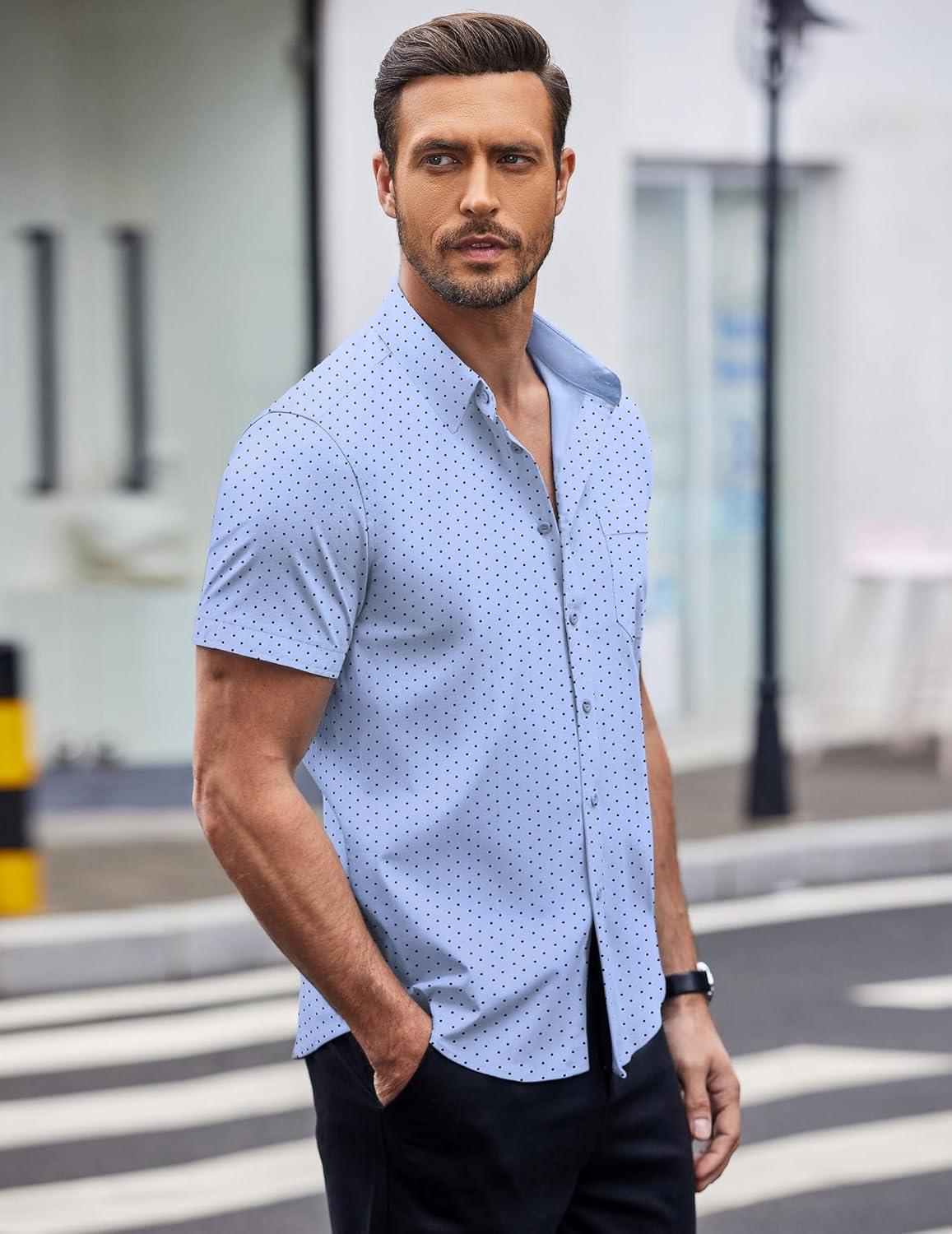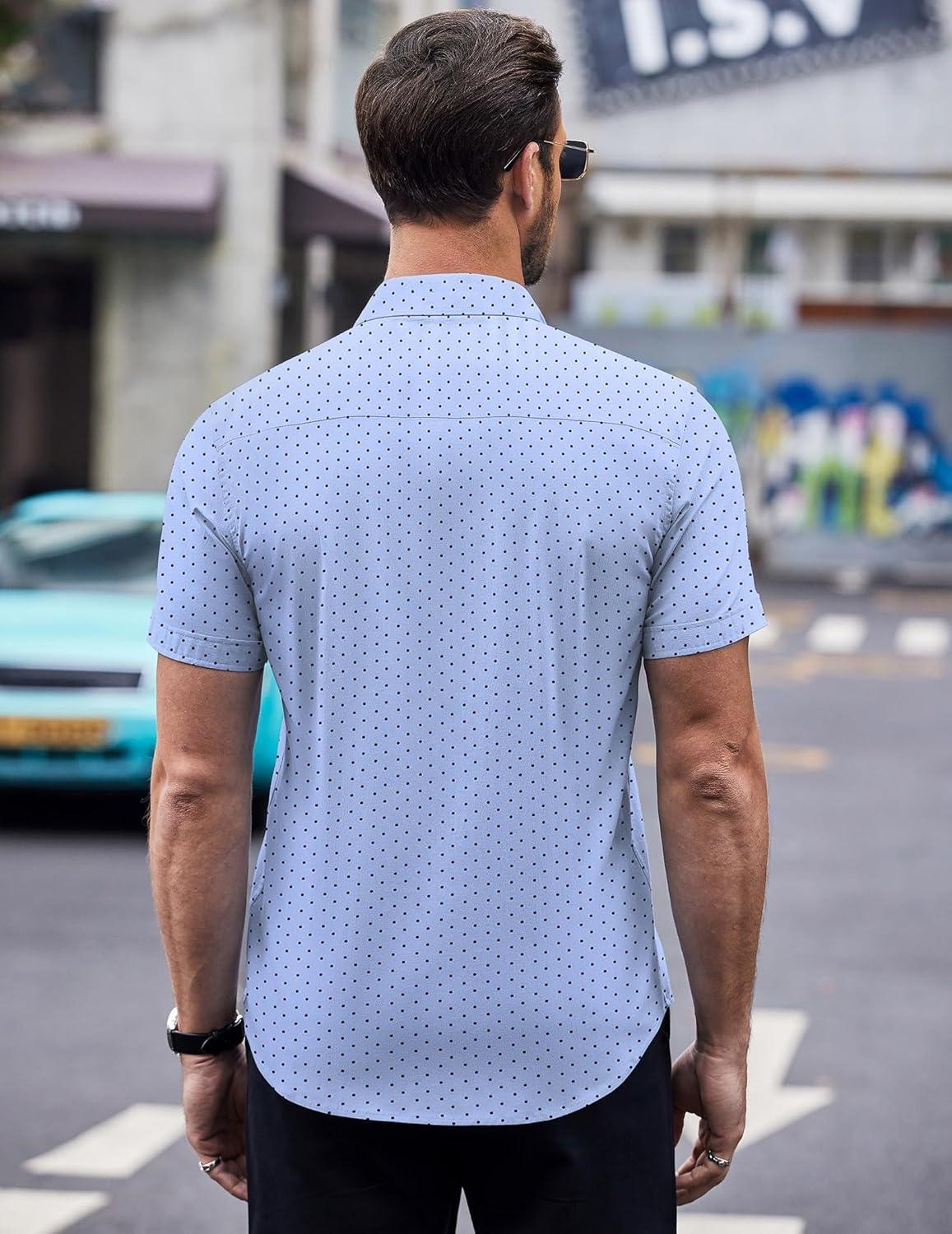 COOFANDY Mens Short Sleeve Button Down Shirts Wrinkle Free Dress Shirts Casual Polka Dot Print Shirt with Pocket(Clear Blue)