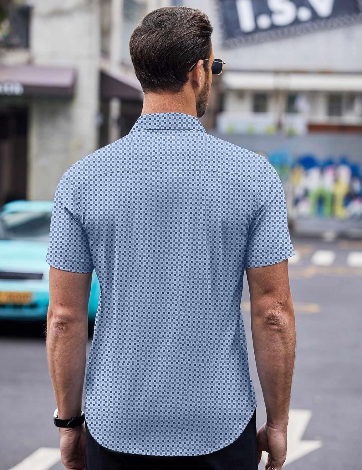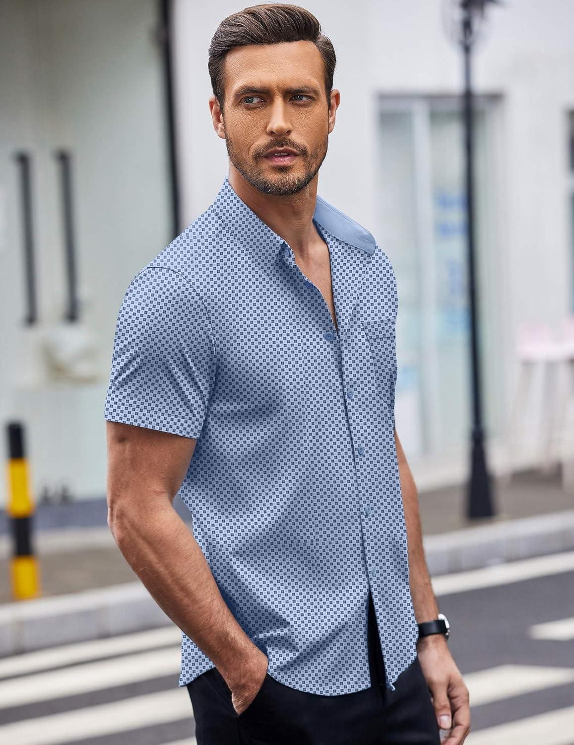 COOFANDY Mens Short Sleeve Button Down Shirts Wrinkle Free Dress Shirts Casual Polka Dot Print Shirt with Pocket(Light Blue(windmill))