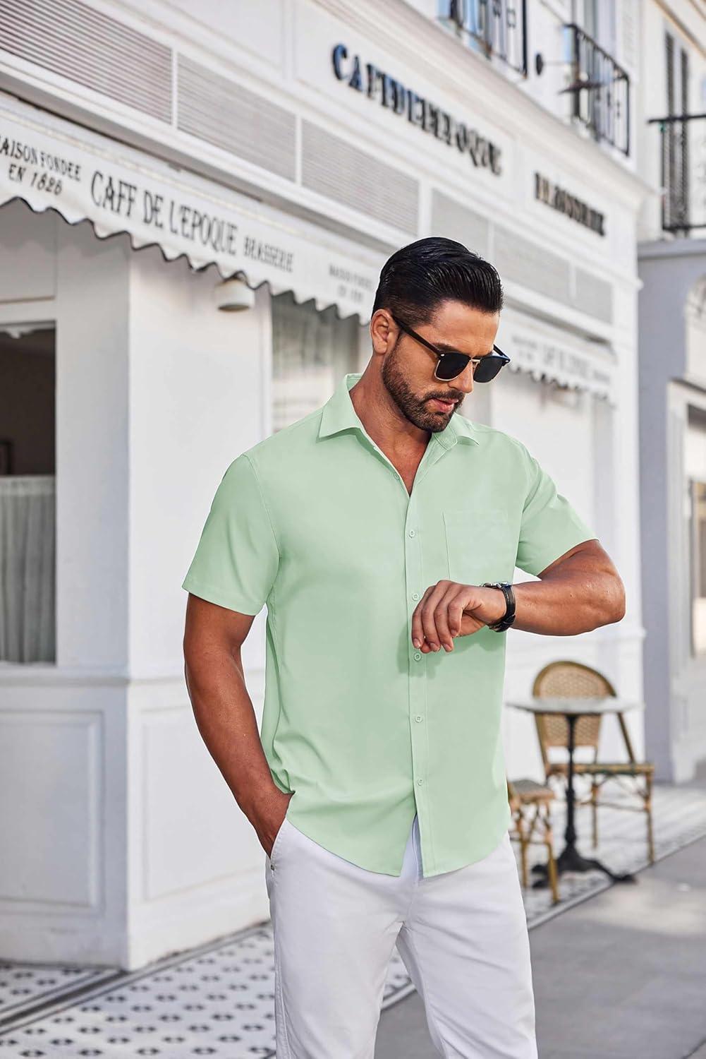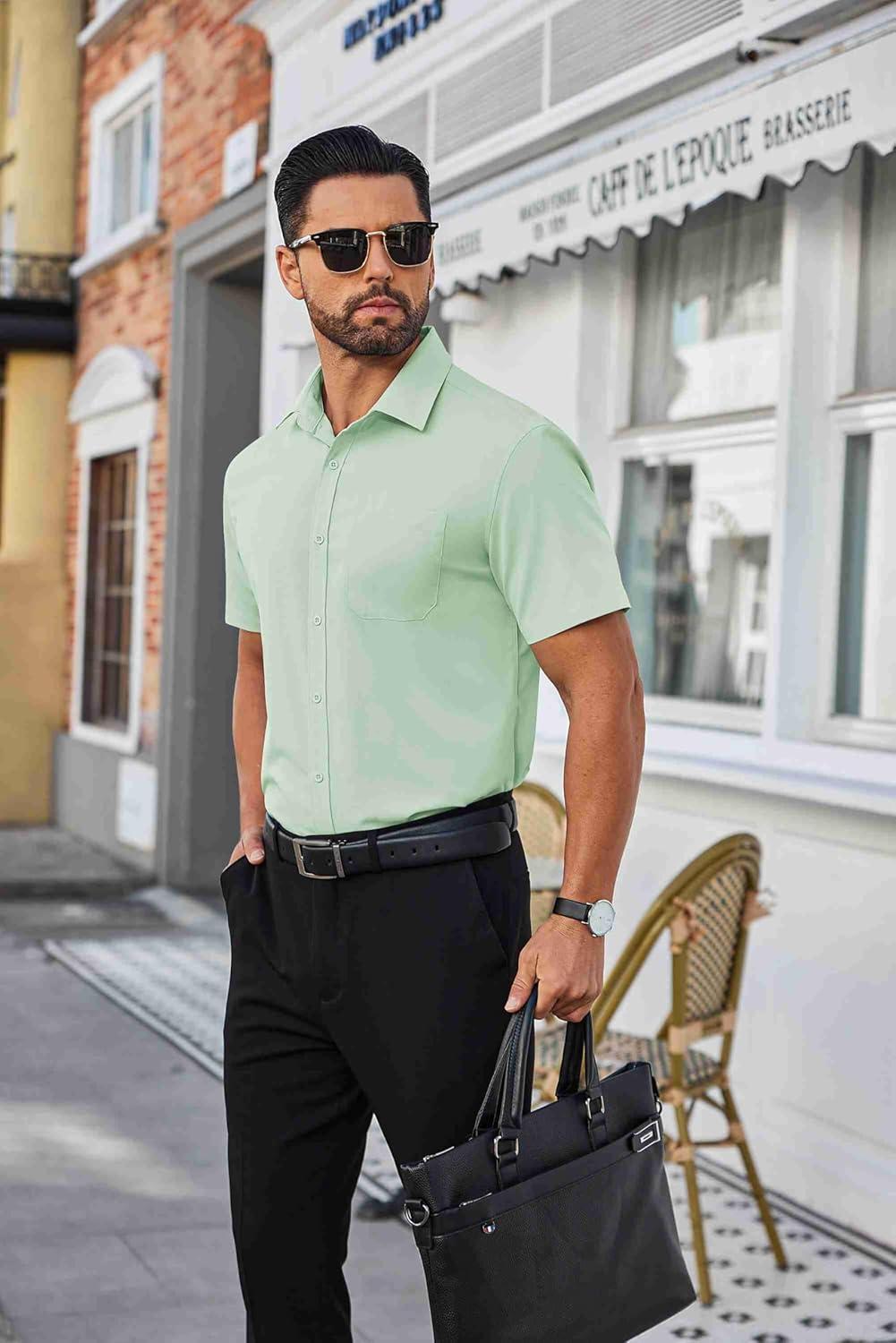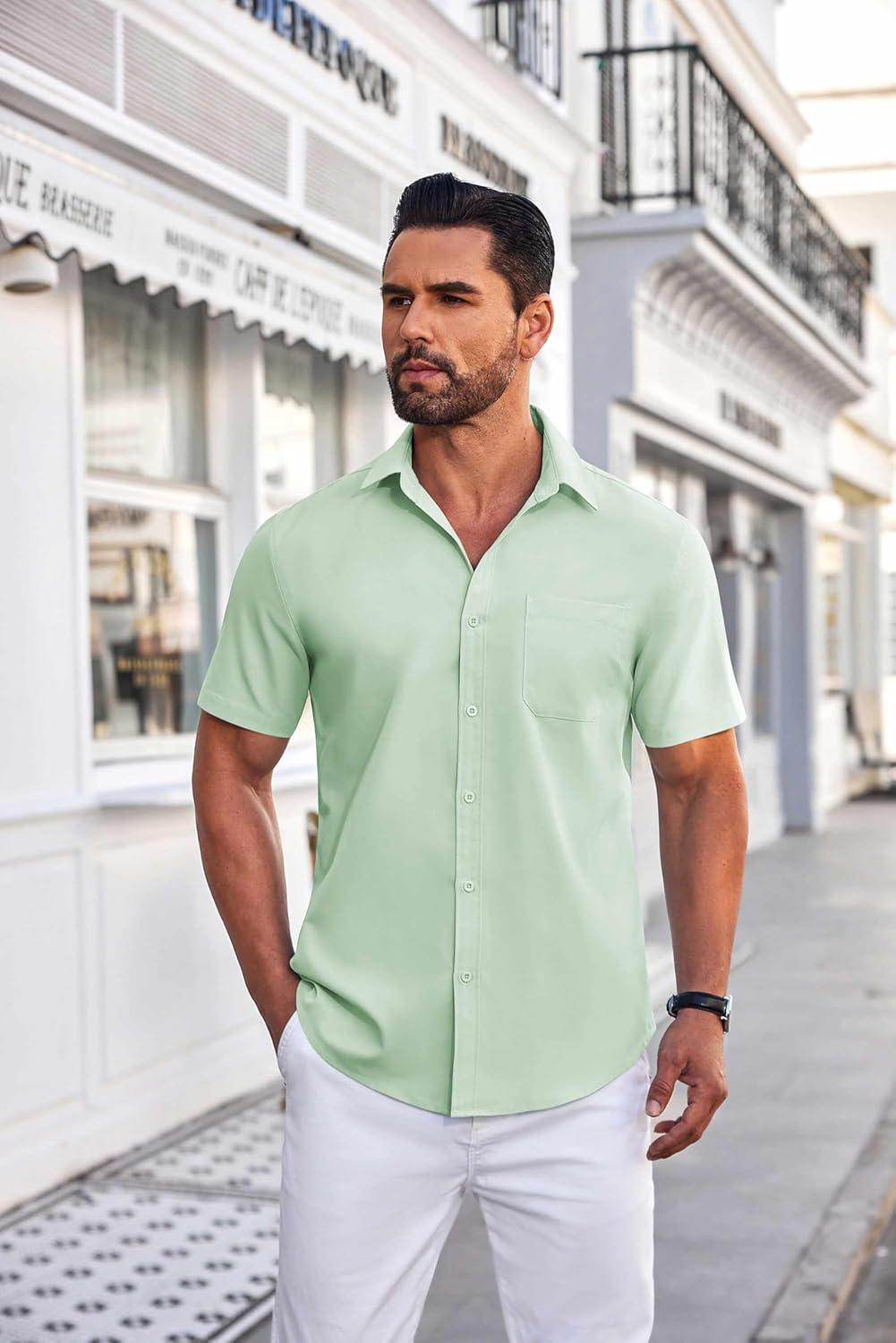 COOFANDY Mens Short Sleeve Button Down Shirts Wrinkle Free Dress Shirts Casual Polka Dot Print Shirt with Pocket(Light Green)