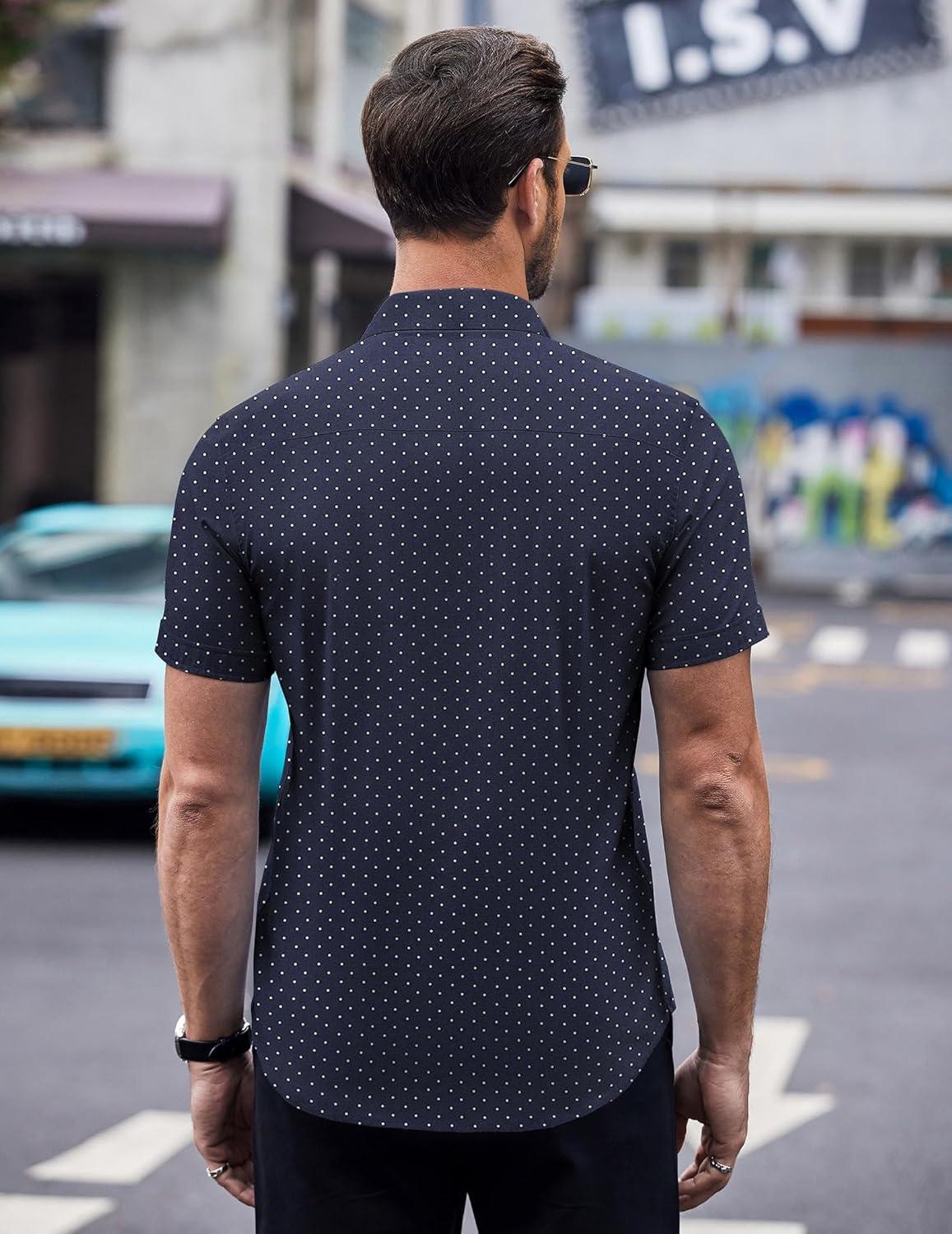COOFANDY Mens Short Sleeve Button Down Shirts Wrinkle Free Dress Shirts Casual Polka Dot Print Shirt with Pocket(Navy Blue)